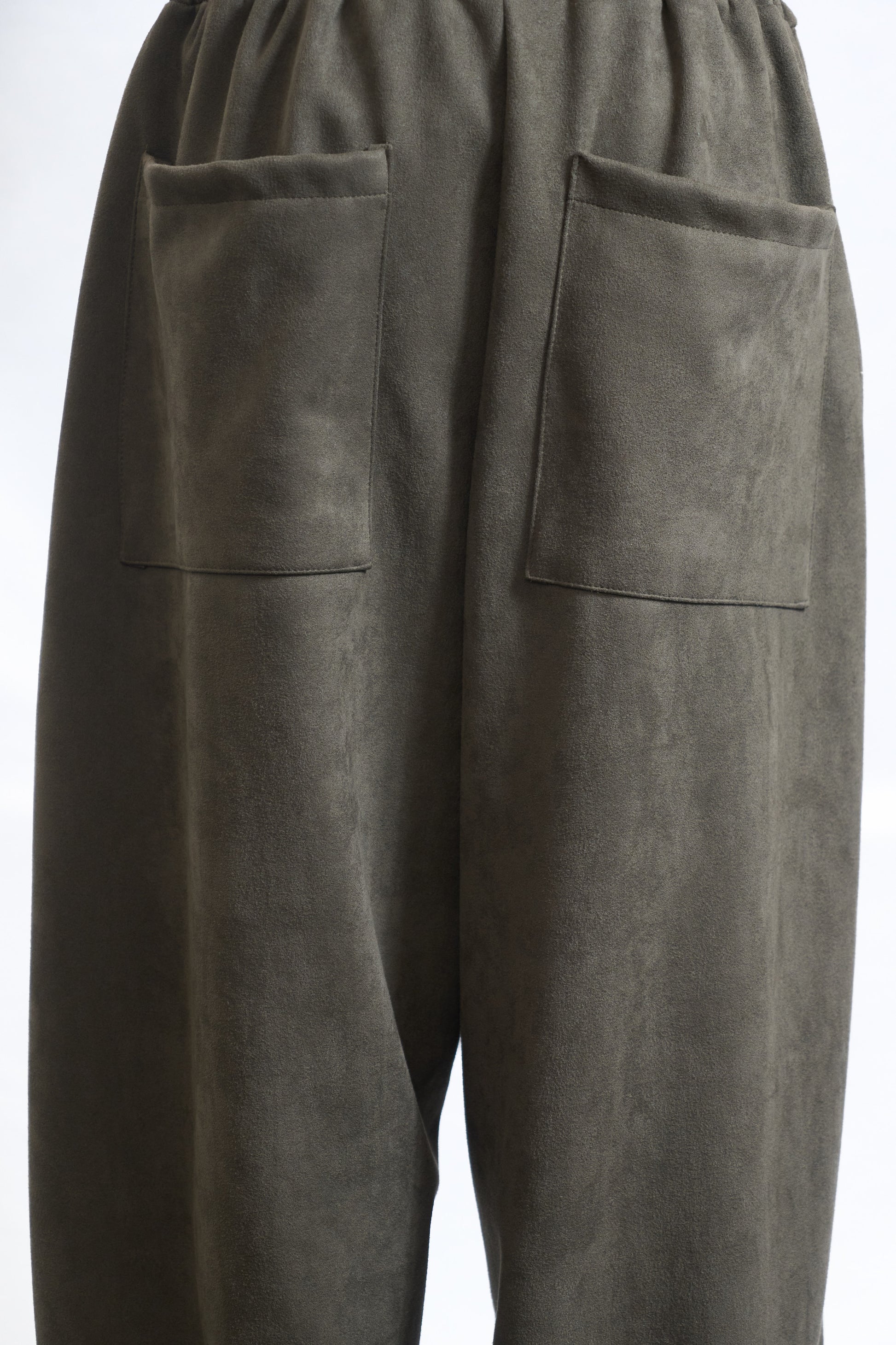 Soft structure with minimal detail. Cut from a fabric with a suede-like texture, these pants drape with ease in a clean, relaxed silhouette. Finished with a gathered waistband and large patch pockets, they blend utilitarian comfort with understated polish. A quiet piece — tactile, timeless, and built for effortless wear.