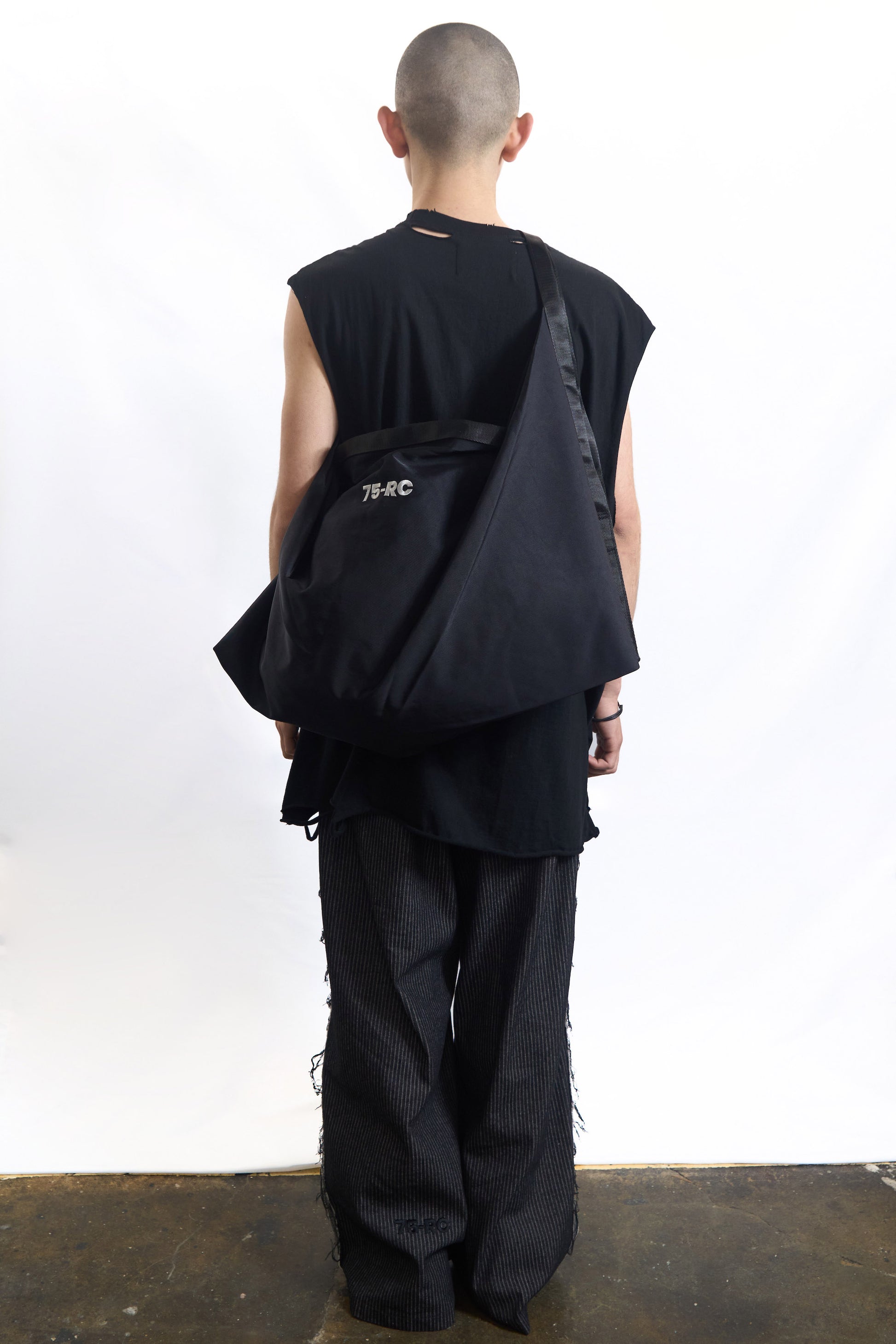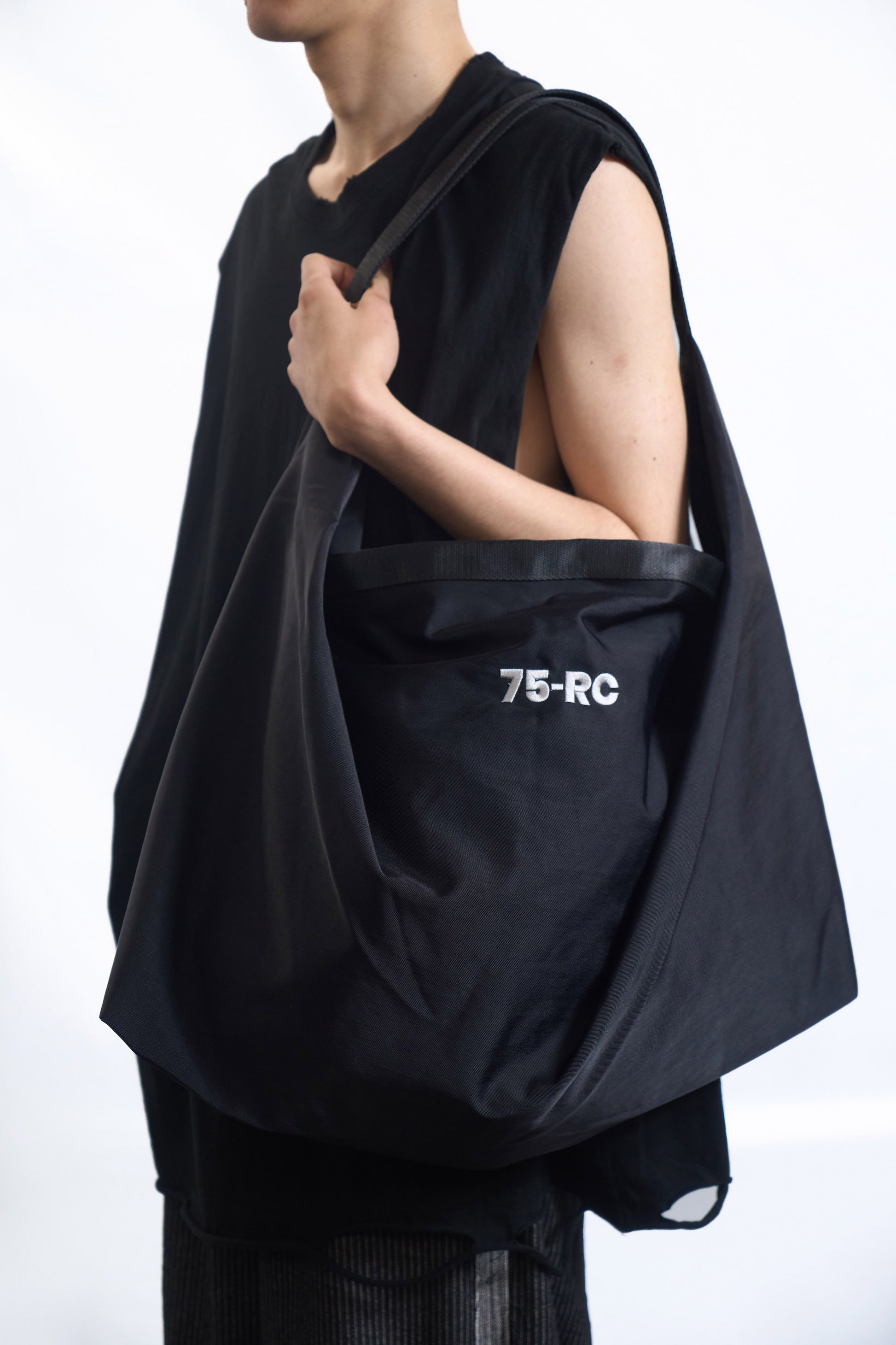 A generously-sized carry-all made from durable black nylon, designed with a long single strap that allows for both shoulder or crossbody wear. Features a minimal 75-RC embroidery on the front and a soft, collapsible structure that adjusts to your day — whether you're packing light or carrying everything.