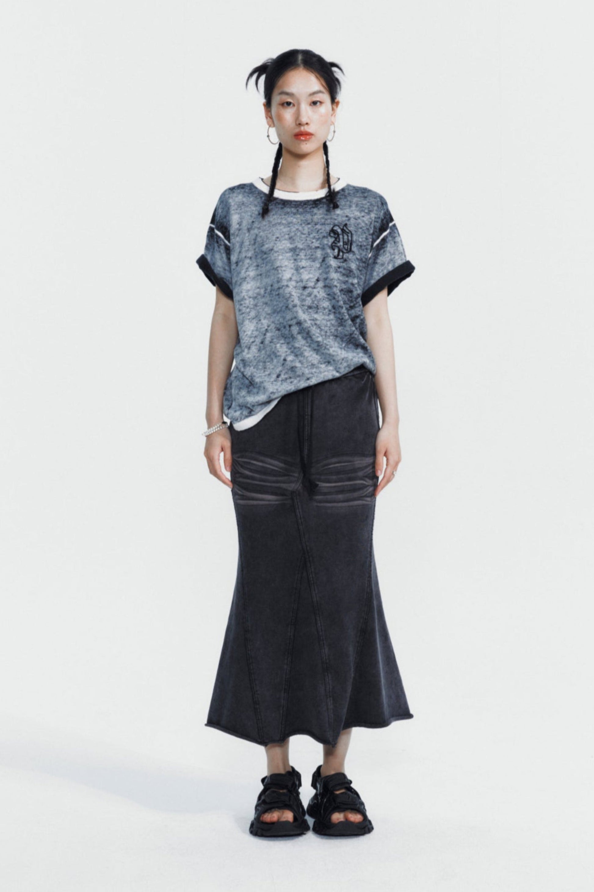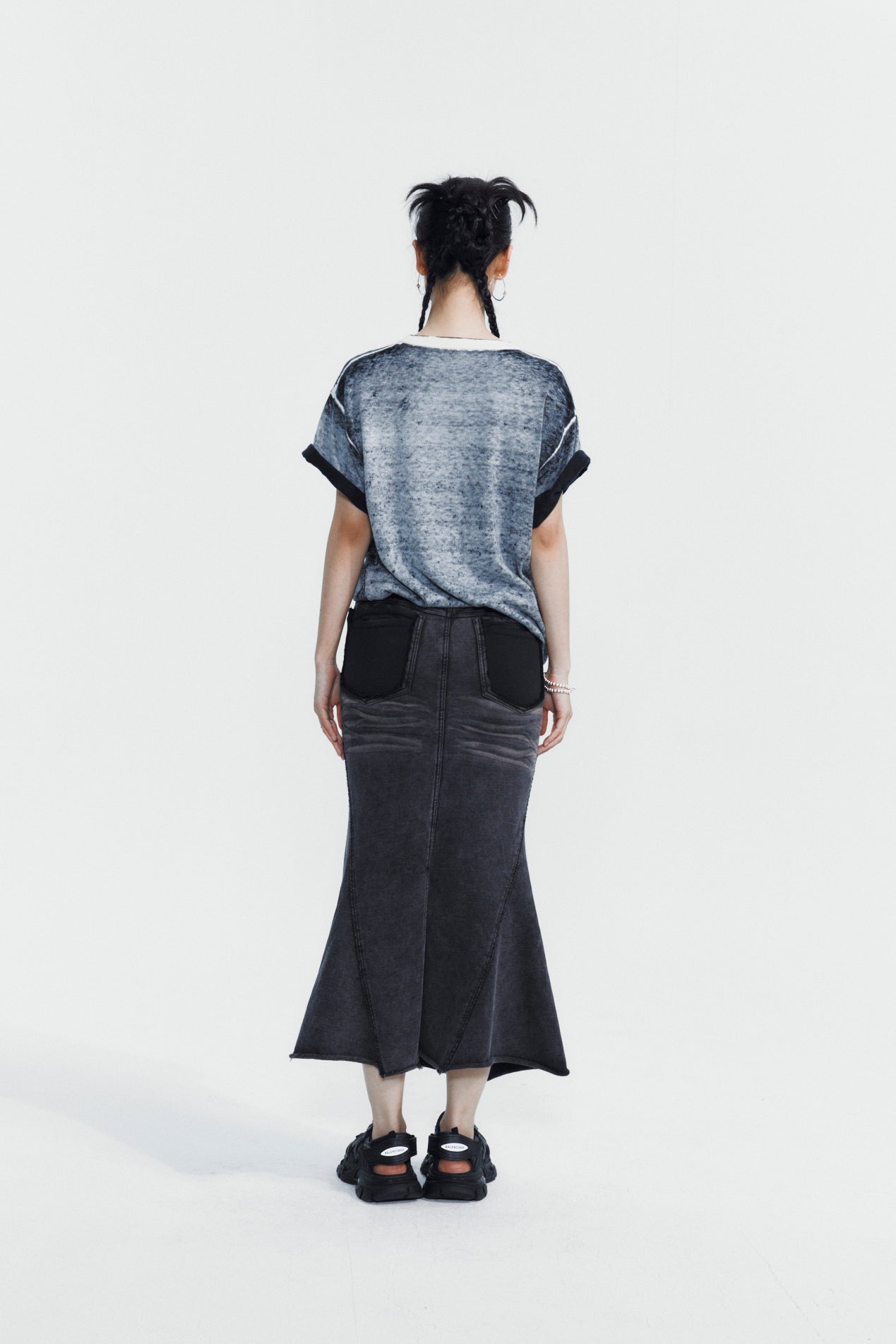 The raw edge, curved mermaid silhouette flatters the body line and pairs effortlessly with both casual and edgy looks in all seasons.