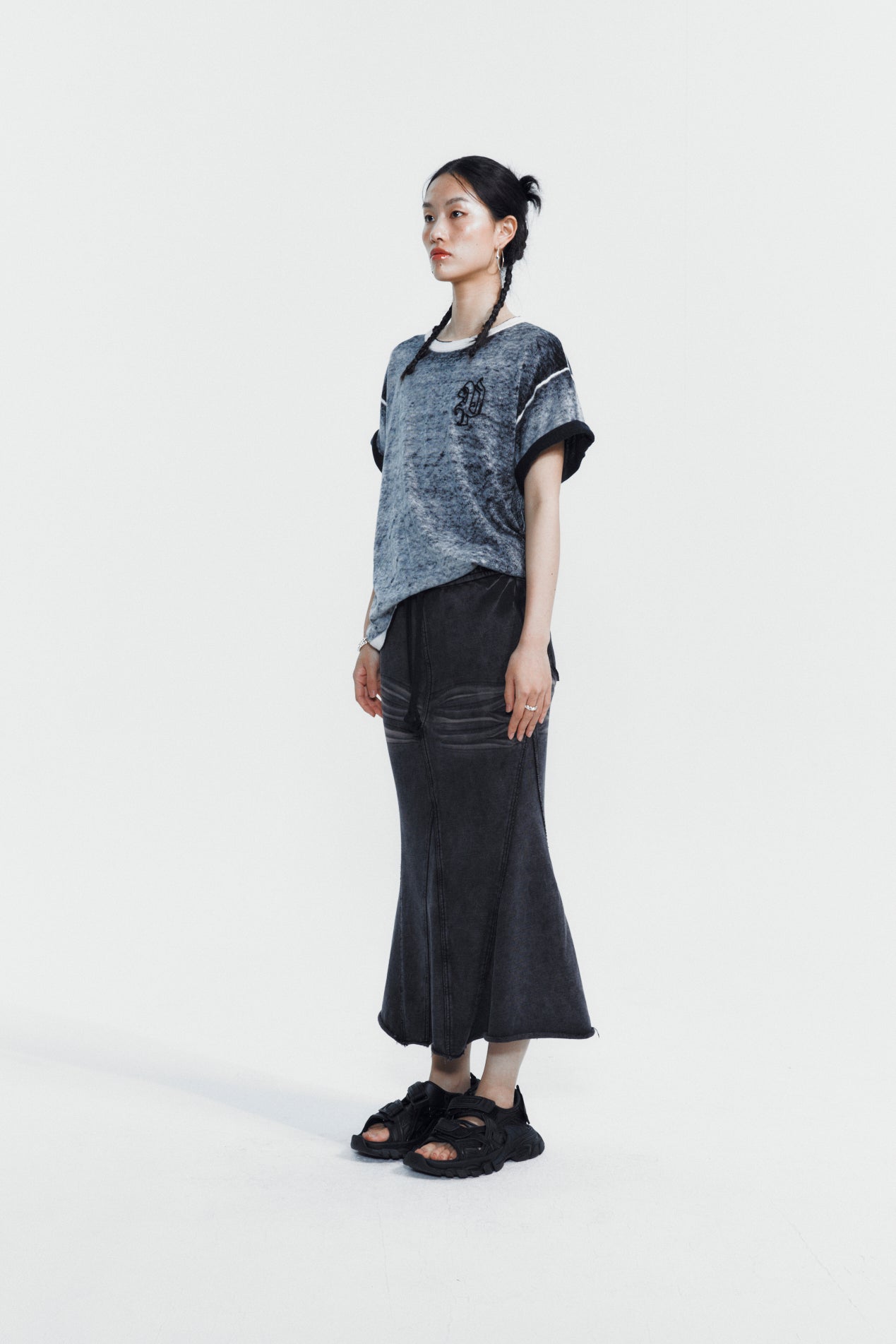 Crafted from 100% 360g cotton twill, this skirt is designed to resist distortion while maintaining its shape over time. The acid-washed finish and faded texture create a vintage-inspired mood throughout the entire piece—including the waist drawstring.