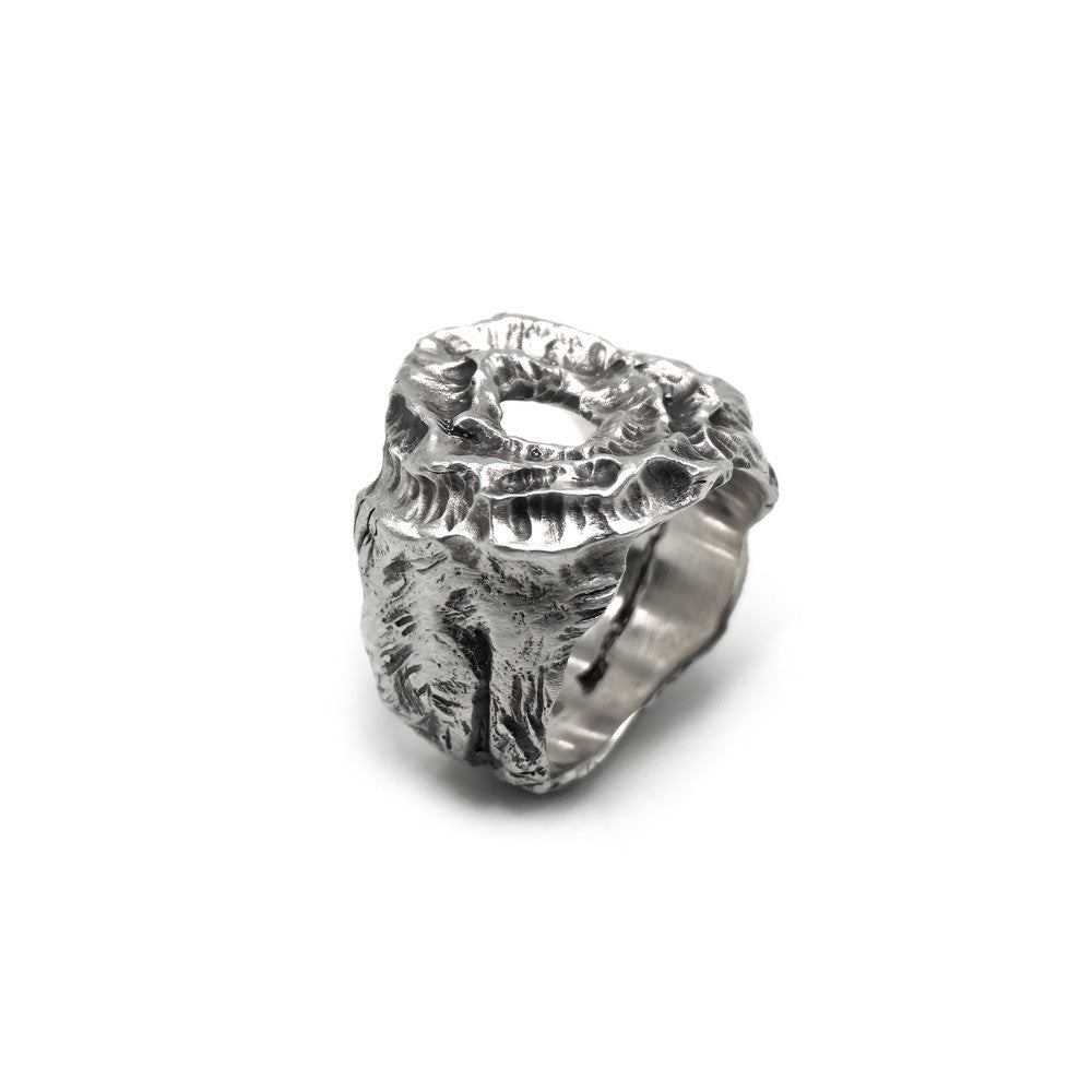 A ring inspired by Jeju Island, with stone carved into petal shapes resembling camellia flowers. The natural grain along the petal lines adds a tactile, organic feel.