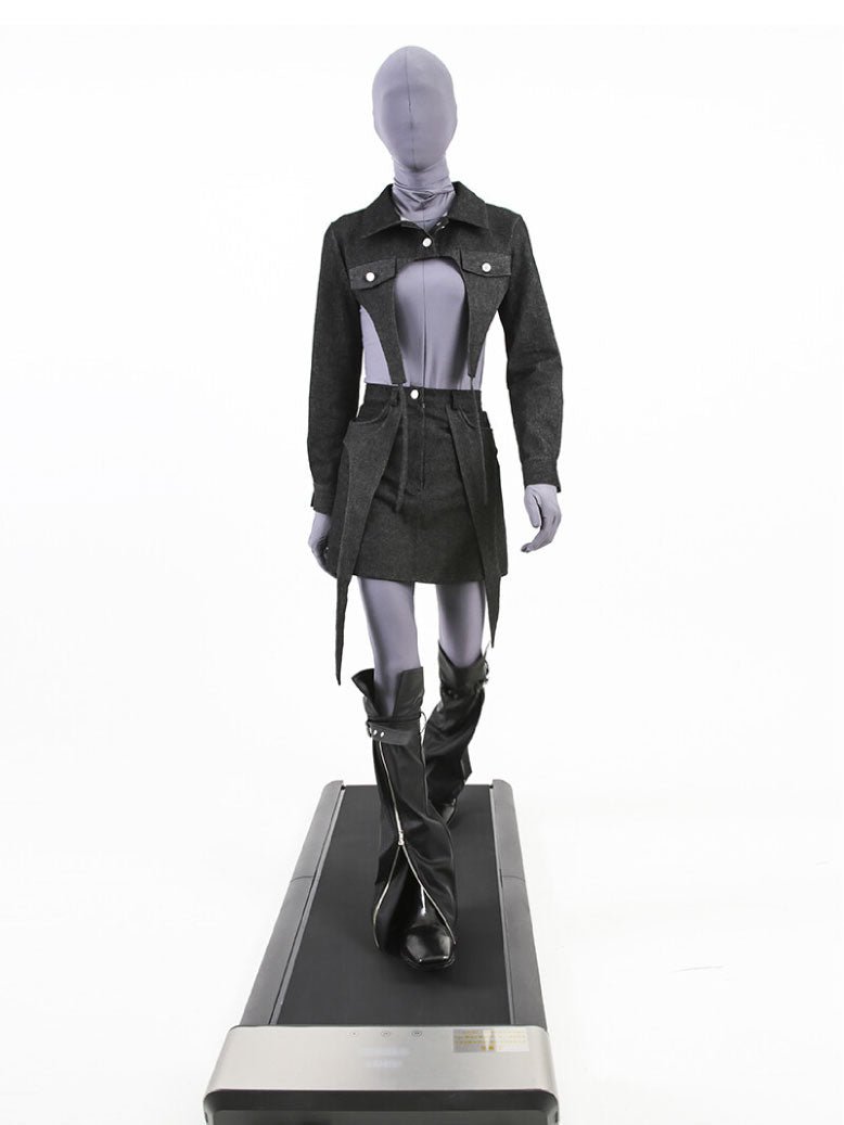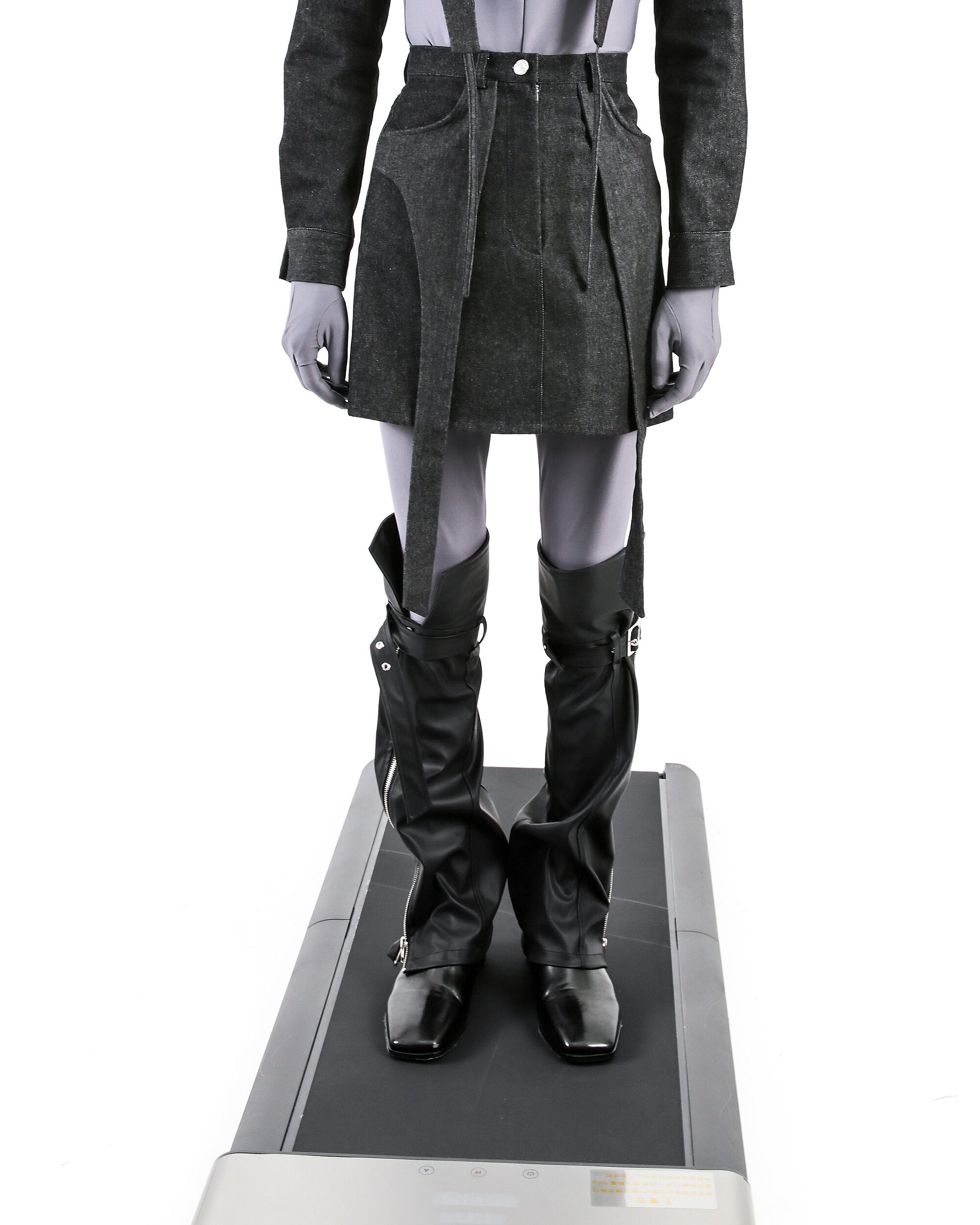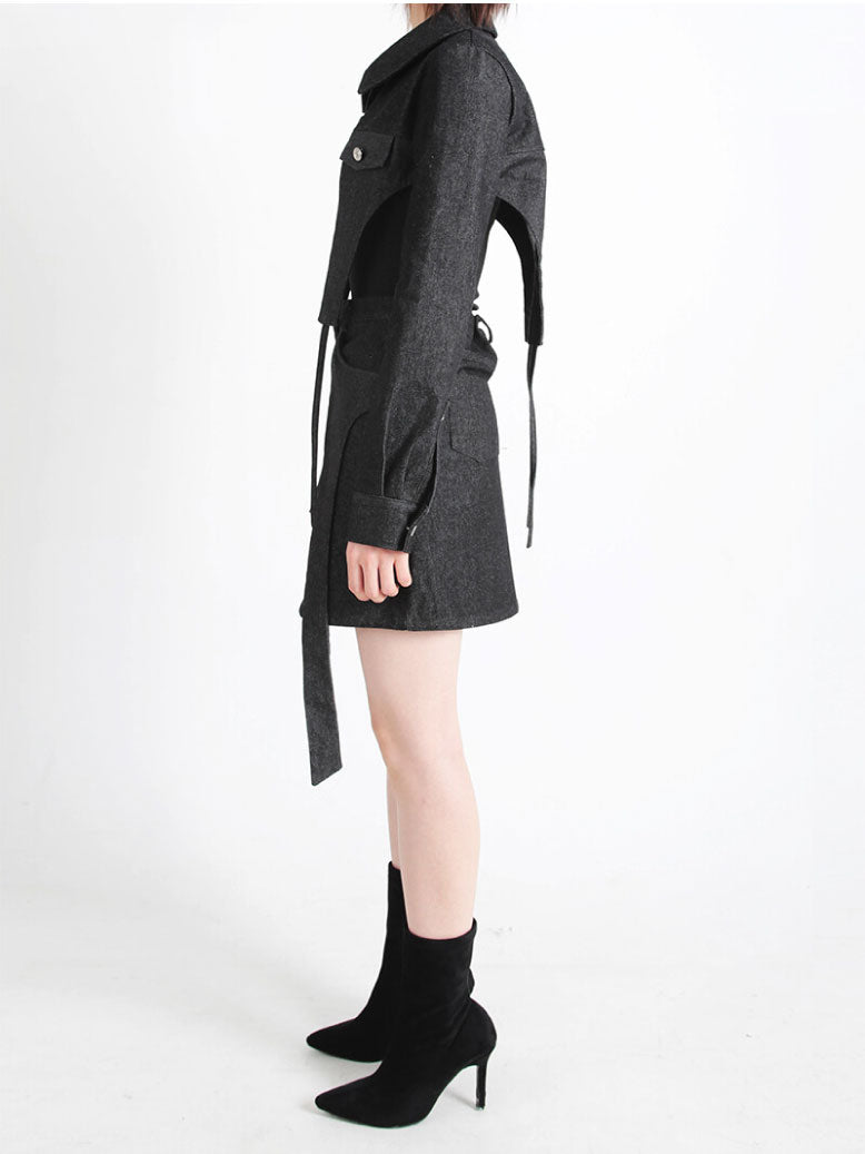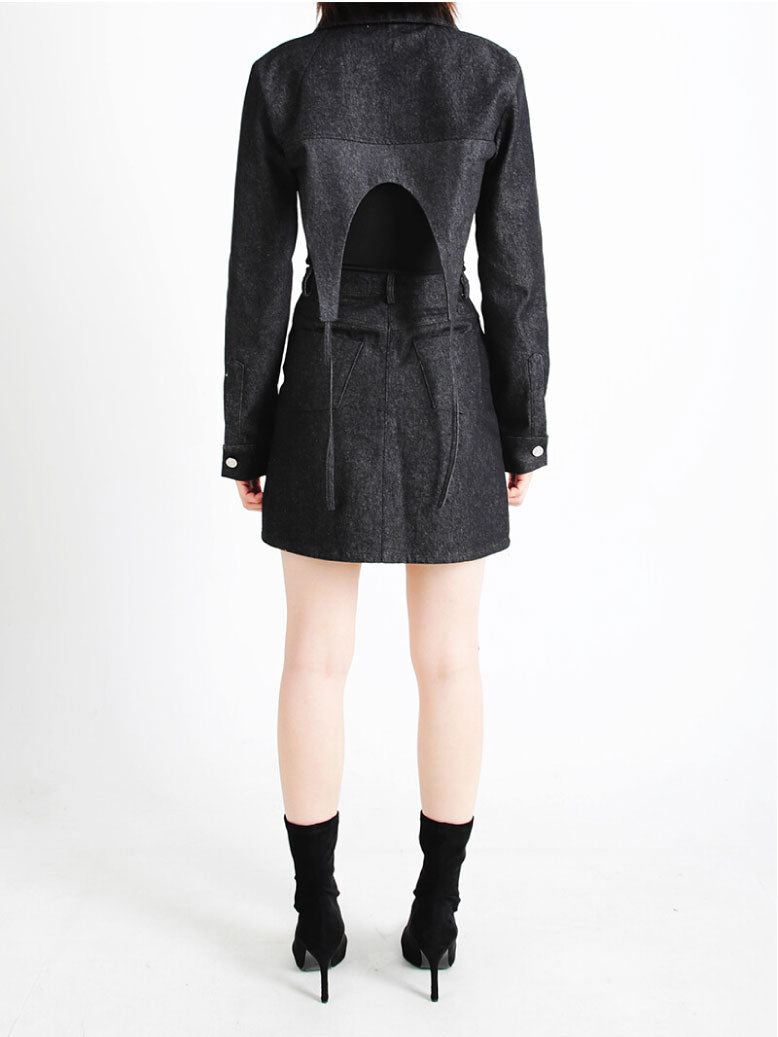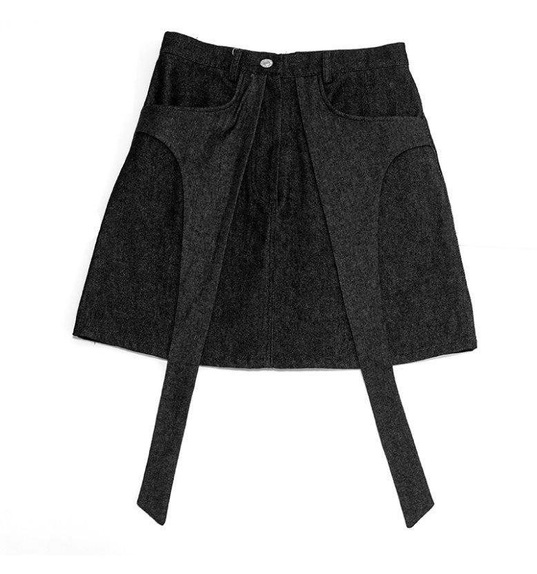 This is an A-line denim skirt designed with a unique feel. The two straps falling from the front pocket add a stylish touch. It can be paired with a crop jacket made from the same denim fabric, creating a clean and distinctive style.