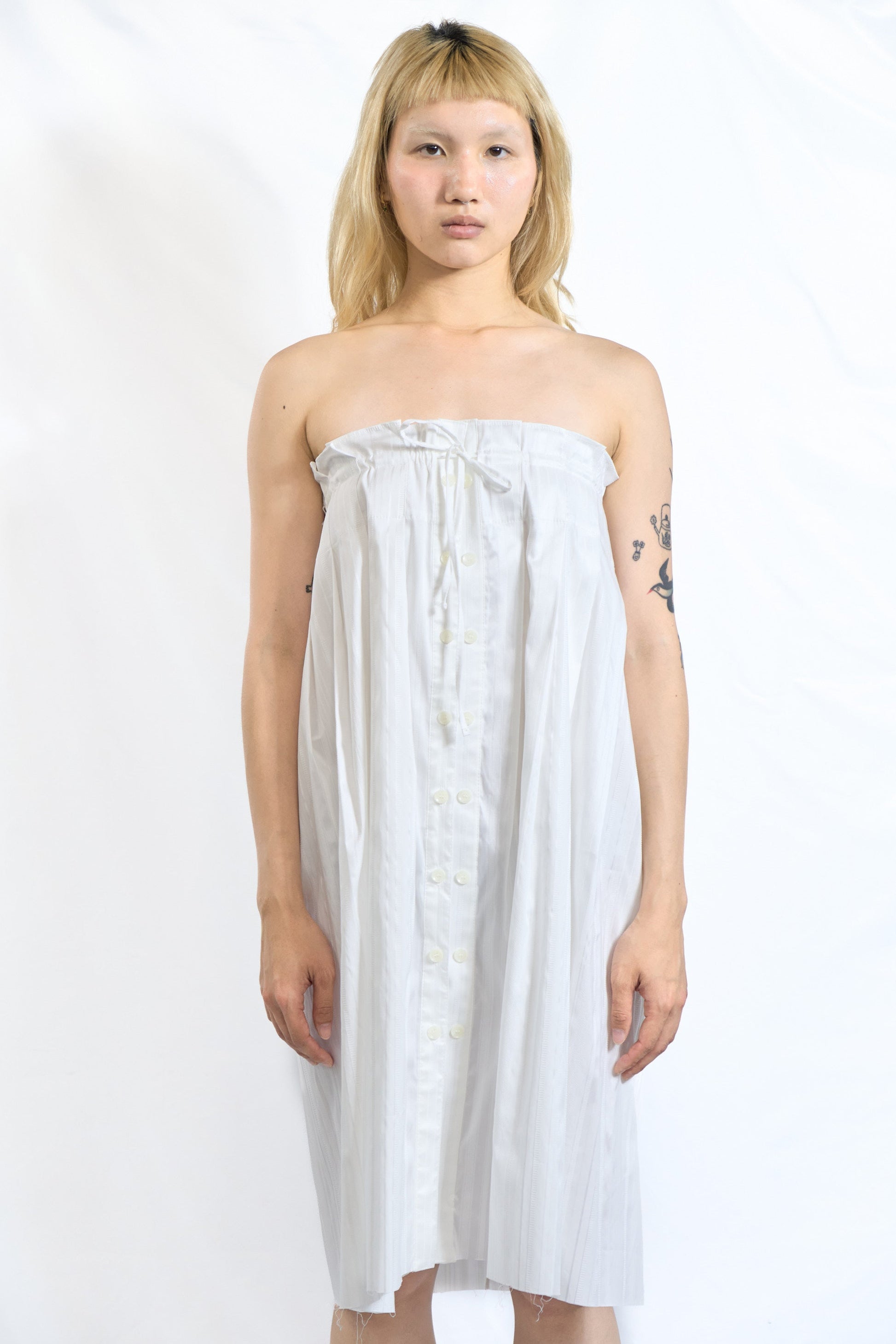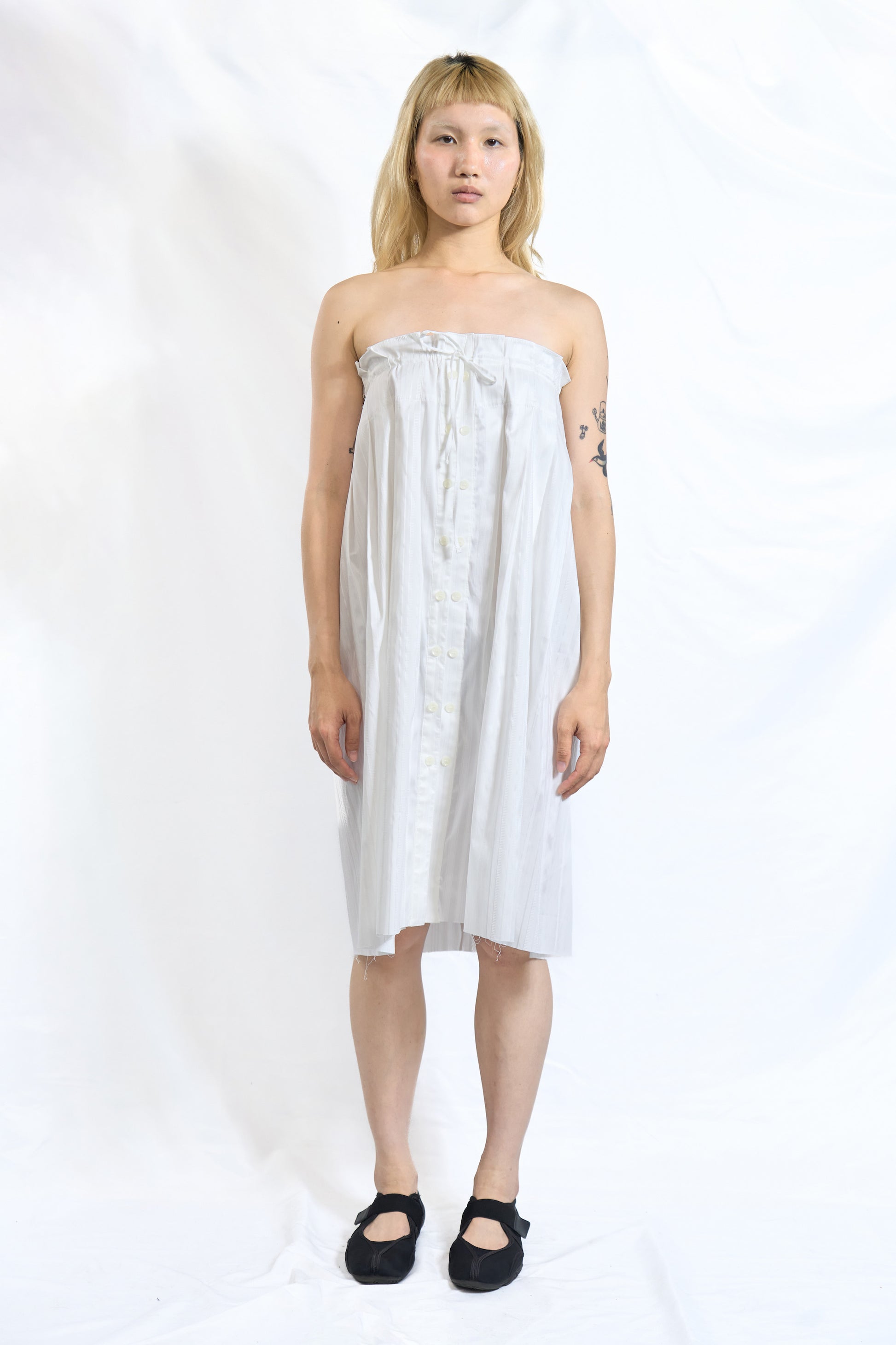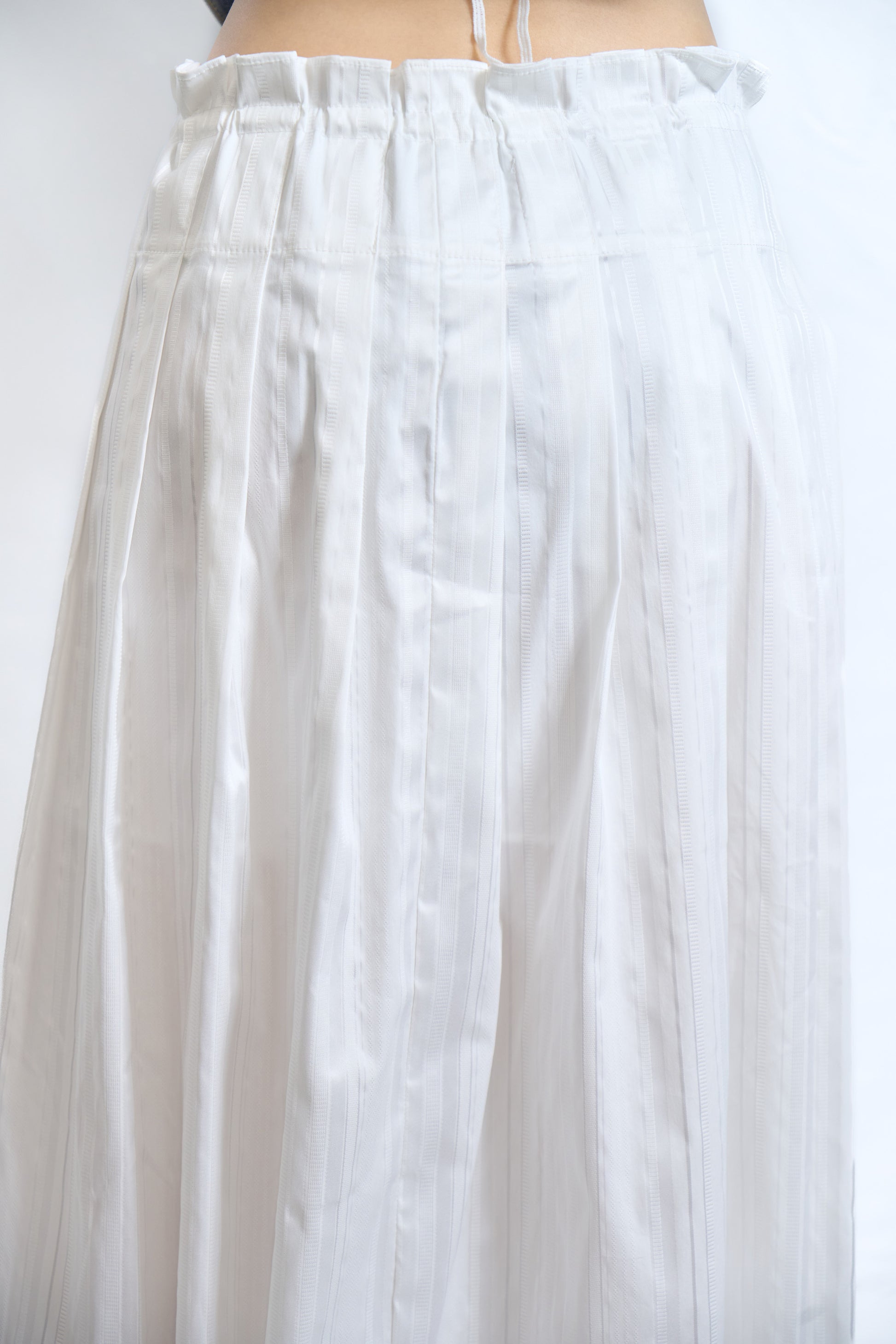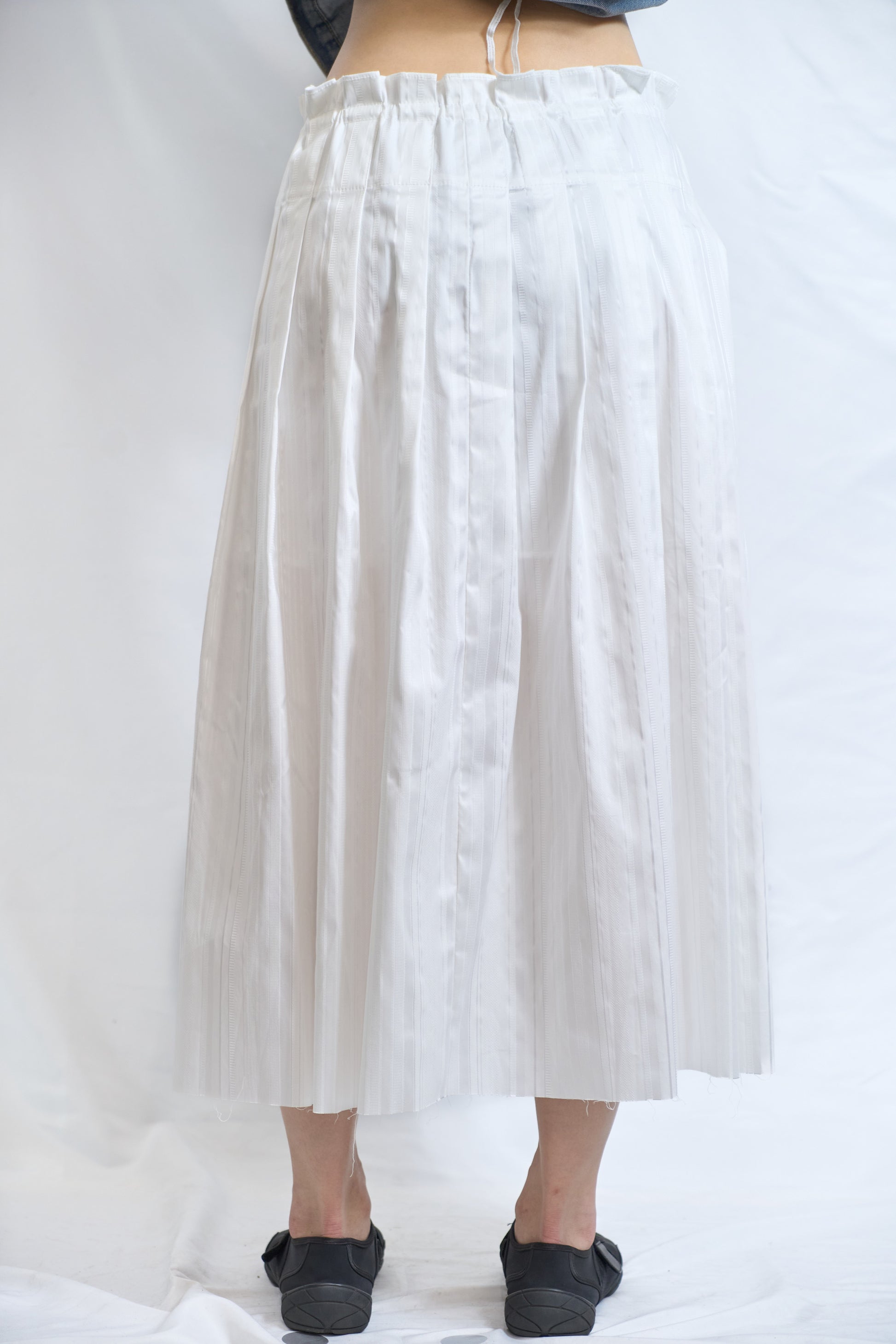 A softly structured pleated skirt with subtle texture and asymmetry. Made from a lightweight fabric with vertical woven stripes, this skirt features a buttoned side placket and a drawstring tie. The uneven pleats and raw hem give it a quietly dishevelled charm—crisp, but never too polished. Can also be styled as a strapless dress, offering versatile wear with a crisp yet effortless charm.