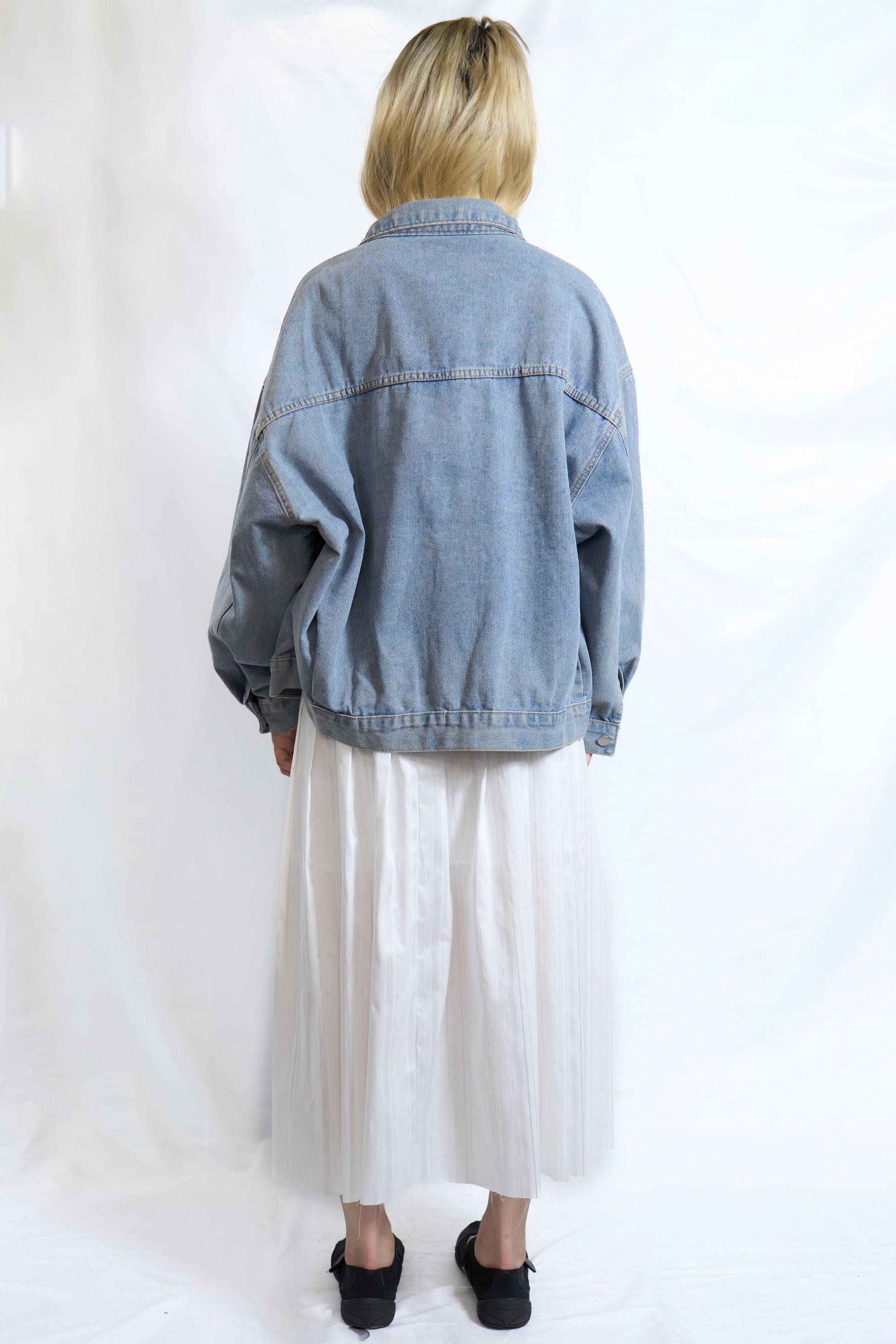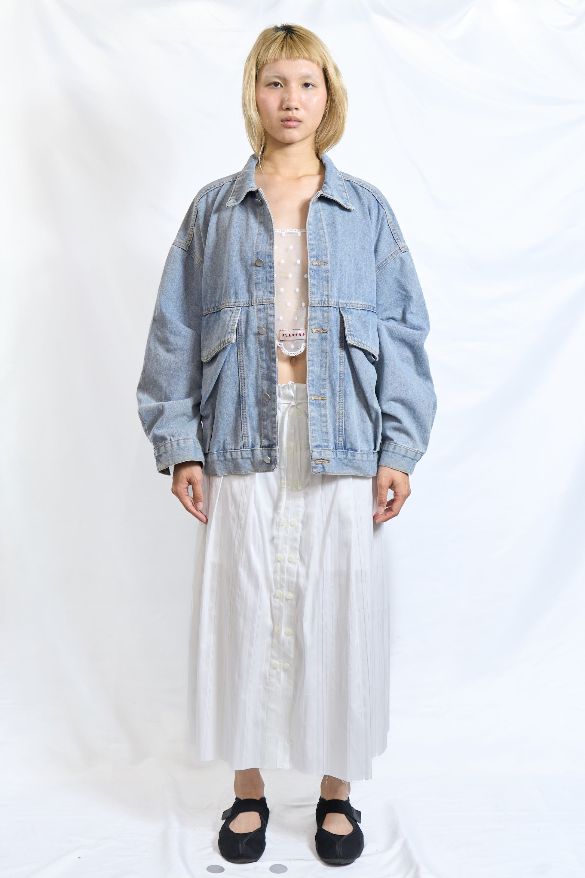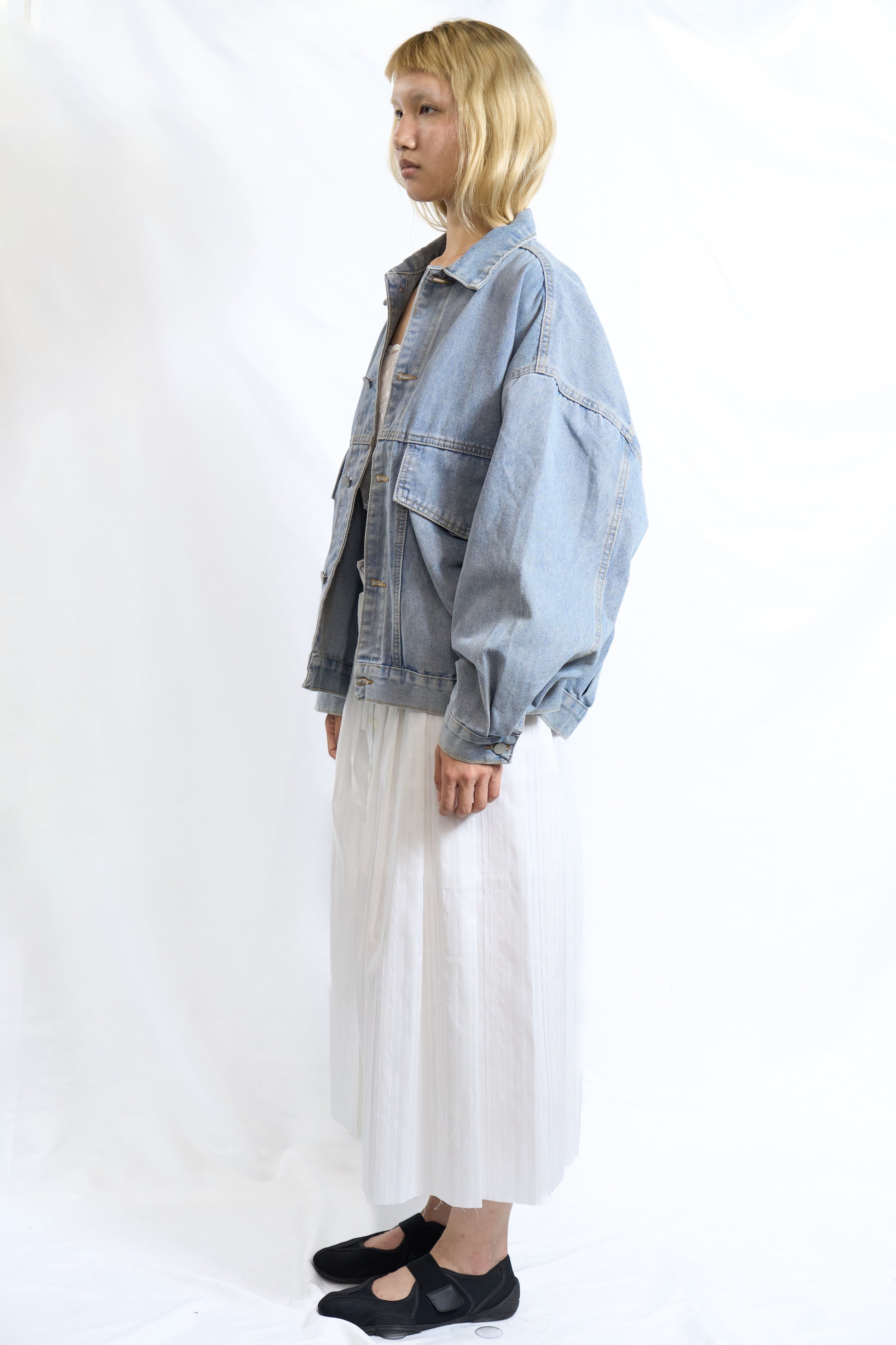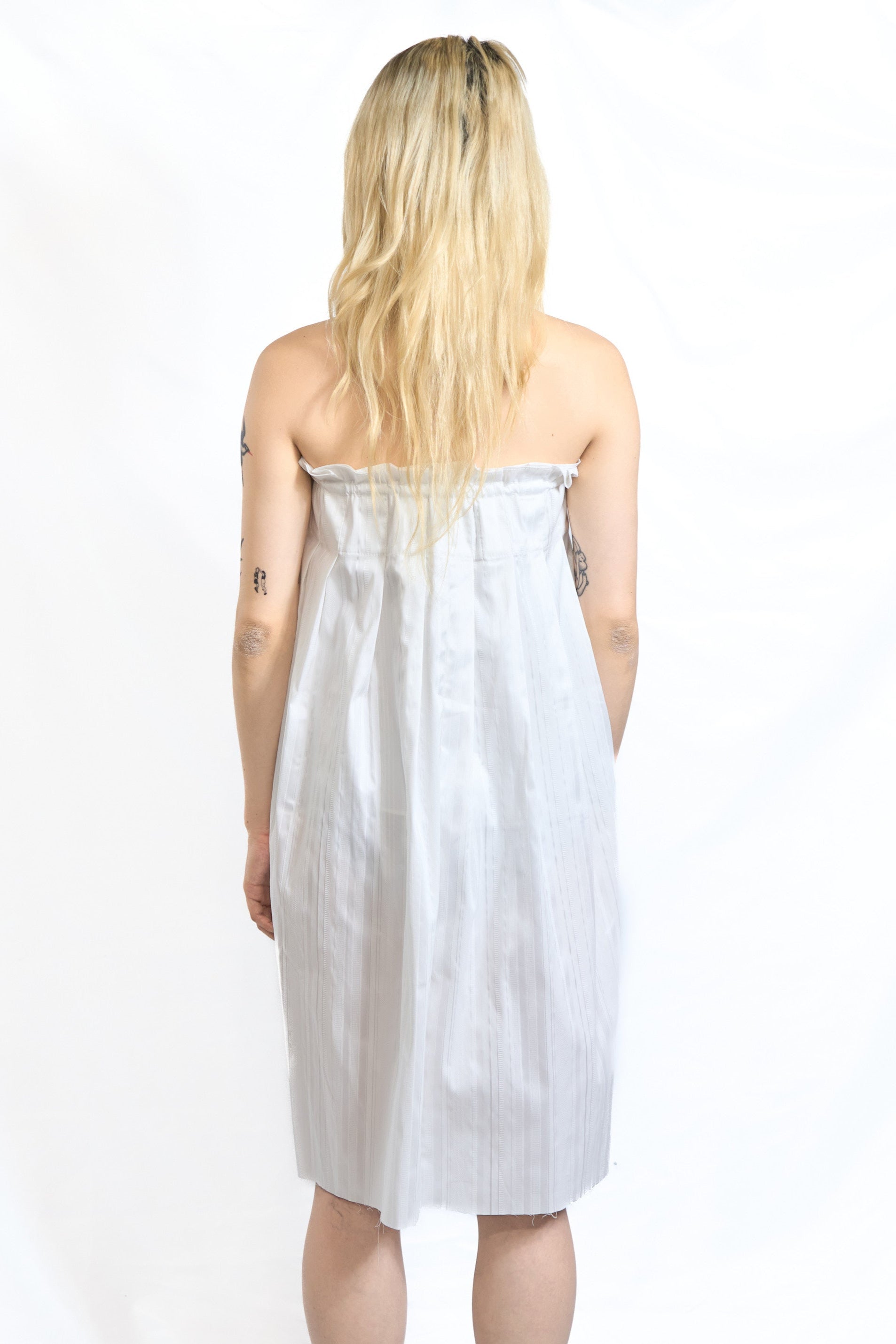 A softly structured pleated skirt with subtle texture and asymmetry. Made from a lightweight fabric with vertical woven stripes, this skirt features a buttoned side placket and a drawstring tie. The uneven pleats and raw hem give it a quietly dishevelled charm—crisp, but never too polished. Can also be styled as a strapless dress, offering versatile wear with a crisp yet effortless charm.