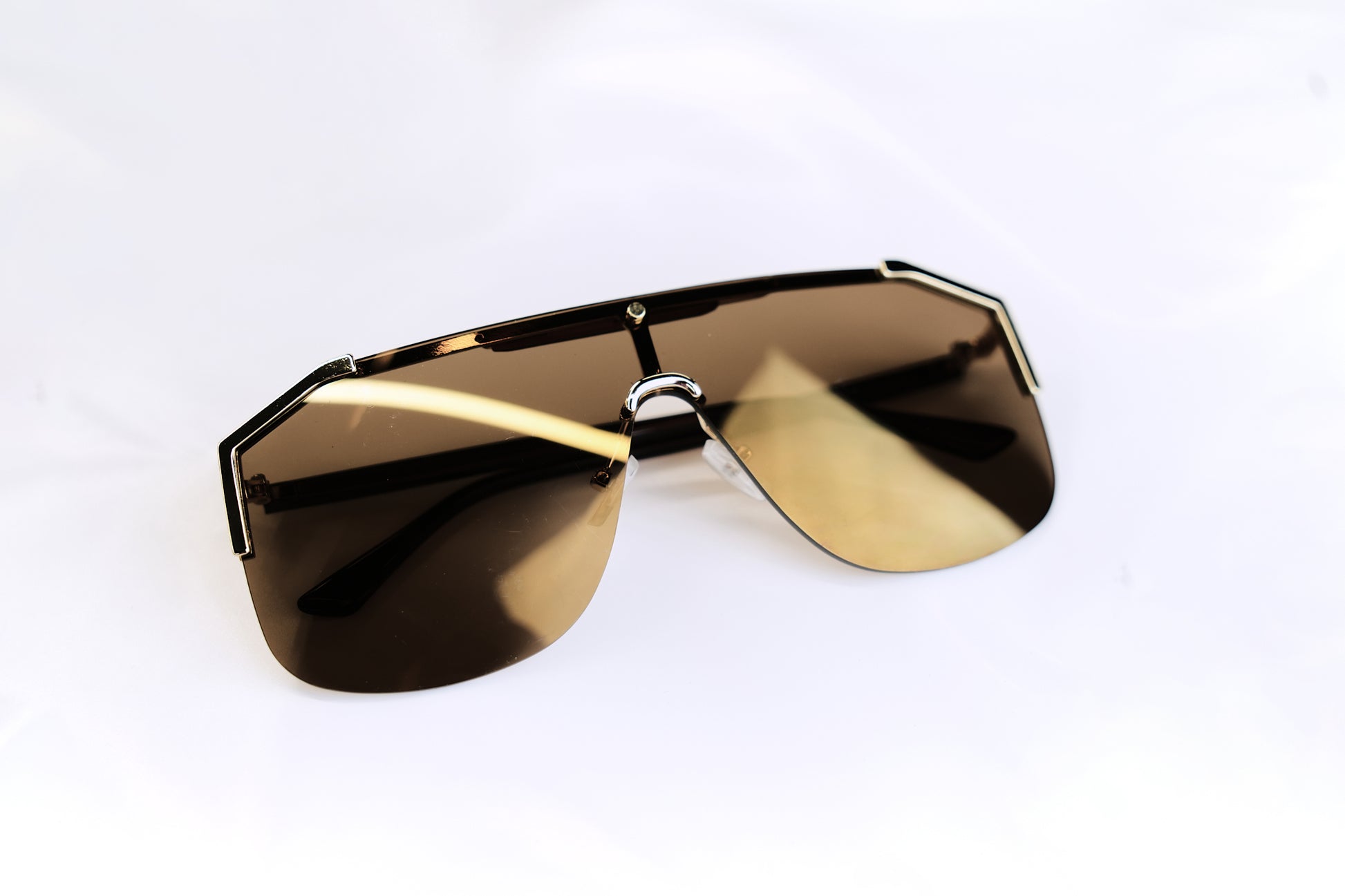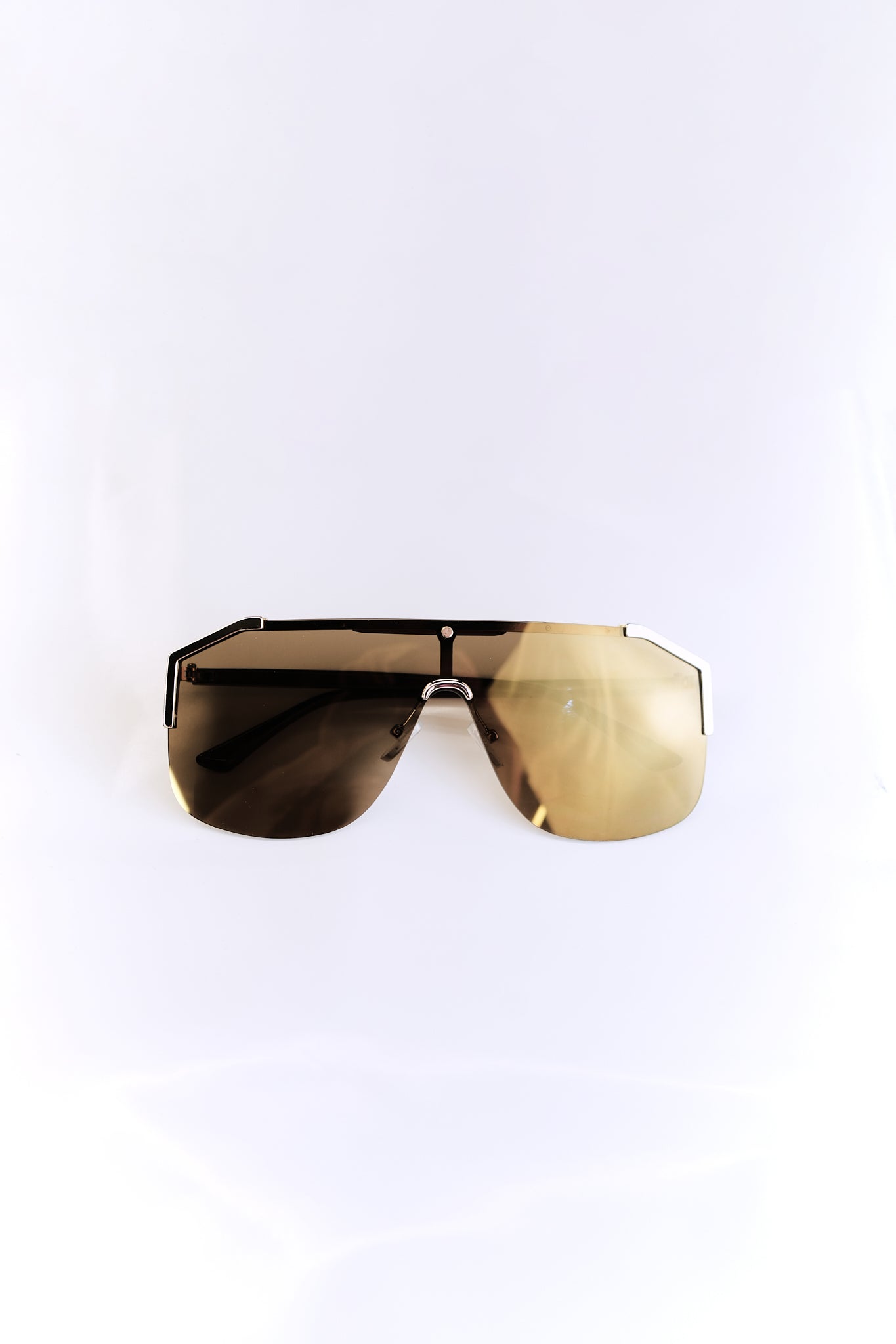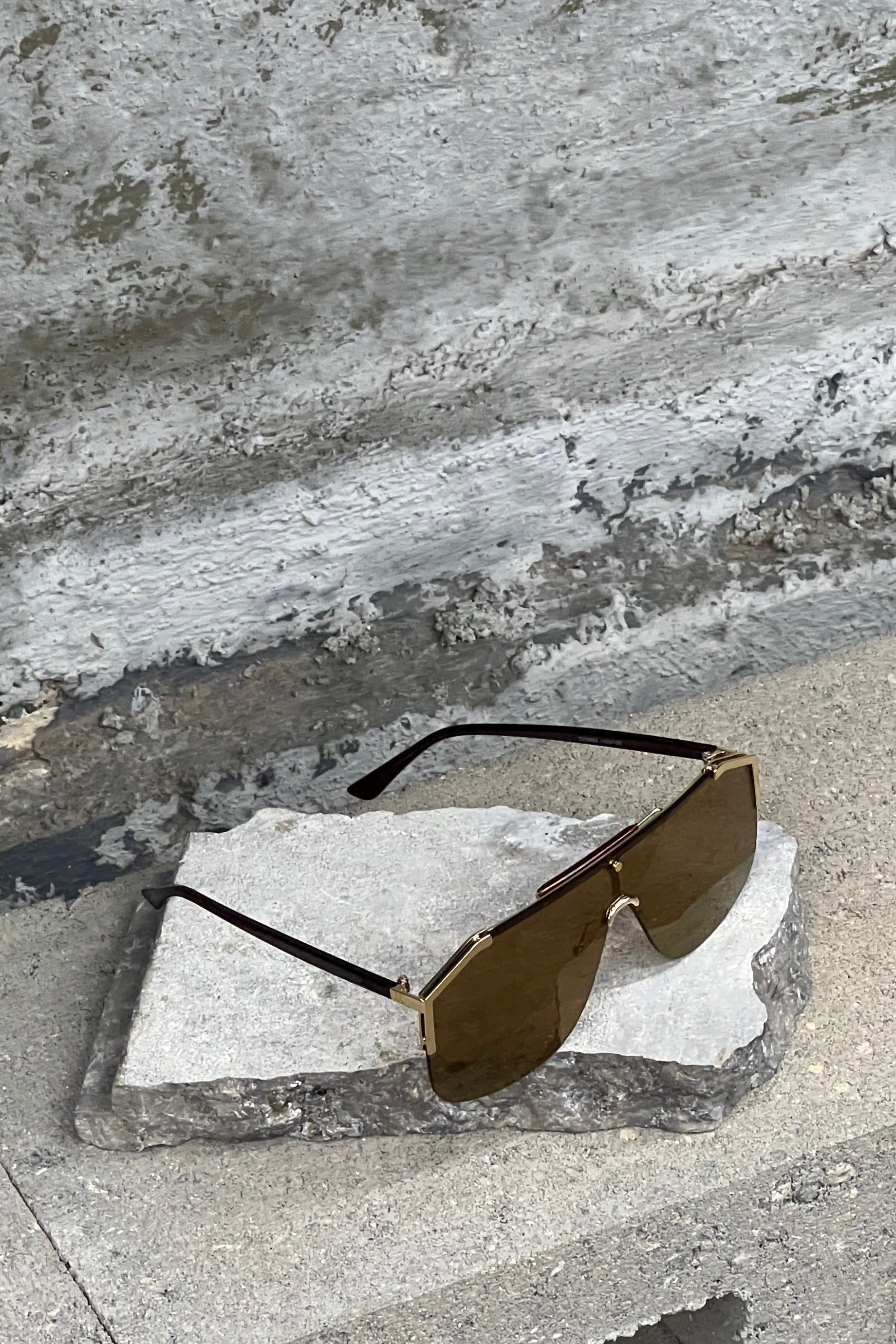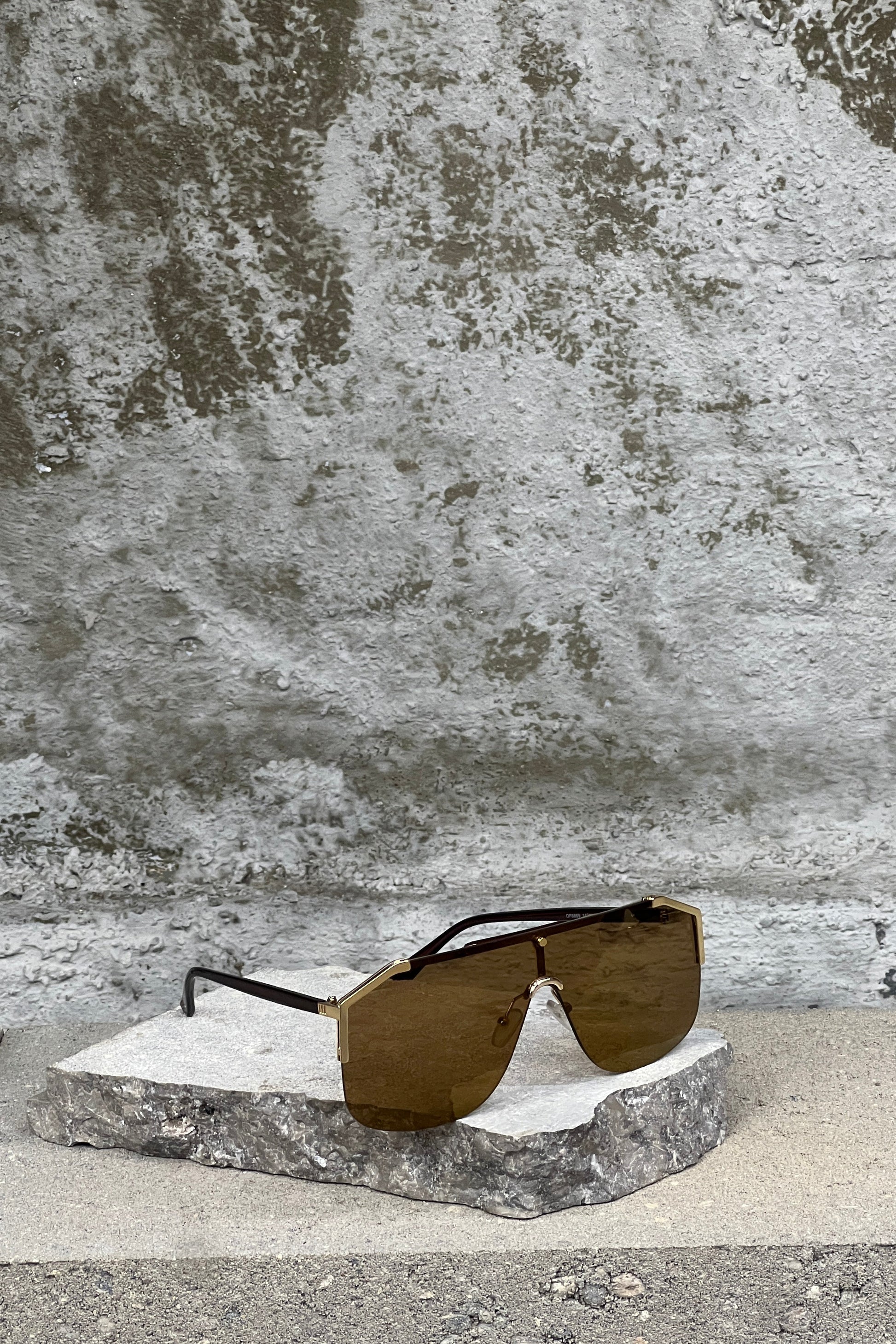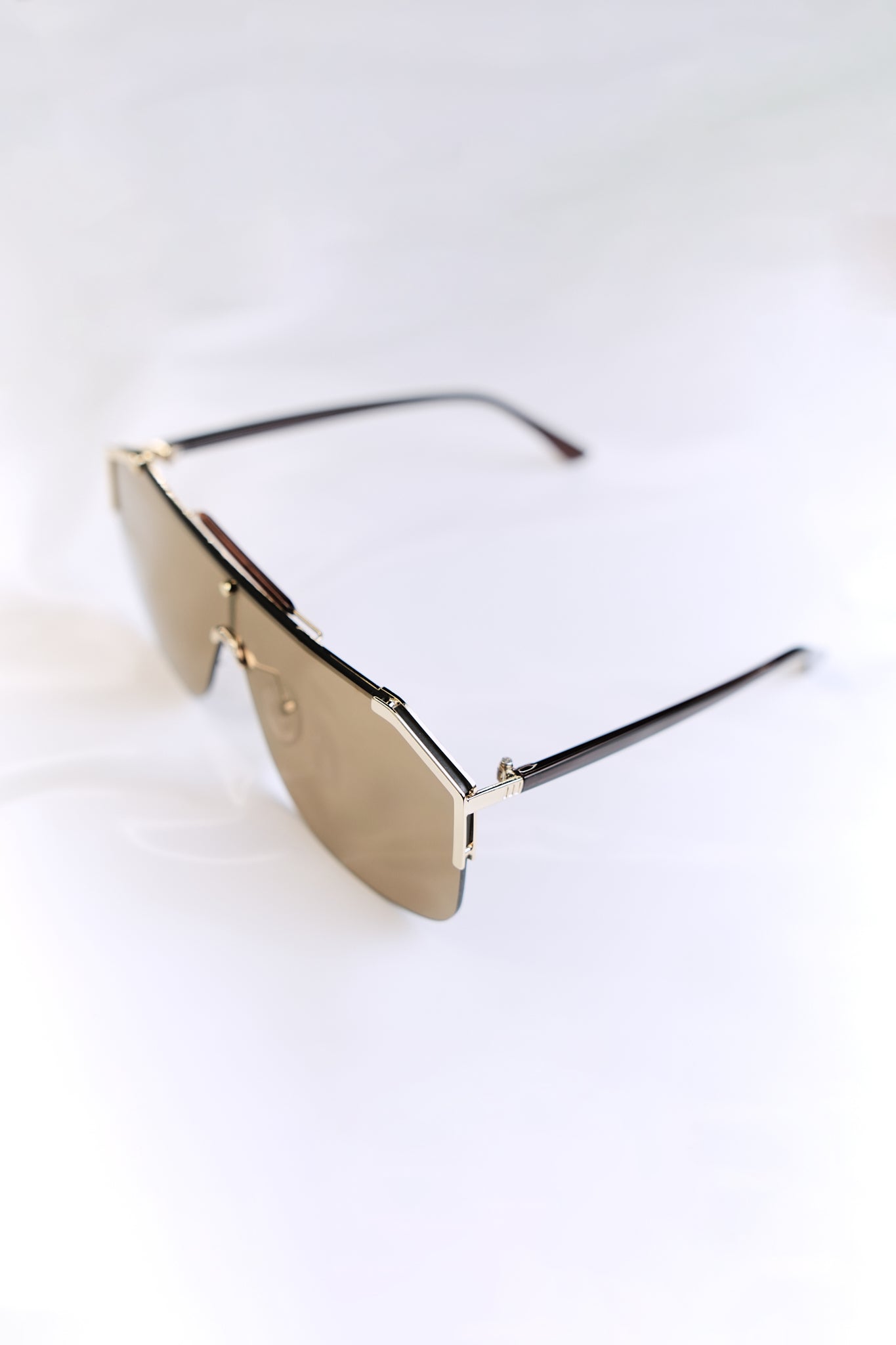 A statement accessory with refined elegance, these sunglasses feature oversized, irregularly shaped lenses set in a semi-rim brown frame. Slim temples and delicate gold-tone accents highlight the sophisticated construction, elevating the design beyond everyday eyewear.