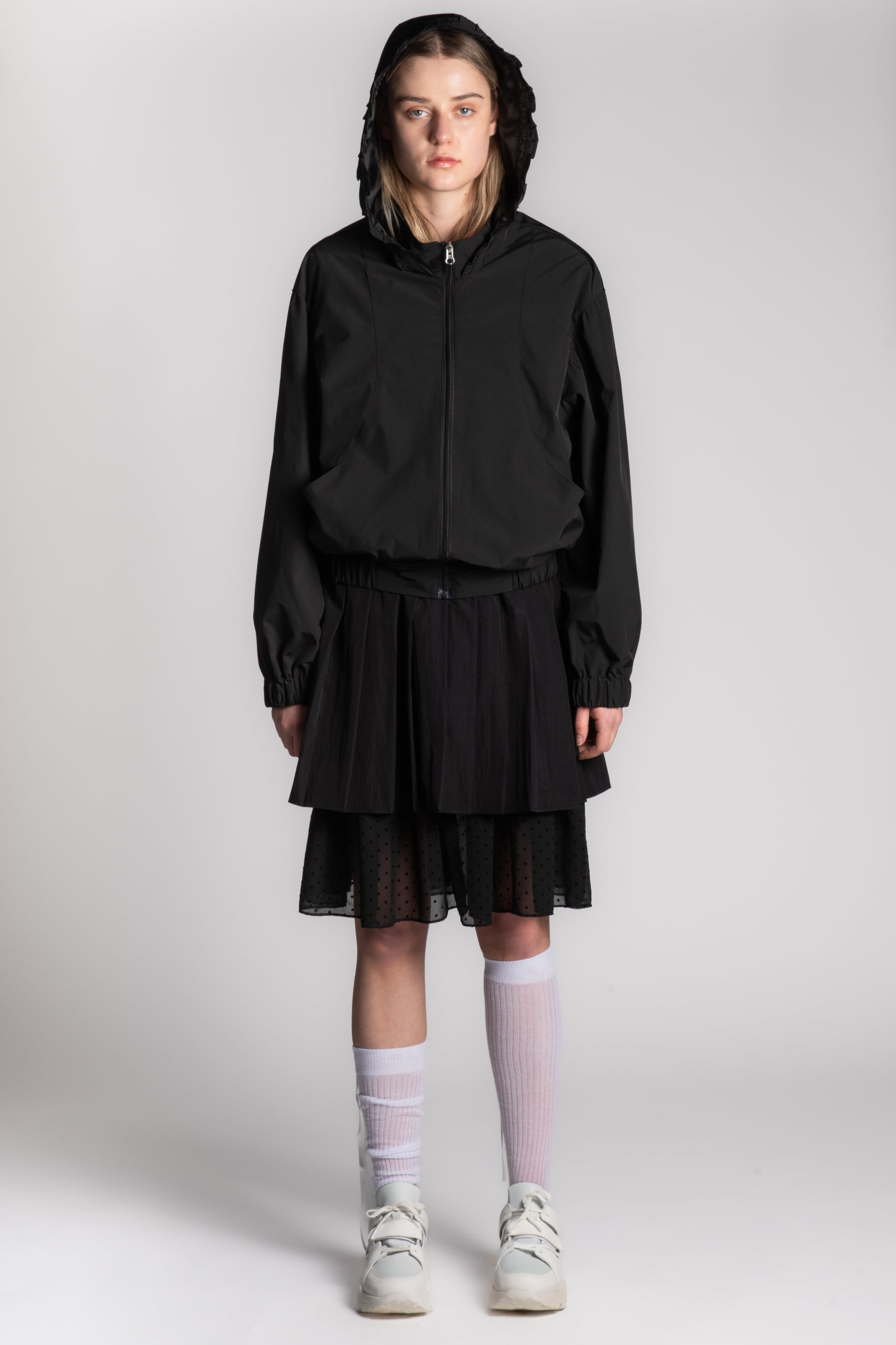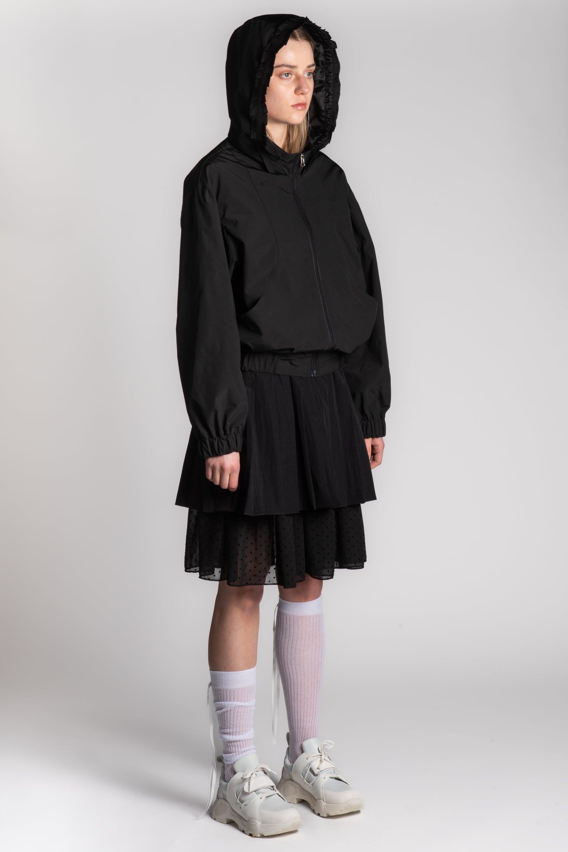 The BLACK HOODED JACKET reinterprets volume and form through architectural construction.
