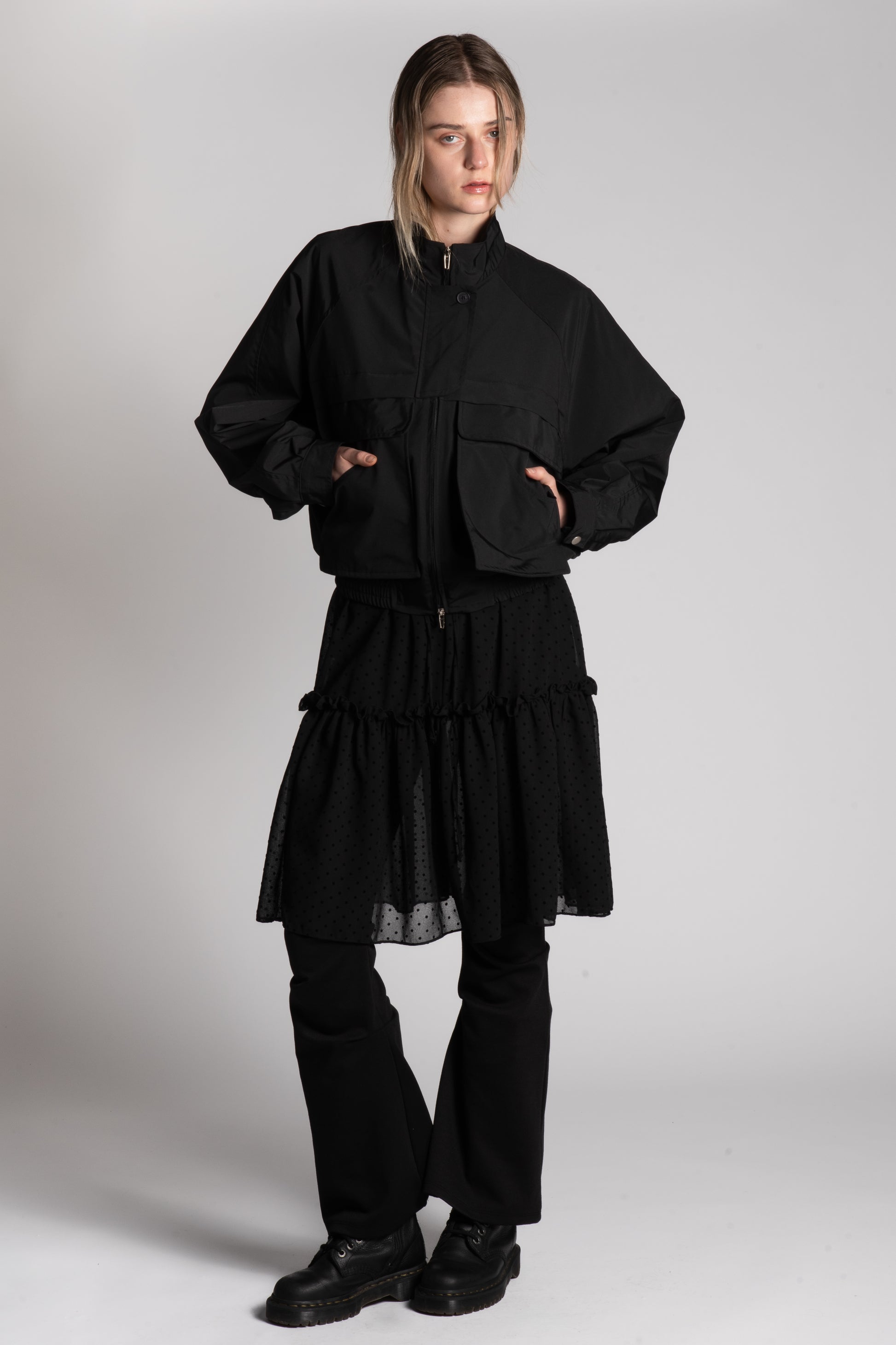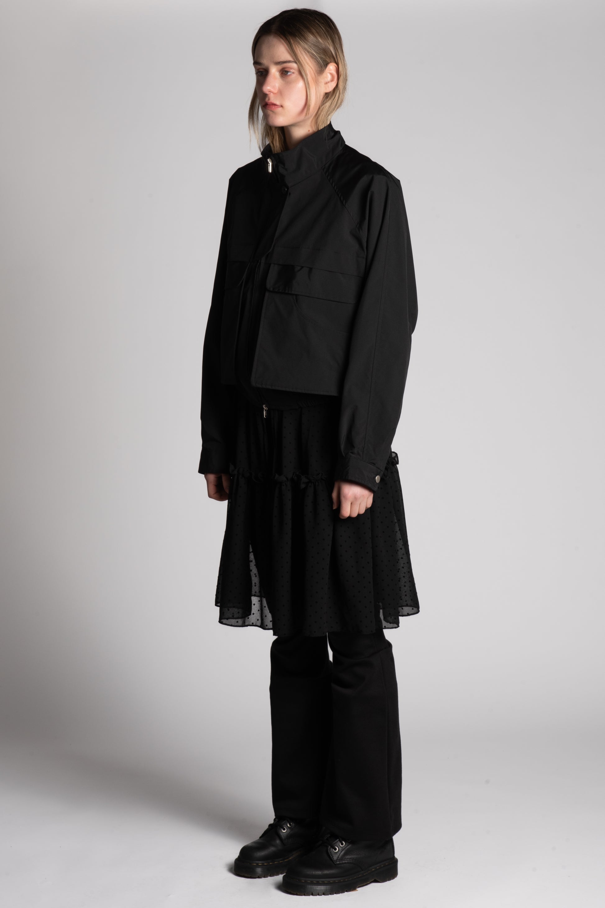 Designed with an oversized, boxy fit and exaggerated drop shoulders, this jacket introduces a sculptural, three-dimensional effect. The high-neck collar and minimalist front closure complement the clean tailoring, adding a refined, utilitarian edge to the avant-garde form.