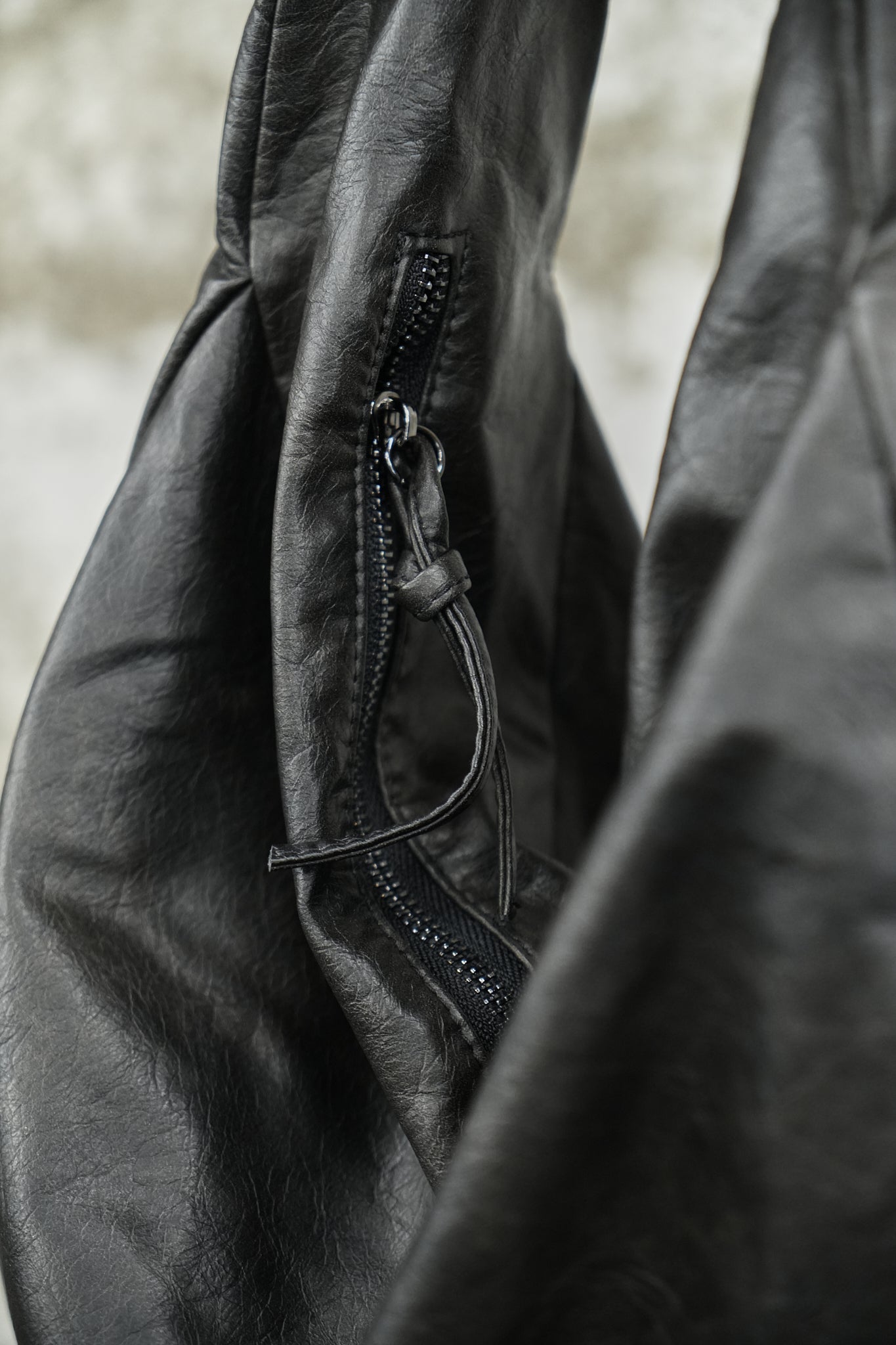 Crafted from supple black leather, this piece features a naturally draped form that evolves with wear. The adjustable strap allows versatile styling, while the zip closure keeps essentials secure.