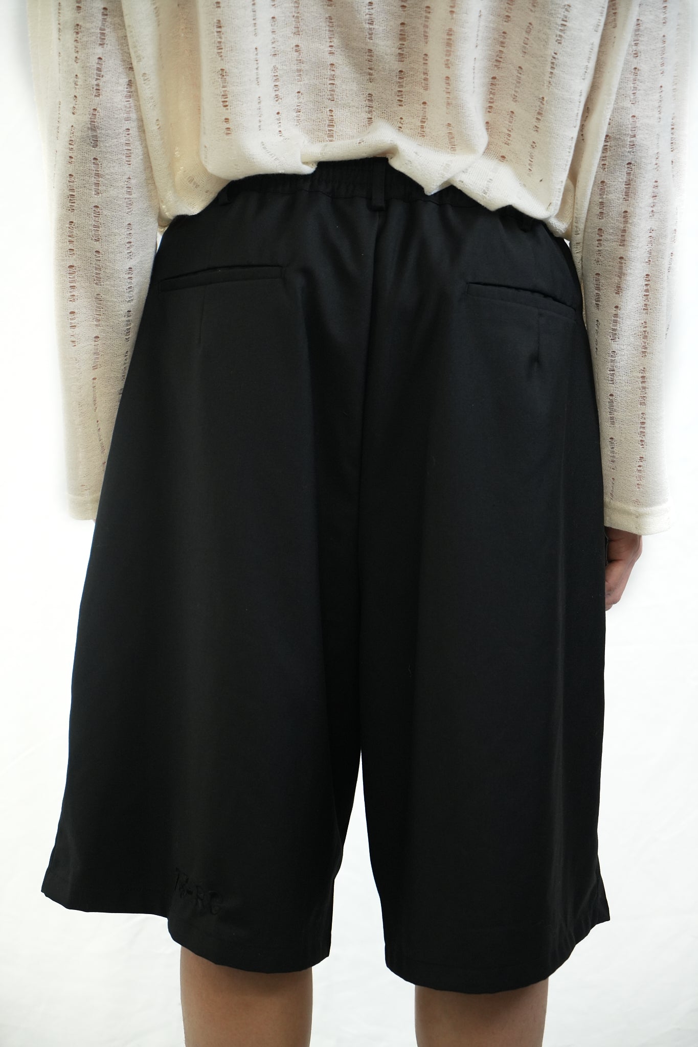 Crafted in a deep, matte black fabric, the silhouette maintains a crisp profile while allowing for maximum airflow and movement. Designed to sit comfortably at the waist, these shorts serve as a sophisticated, architectural foundation for experimental layering and modern monochromatic styling.