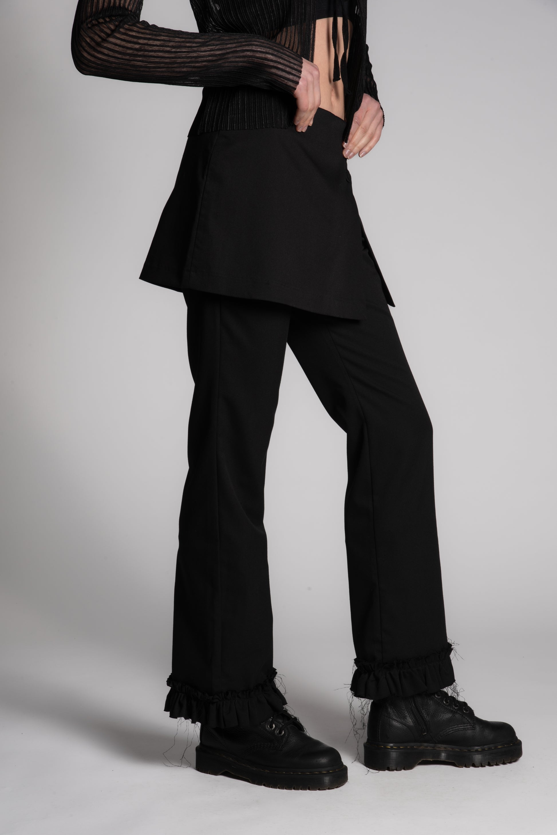 Designed with an integrated skirt overlay, these pants introduce a sculptural, three-dimensional effect through layered paneling. The fluid drape of the skirt combined with the tailored leg underneath adds a refined, utilitarian edge to the avant-garde form.