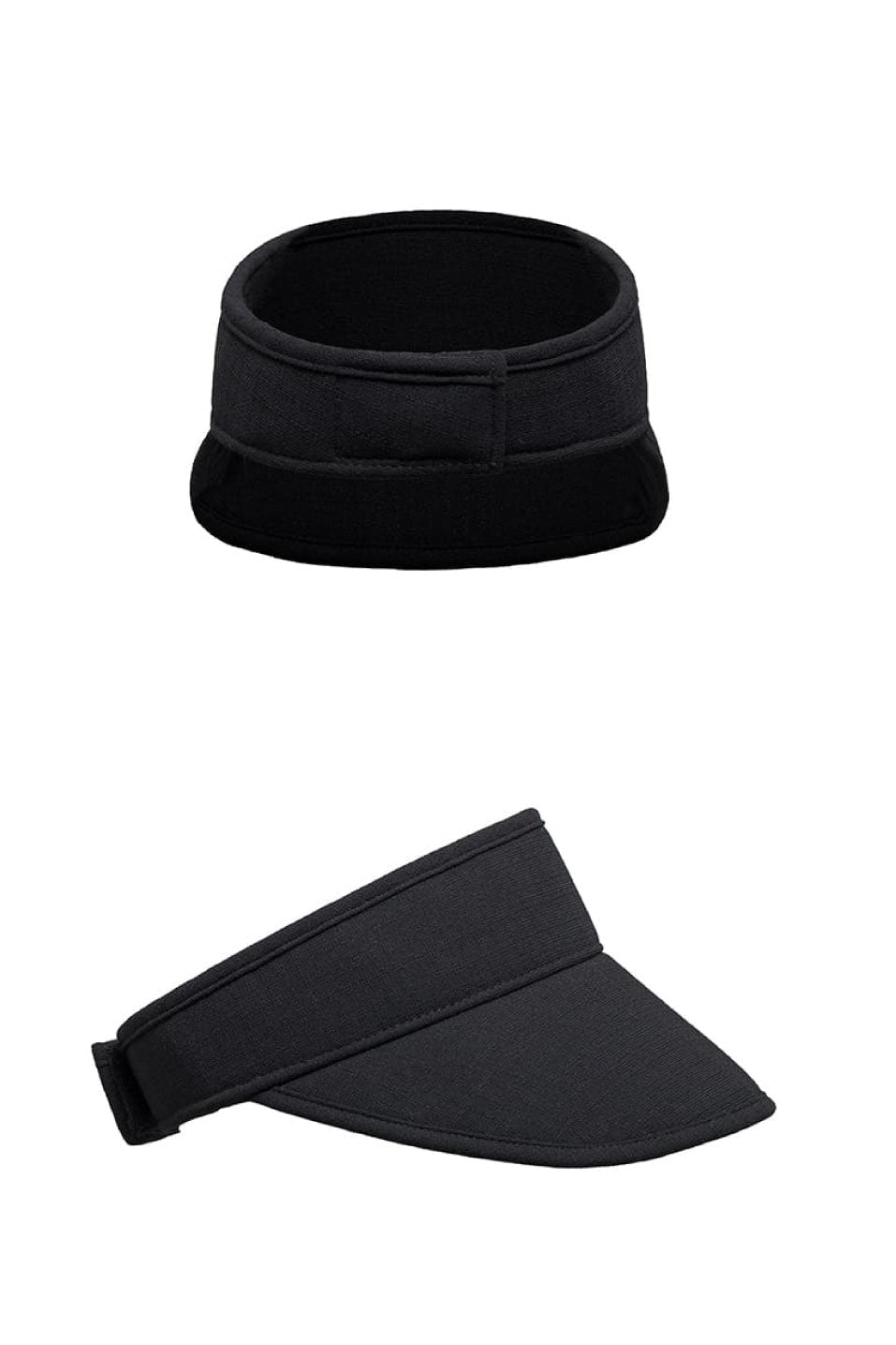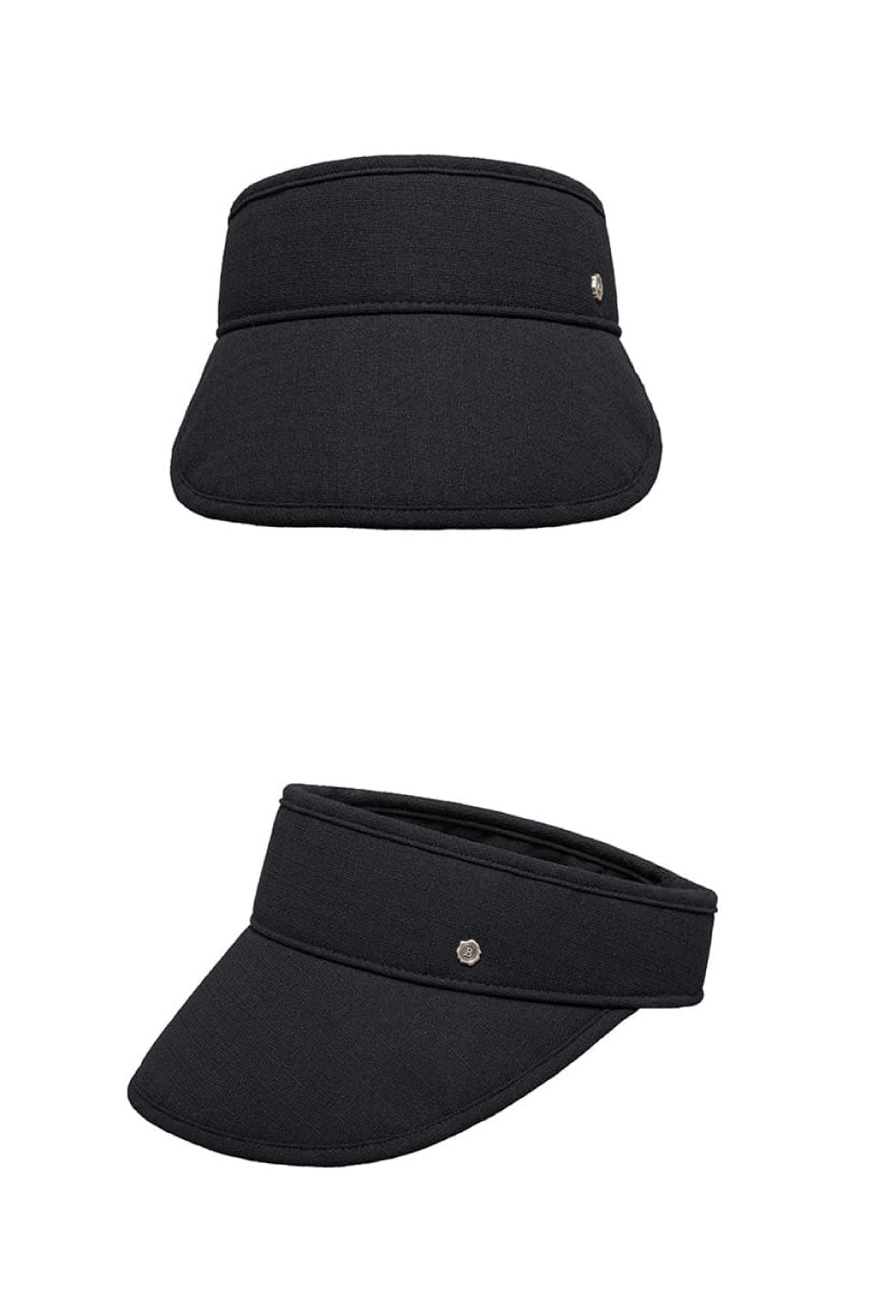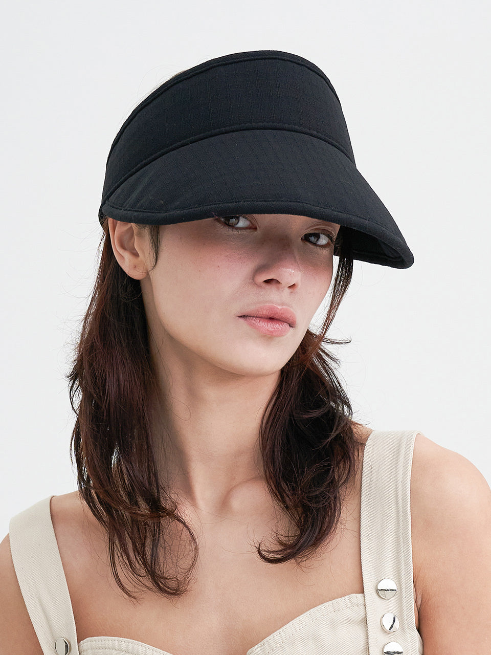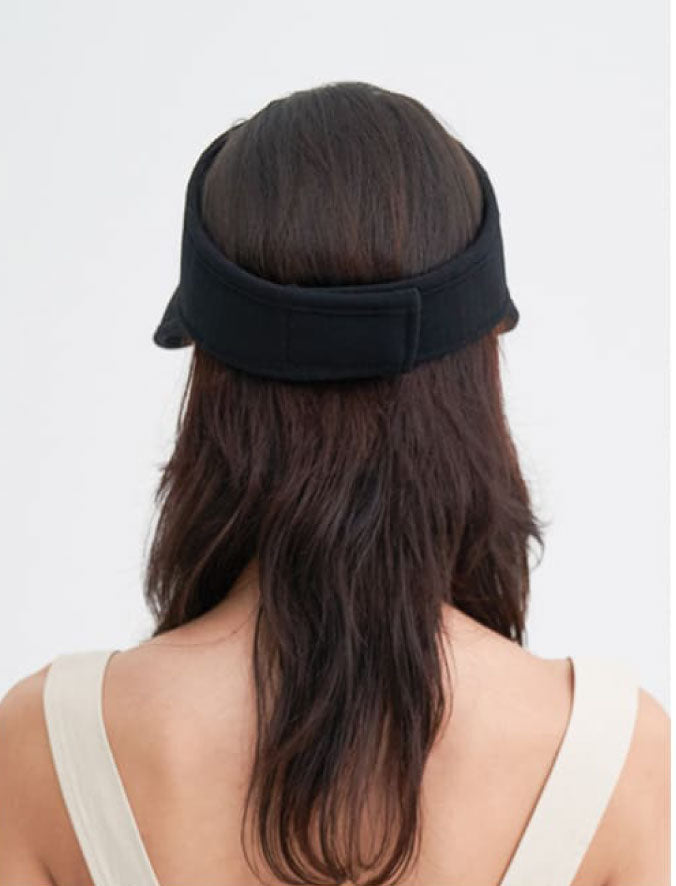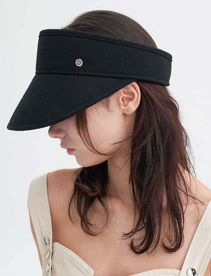 Made from Italian black linen, this visor emphasizes silhouette and fabric texture. With a slightly curved brim tailored to flatter the face, it exudes a chic, slimming effect compared to typical visors. It's adjustable with Velcro at the back for a perfect fit.