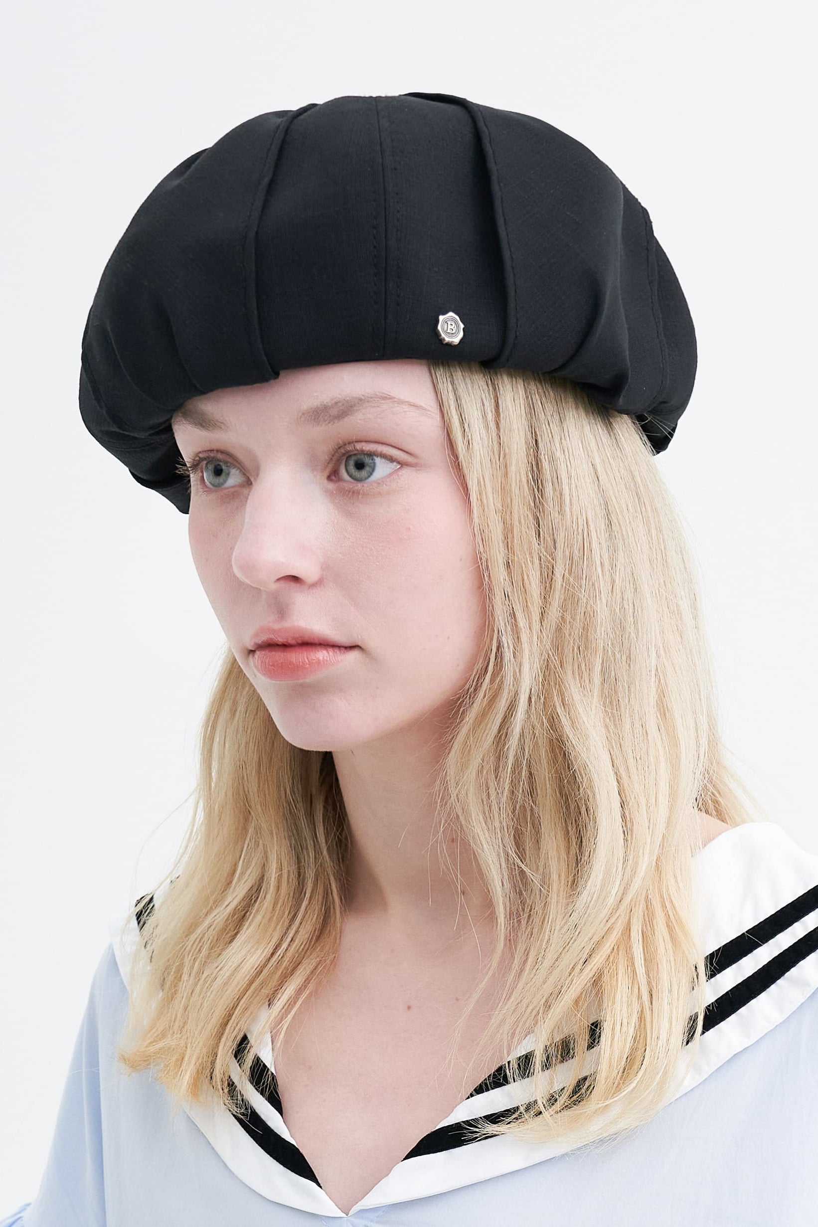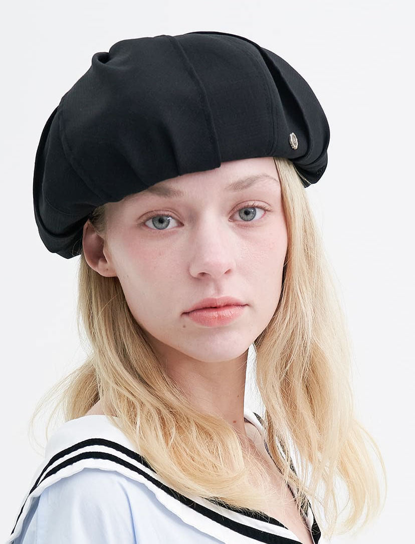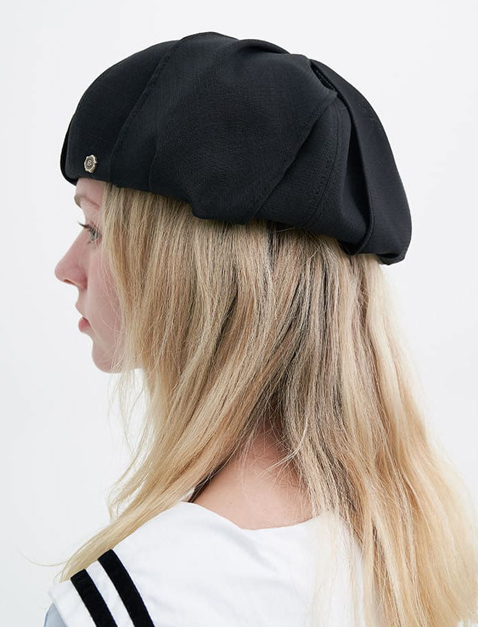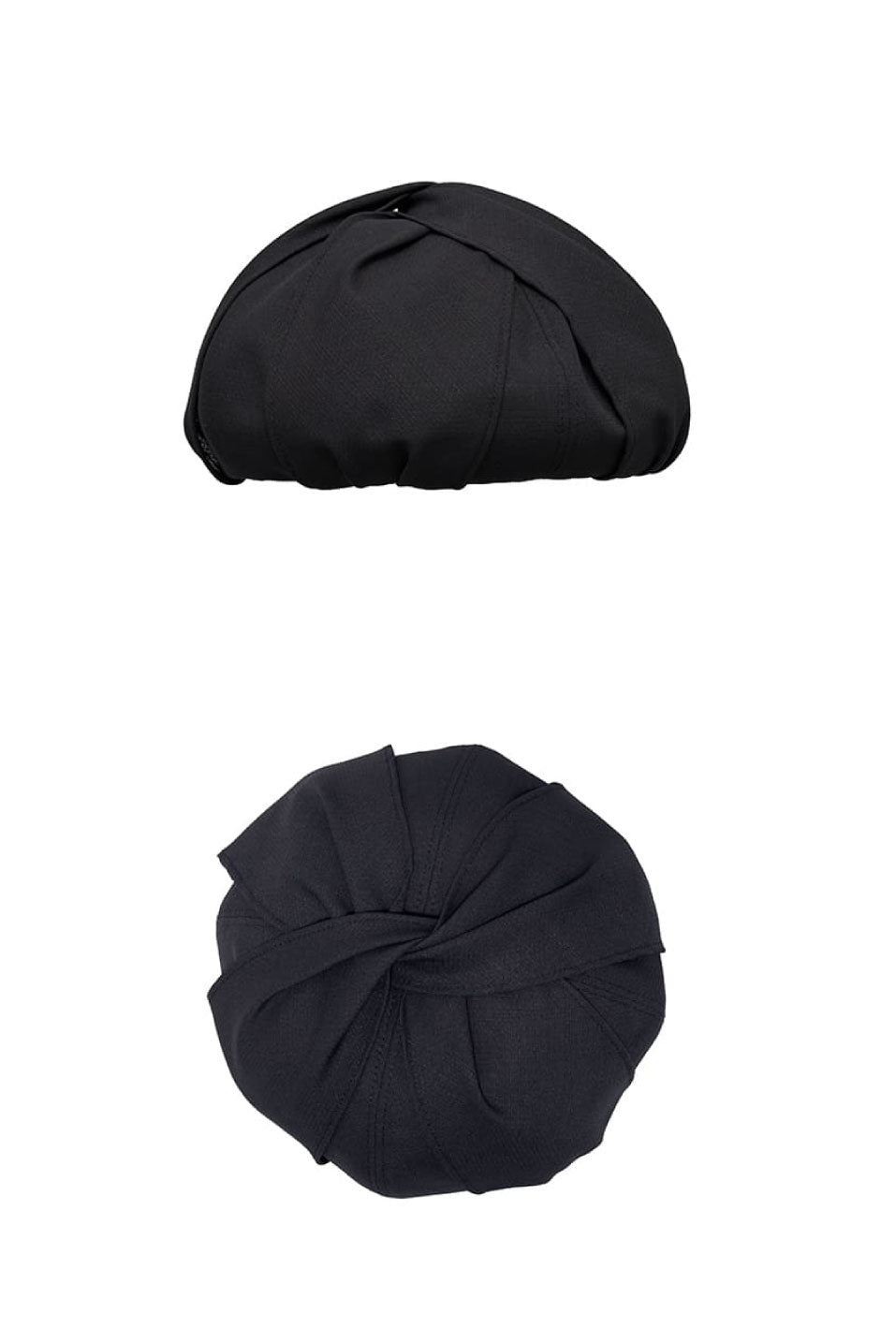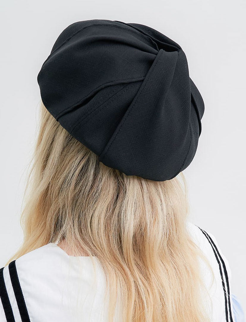 Introducing the twisted ribbon beret, featuring draped details on the crown. Its pleated design allows for easy wearing at different angles, while the lightweight summer wool fabric ensures comfort even on hot days. Plus, it's adjustable with Velcro inside the sweatband.