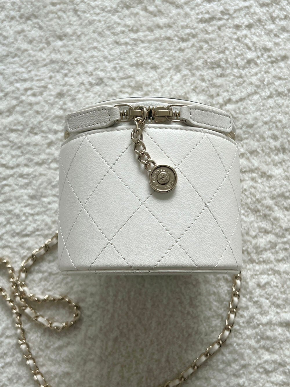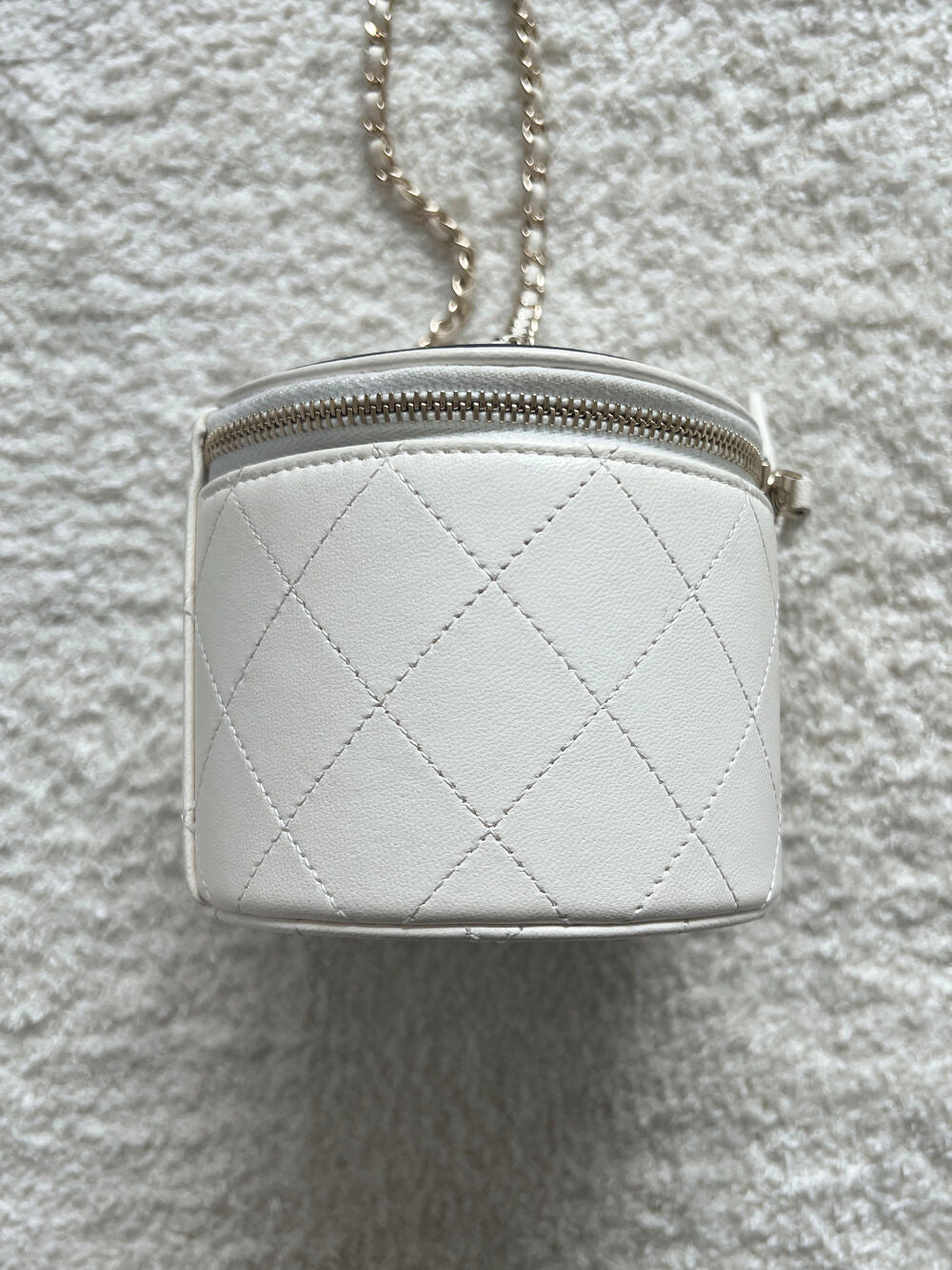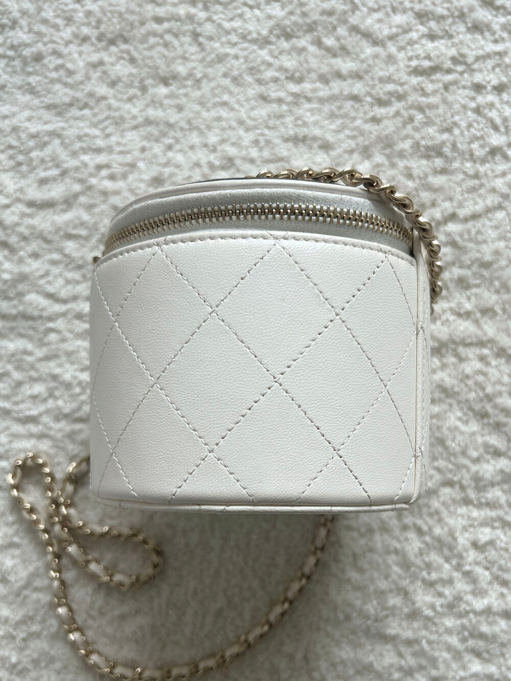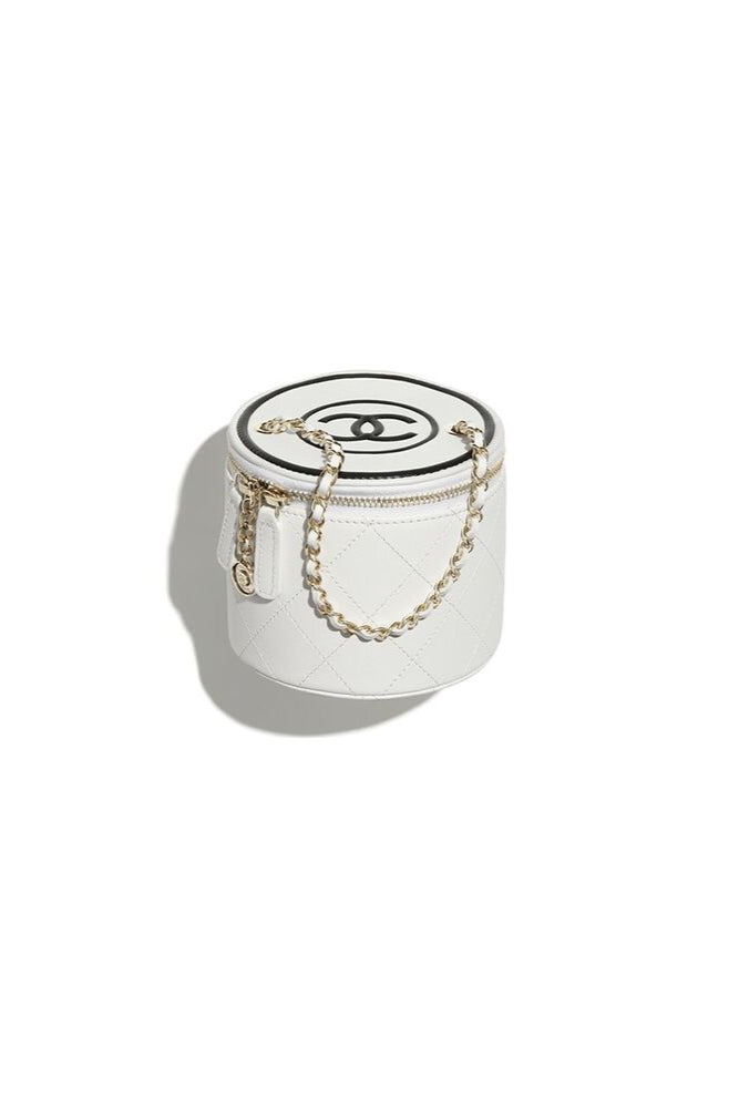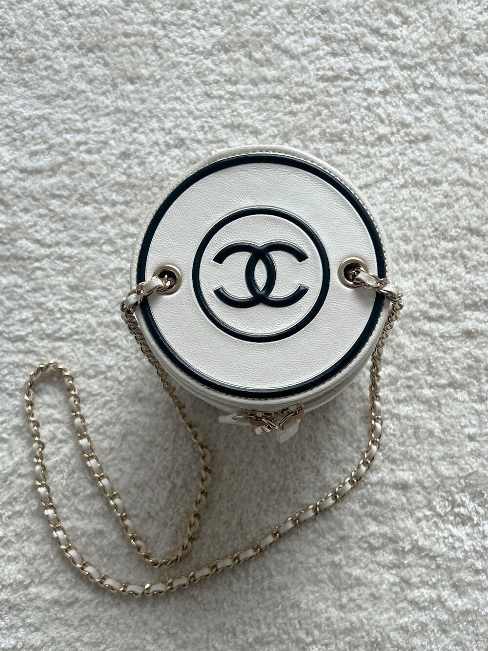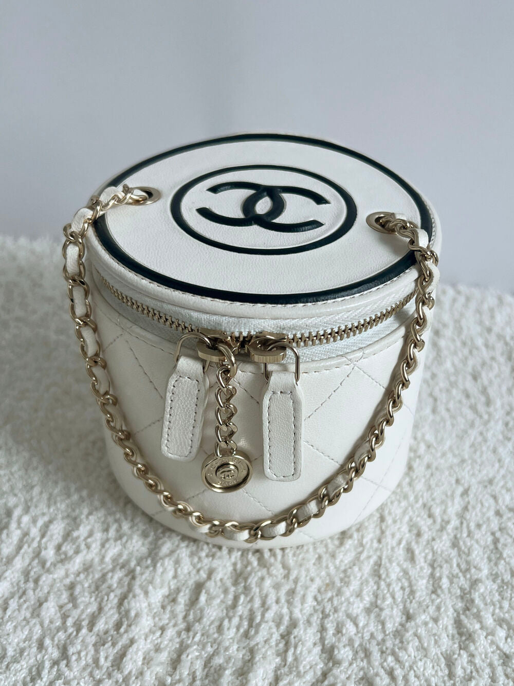 Originally released as a 2021 Spring/Summer seasonal limited edition, the Chanel CC Logo Vanity Bag is a highly collectible piece featuring an adorable cylindrical shape. The white and black color contrast, combined with champagne gold chain detailing, adds a touch of luxury to this elegant design.