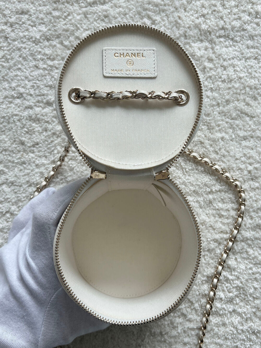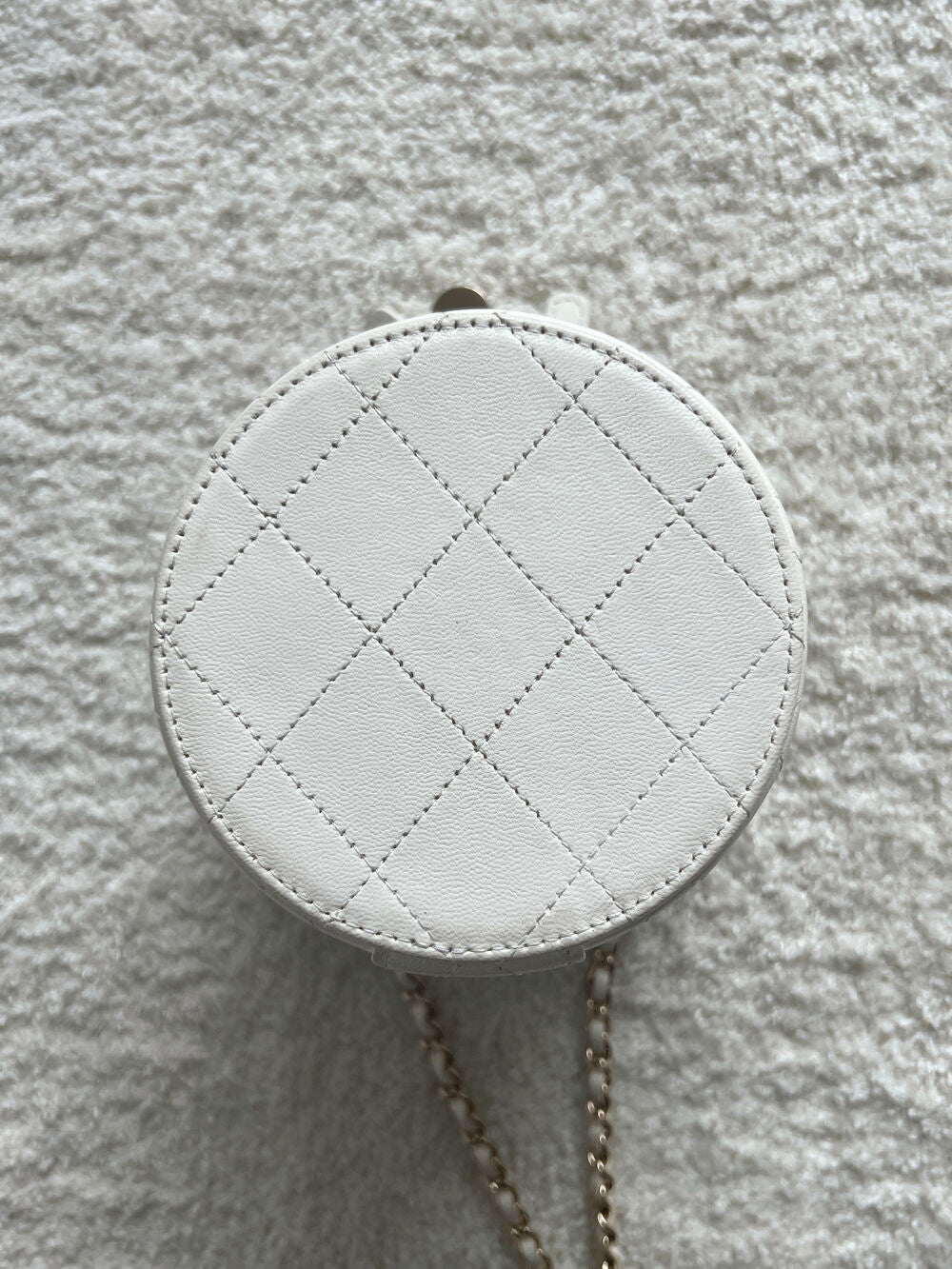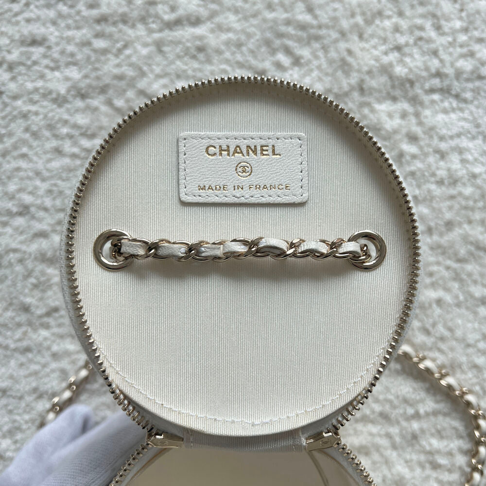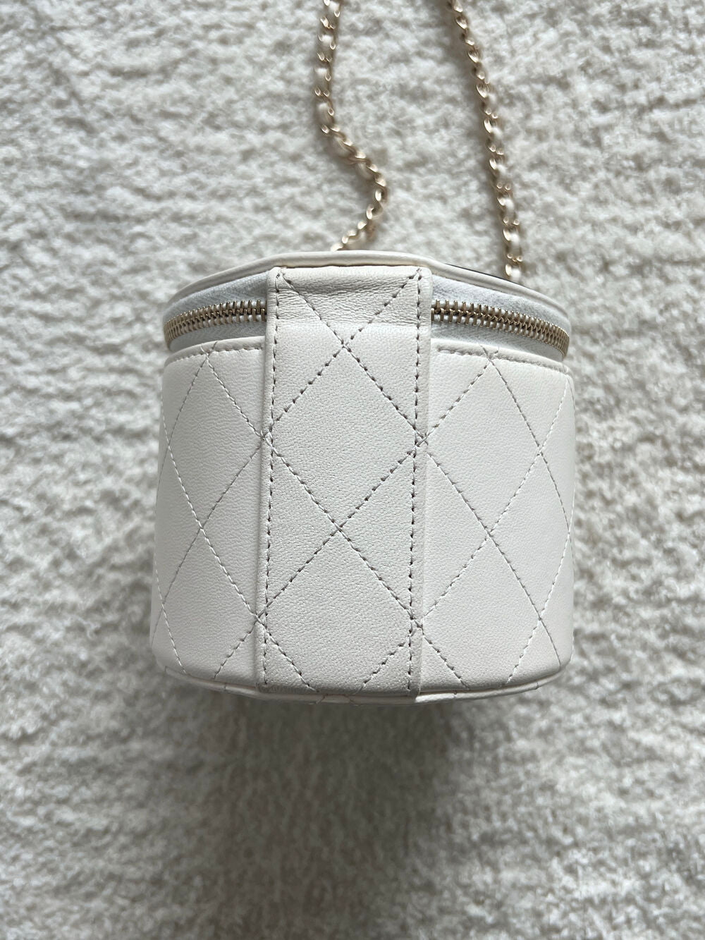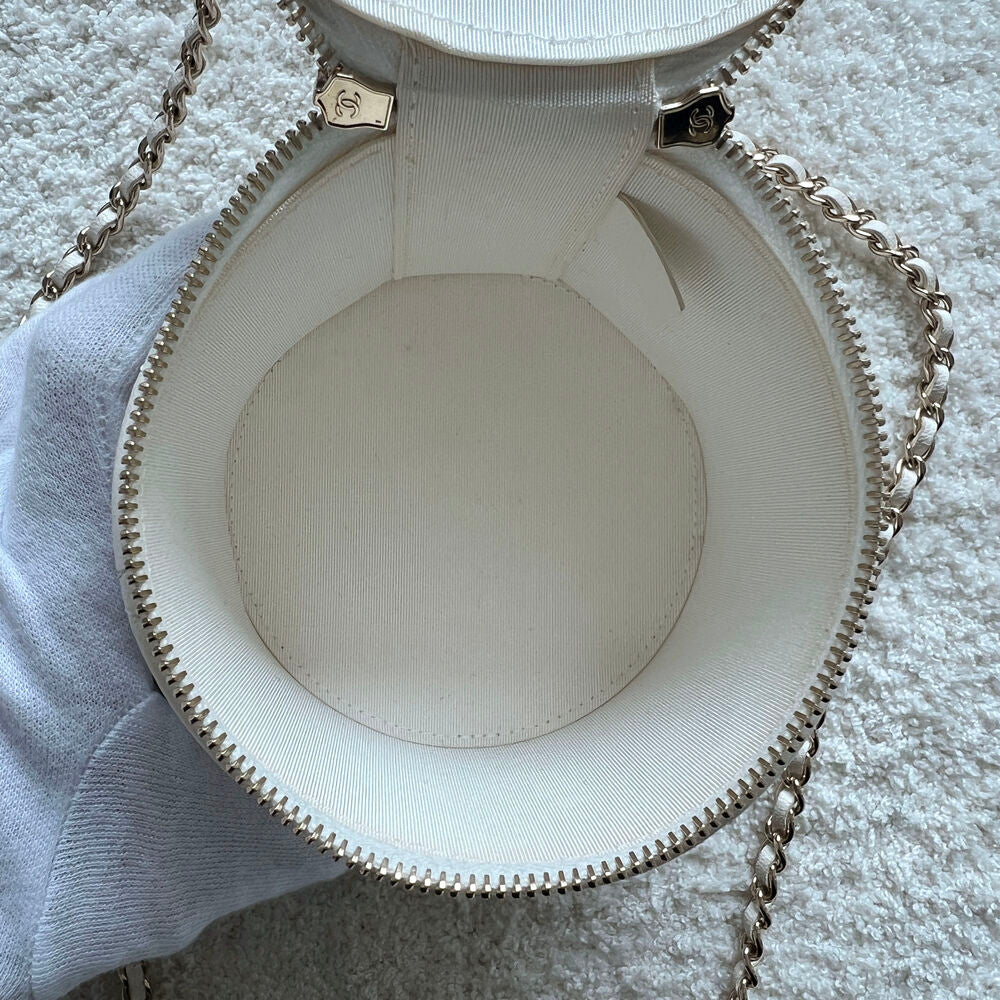 Originally released as a 2021 Spring/Summer seasonal limited edition, the Chanel CC Logo Vanity Bag is a highly collectible piece featuring an adorable cylindrical shape. The white and black color contrast, combined with champagne gold chain detailing, adds a touch of luxury to this elegant design.