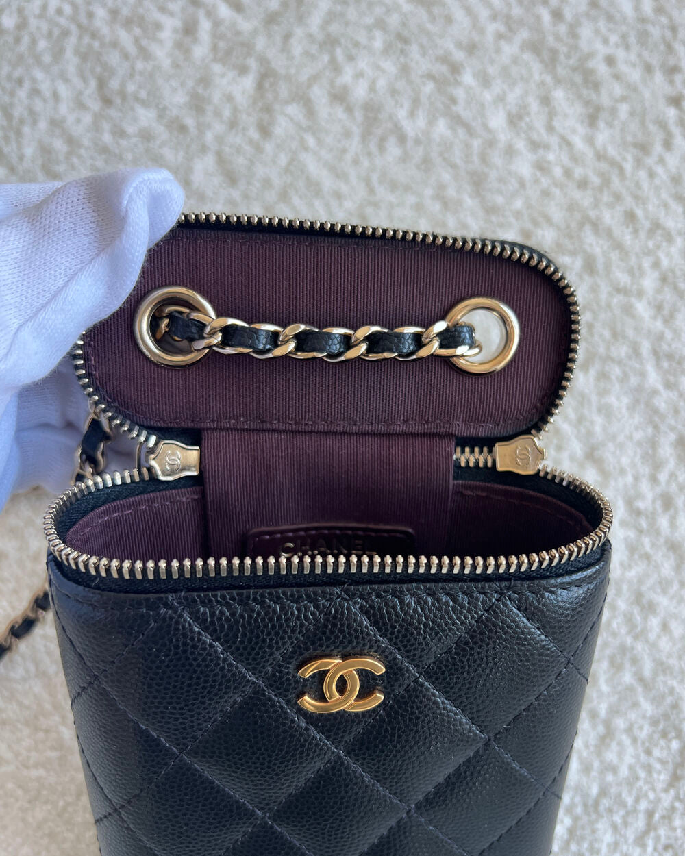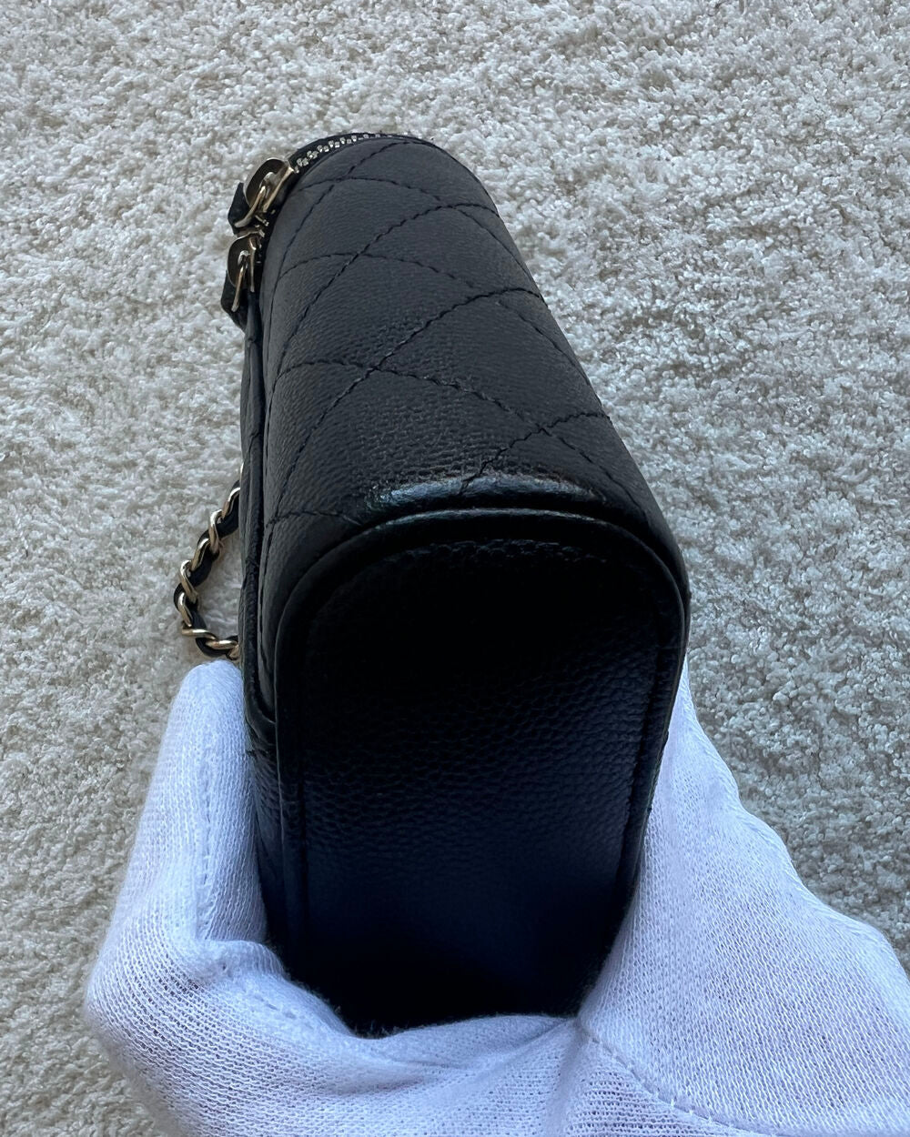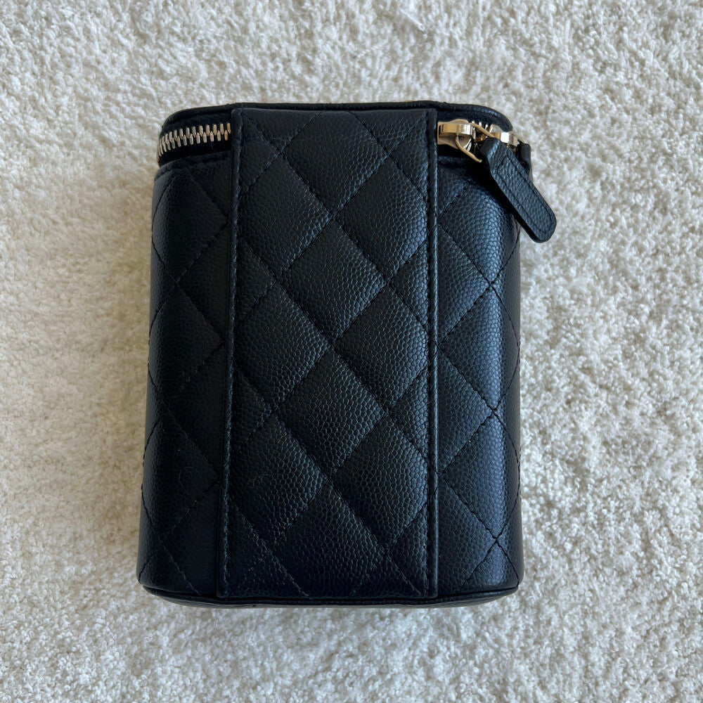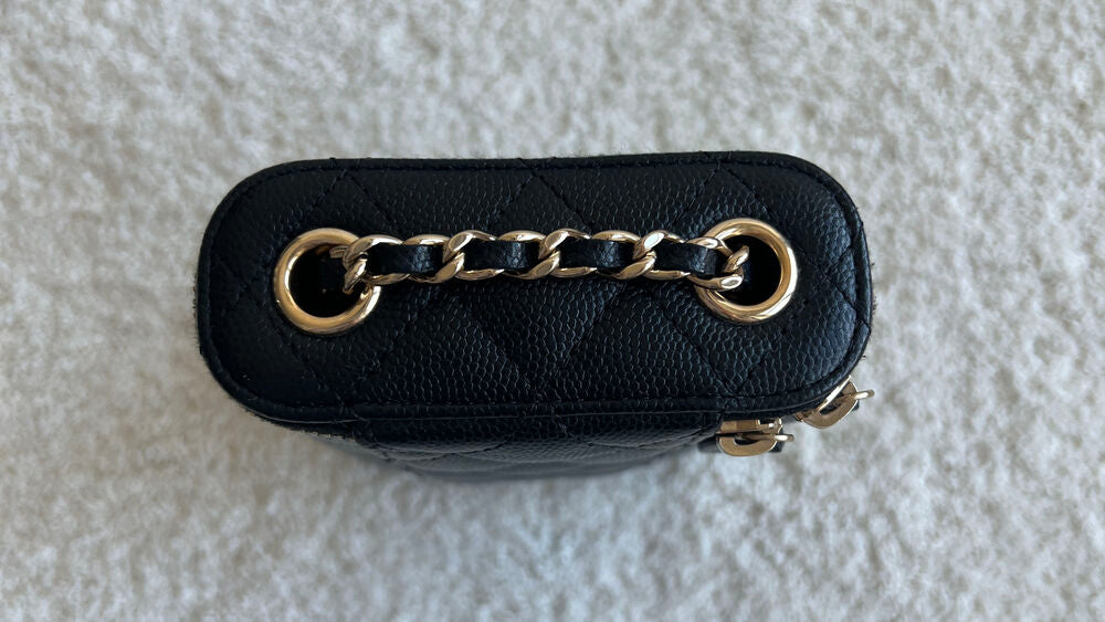 The iconic Chanel Classic Mini Vanity Crossbody Bag is now available. Made from durable caviar leather, this bag is scratch-resistant and offers more storage space than typical vanity bags, making it both practical and stylish. Both the exterior and interior are in excellent condition.
