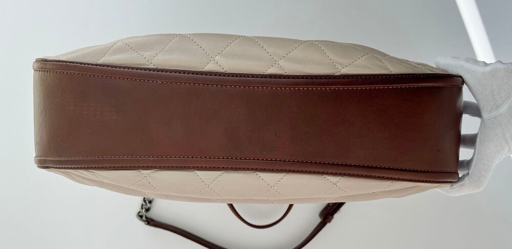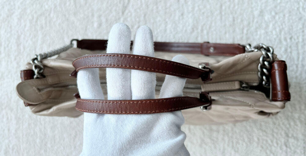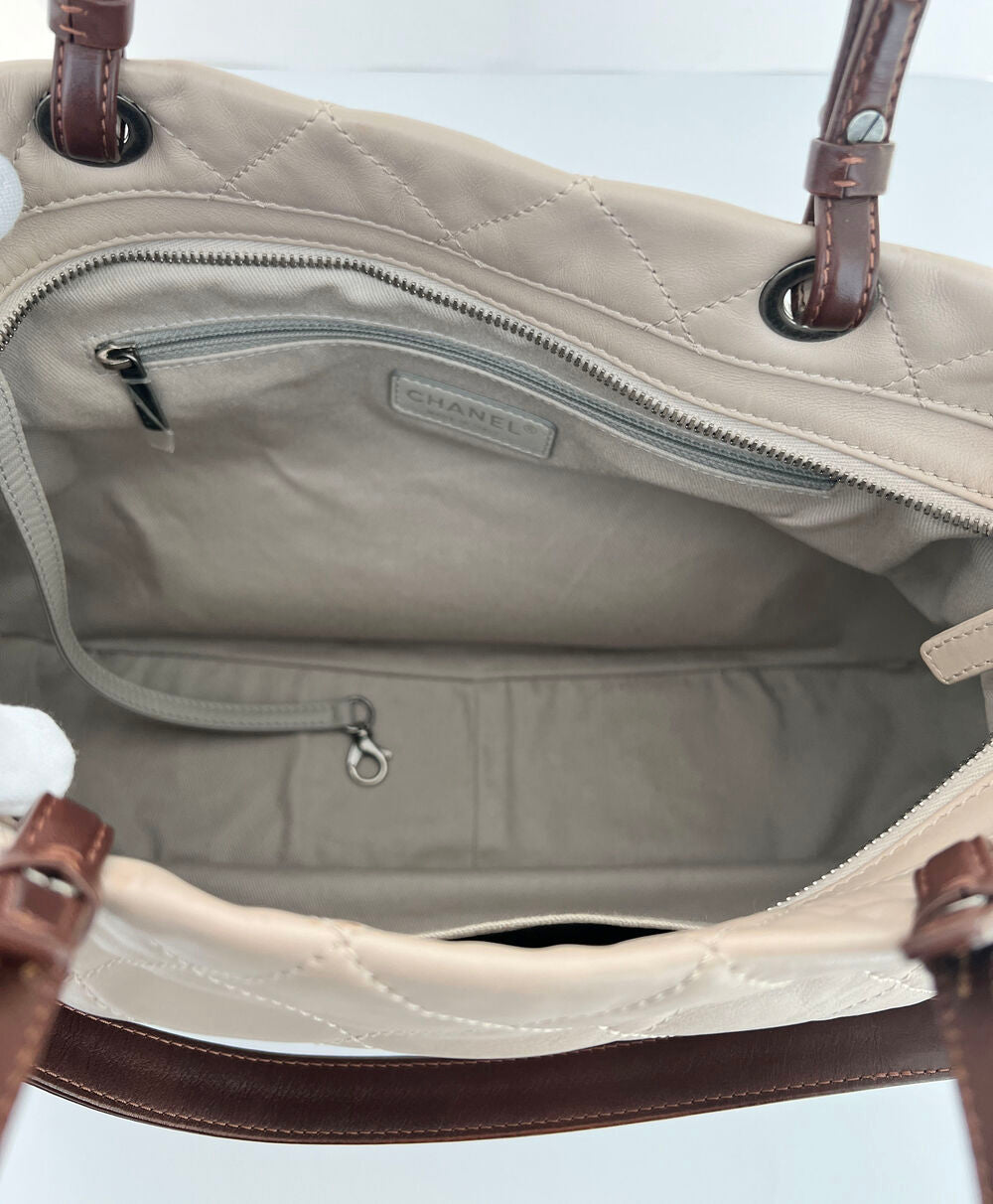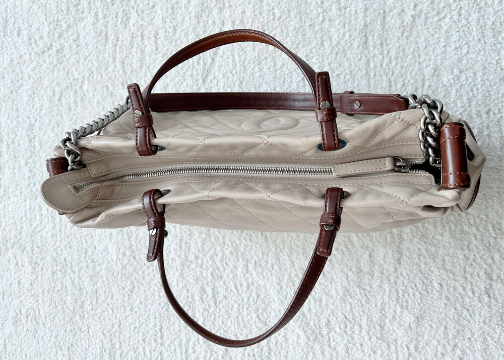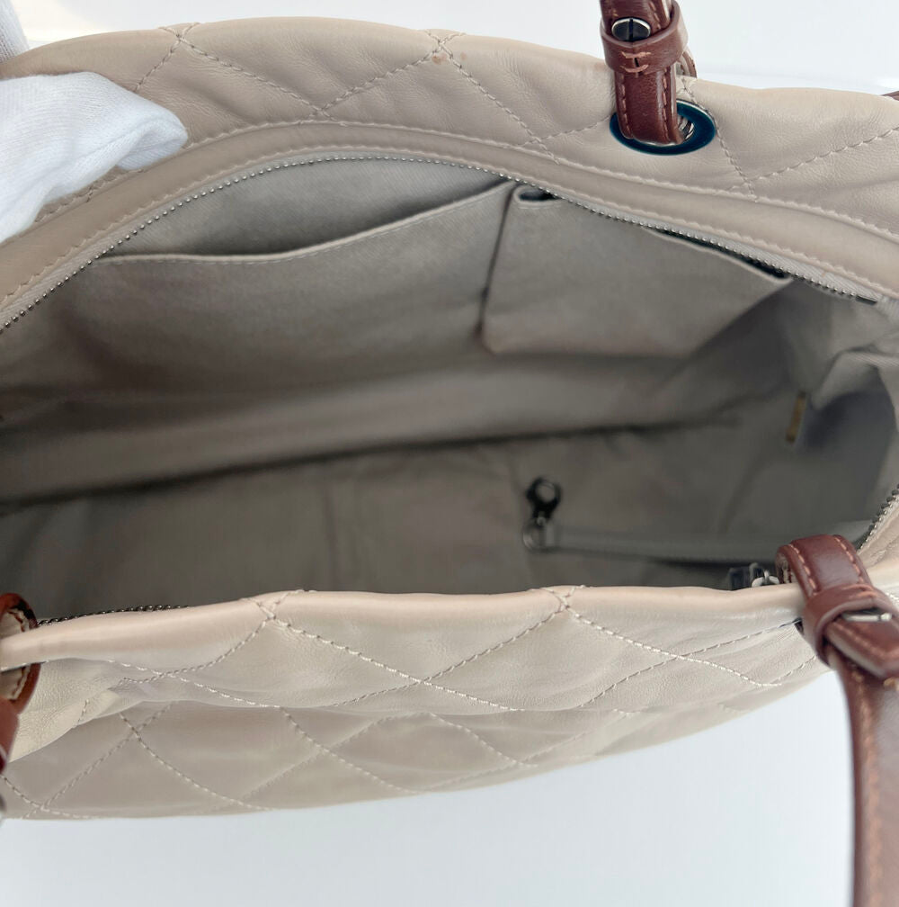 This shopper bag, crafted in Italy in 2012, offers versatility with both tote and shoulder-wear options. It provides excellent storage capacity while remaining relatively lightweight compared to other large bags, thanks to its lambskin construction. Although there are natural signs of use, such as minor scratches and creases, the overall condition is clean and well-maintained.