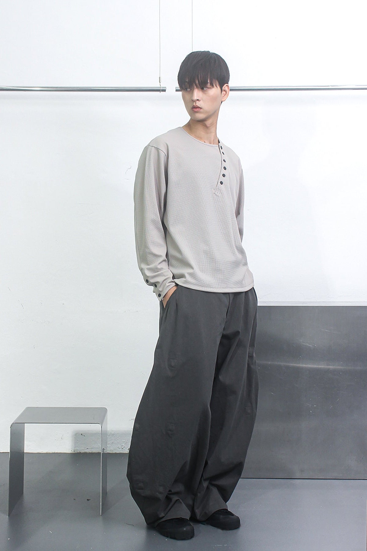 A waffle-textured henley neck complete with rearranged closures and sleeves and stitched accents.