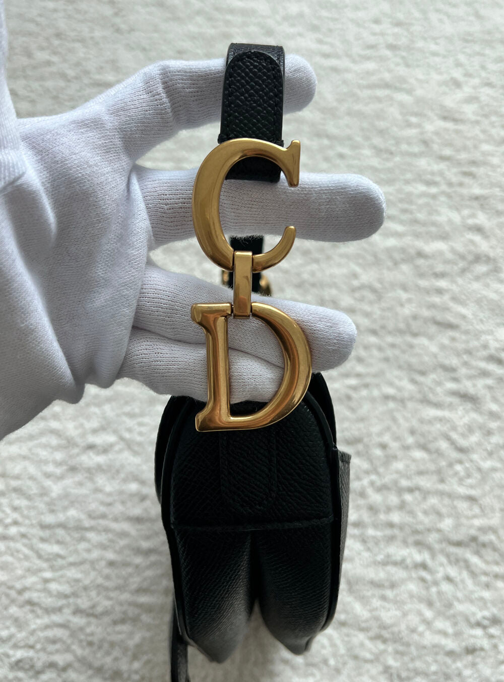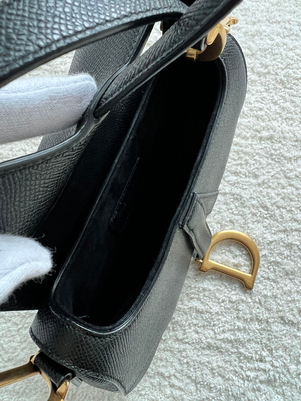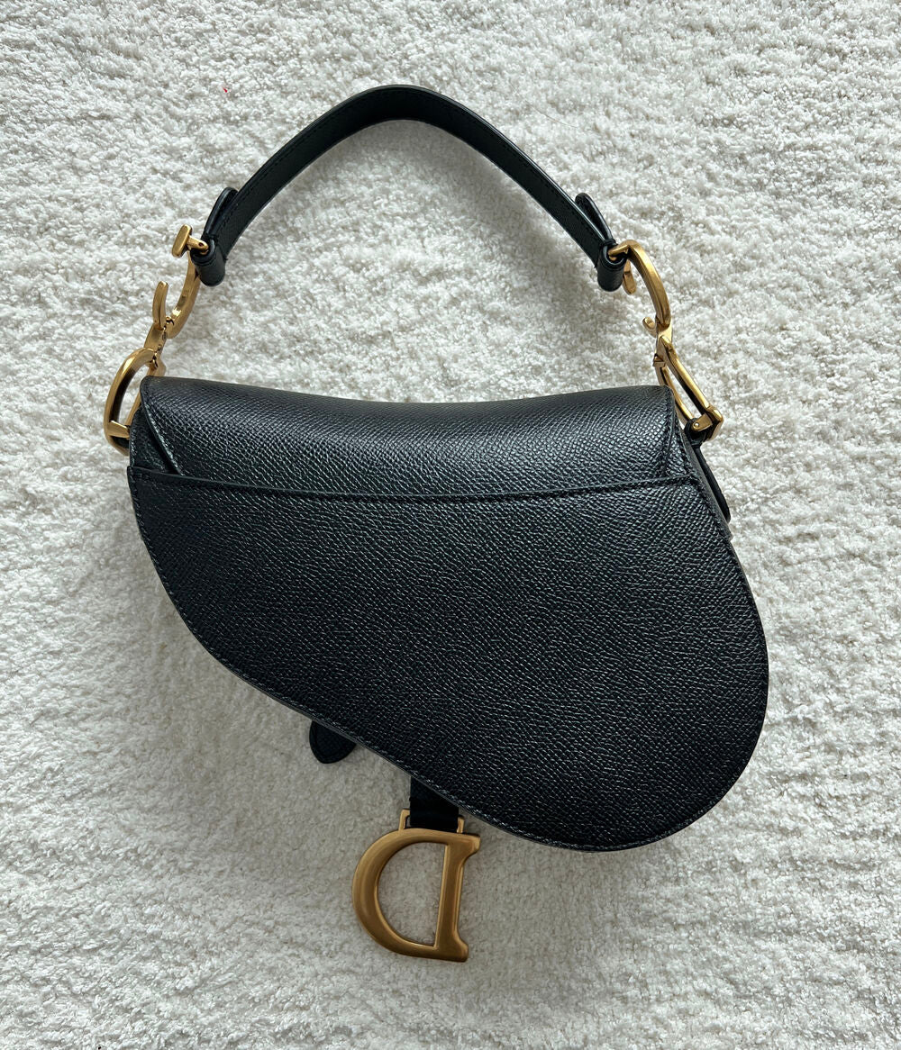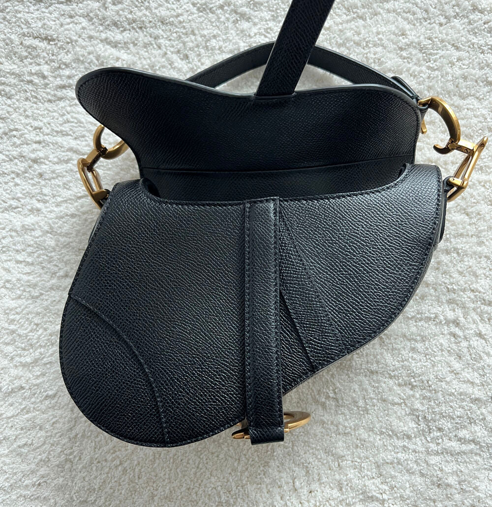 The Dior Saddle Bag, designed by John Galliano in the 1990s, was inspired by a horse's saddle, featuring the iconic split at the bottom and a CD logo connected to the handle. This bag became a legendary "It bag," frequently seen on the arms of "It girls" of the era. It was revived with great fanfare in the 2018 Dior FW collection. Despite its mini size, the Saddle Bag offers versatile styling options, making it perfect for daily wear. The bag is crafted from durable grained calfskin and remains in excellent condition with minimal signs of use, complete with its full set of accessories.