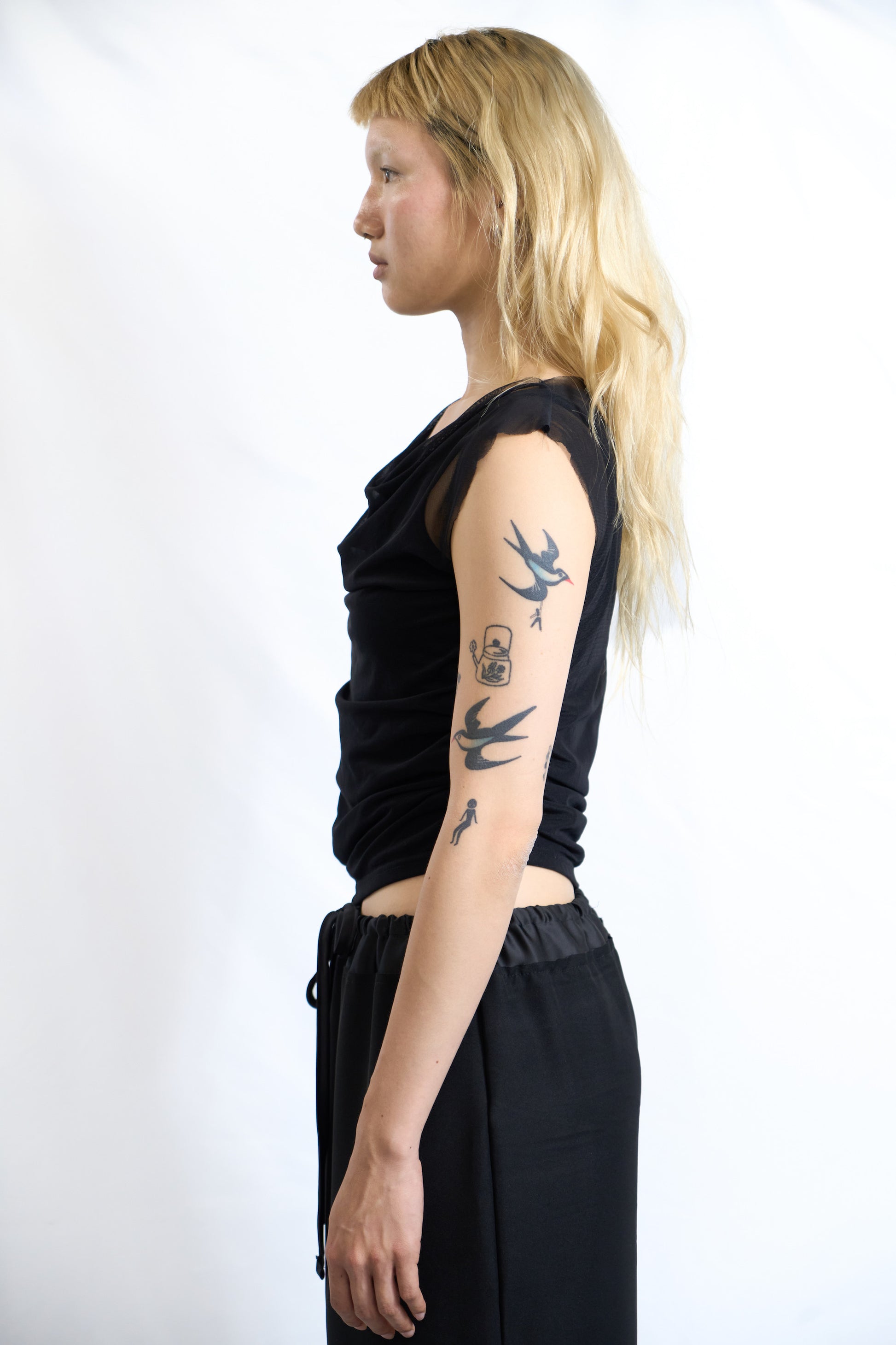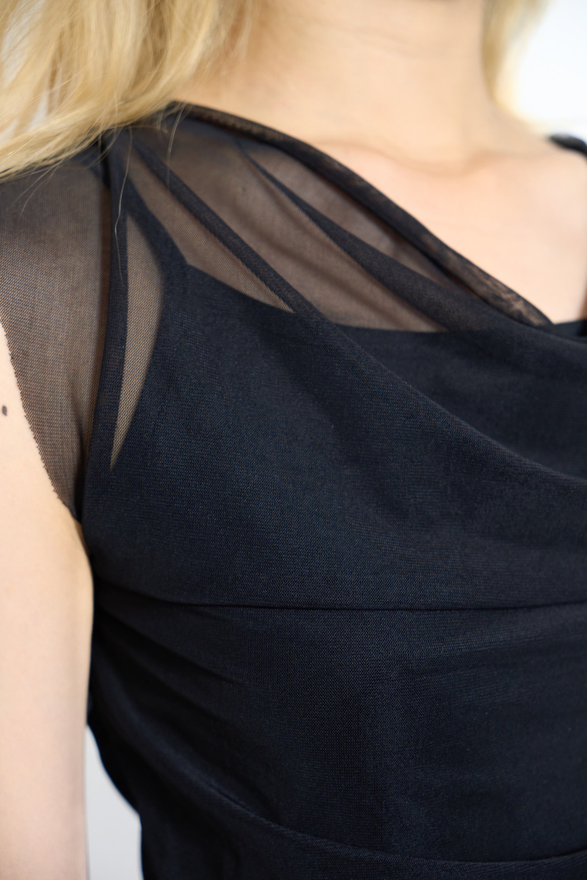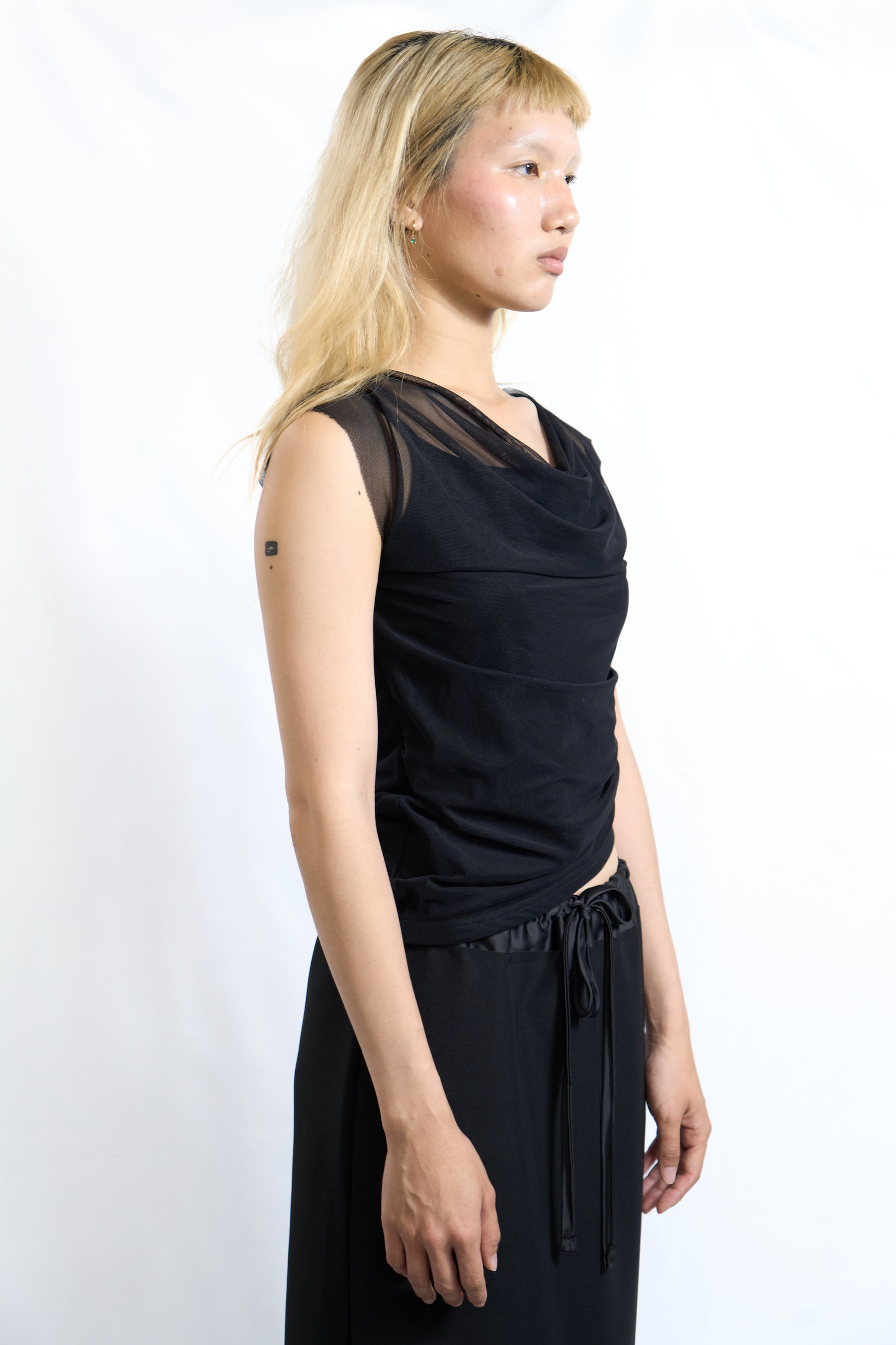 A sleeveless top designed with a soft draped neckline and sheer mesh overlay. The piece features a built-in camisole lining for comfort and coverage, while the lightweight mesh adds a layered visual depth. Slight gathers along the side enhance the contour of the body, balancing delicacy with structure.