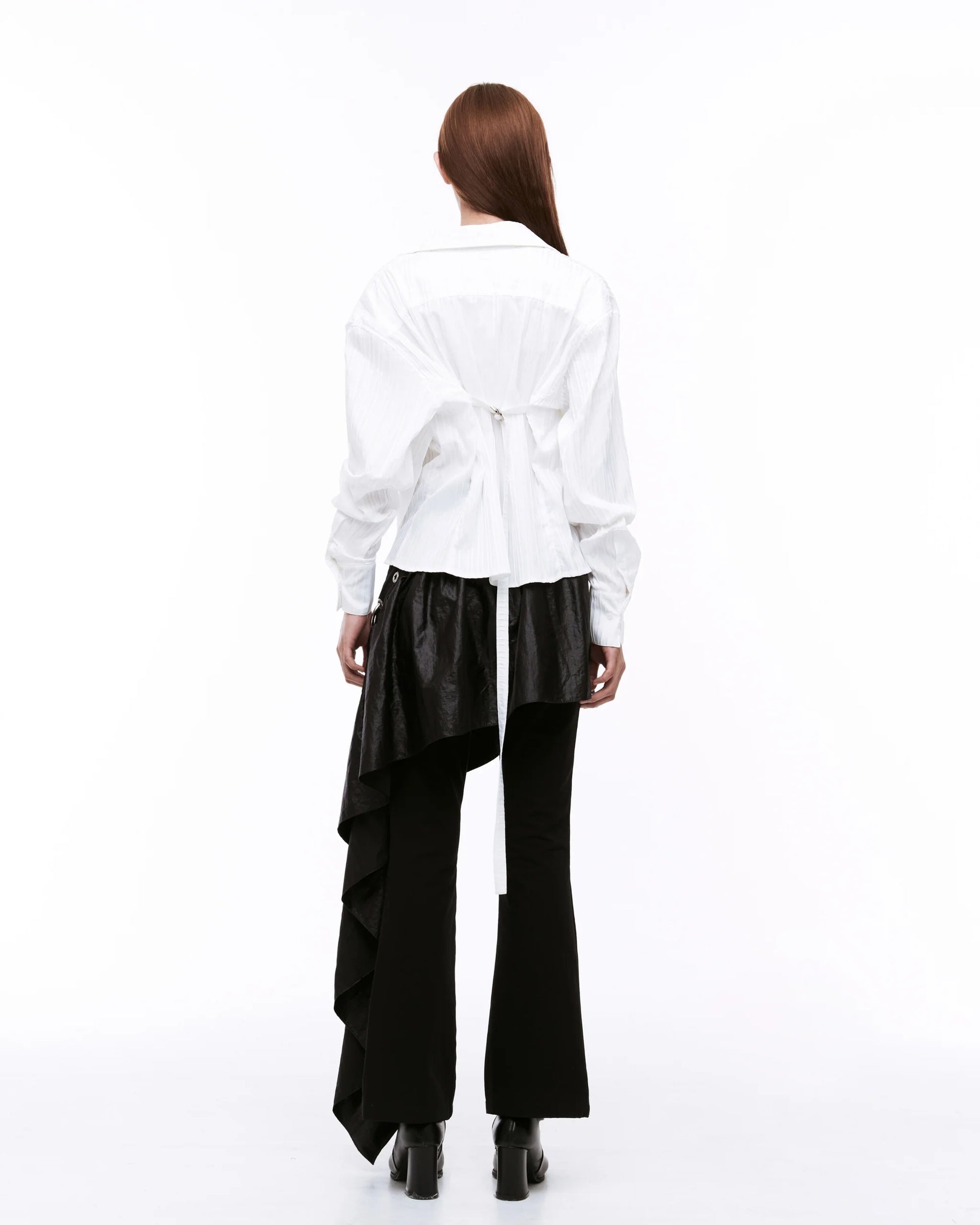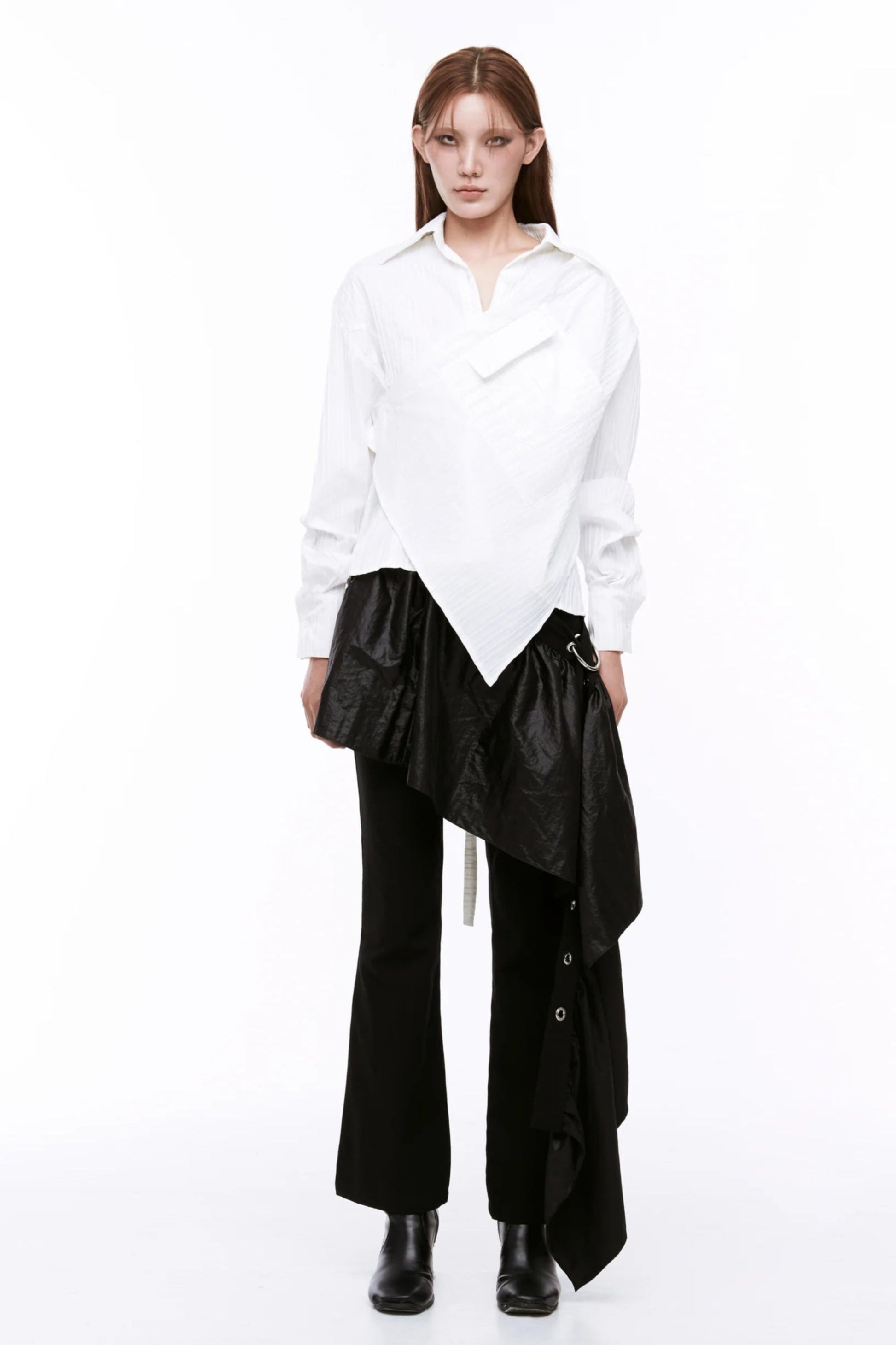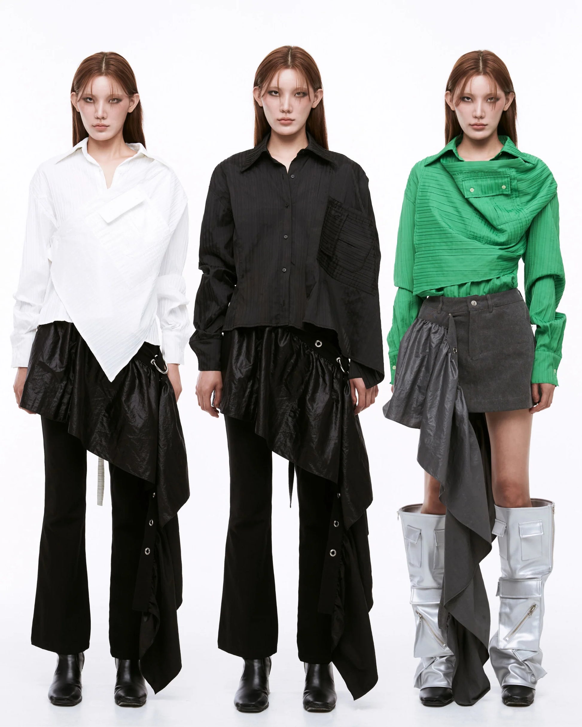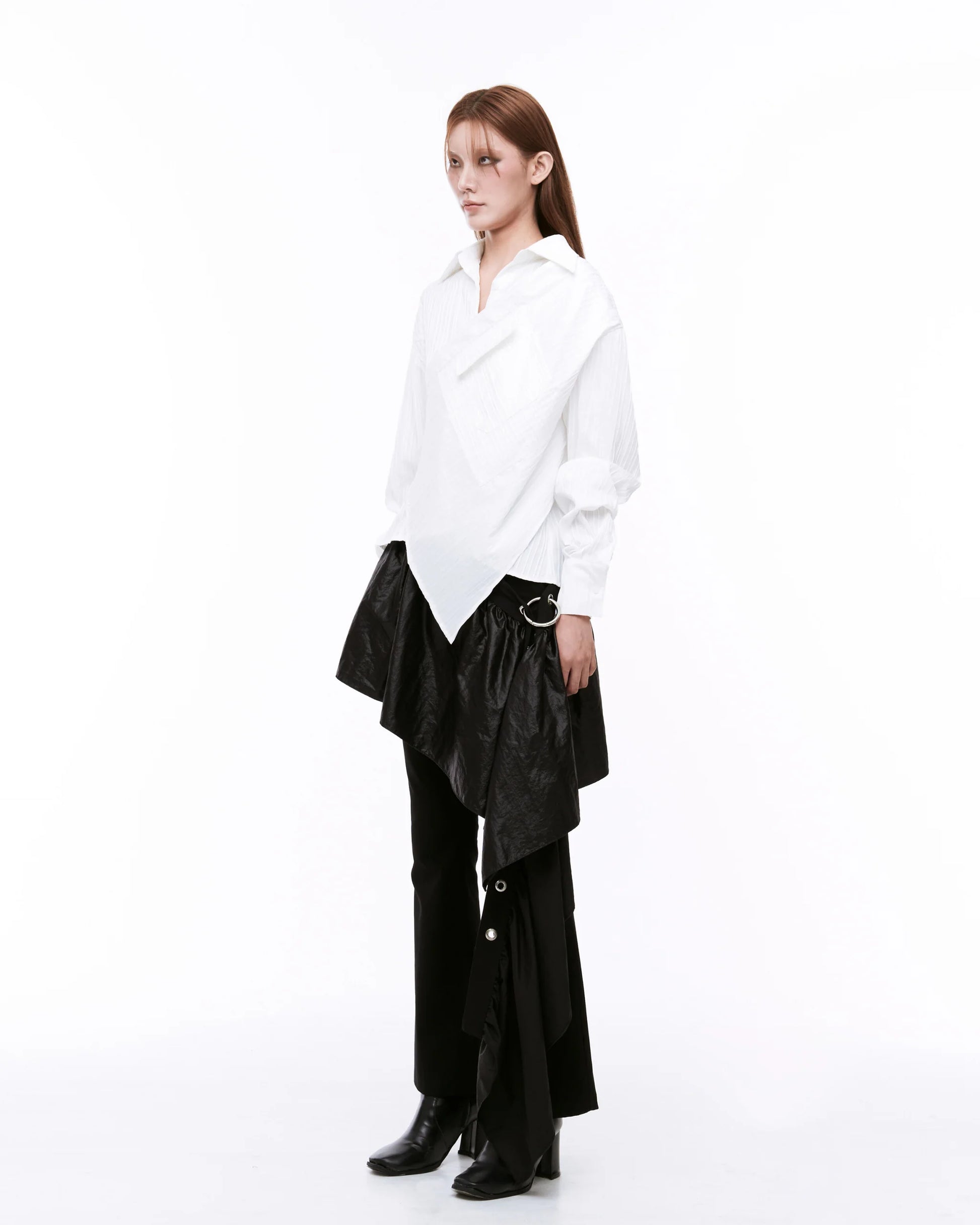 The draping shirt features pleated fabric with a long gun flap on one shoulder, allowing for versatile styling.