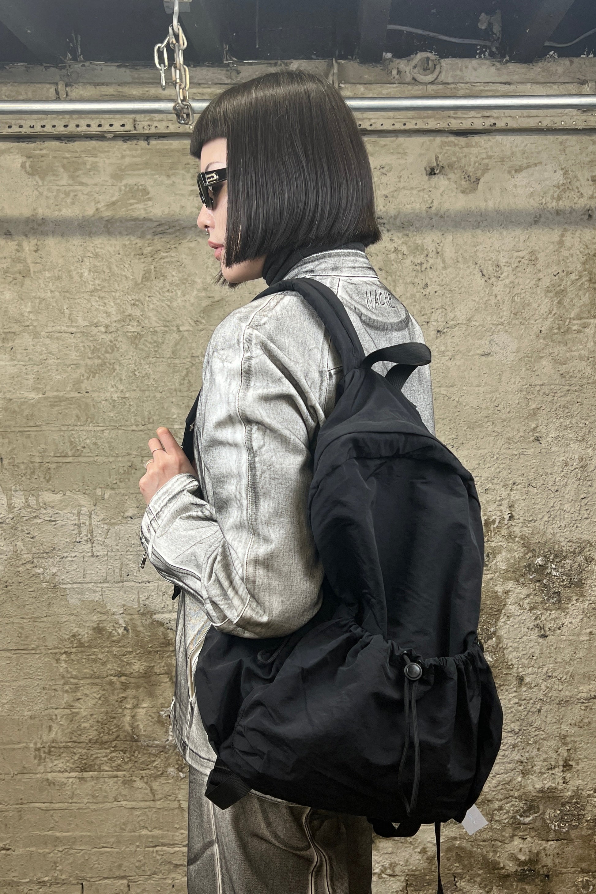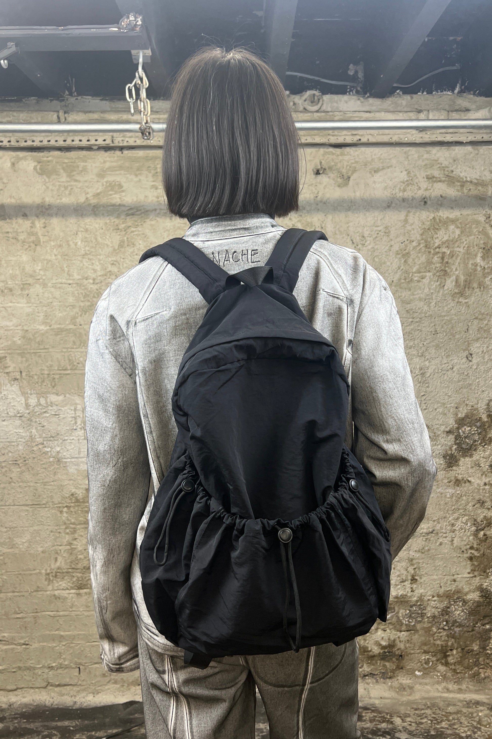 A backpack with three external pockets featuring cordlock details that create ruched accents.
