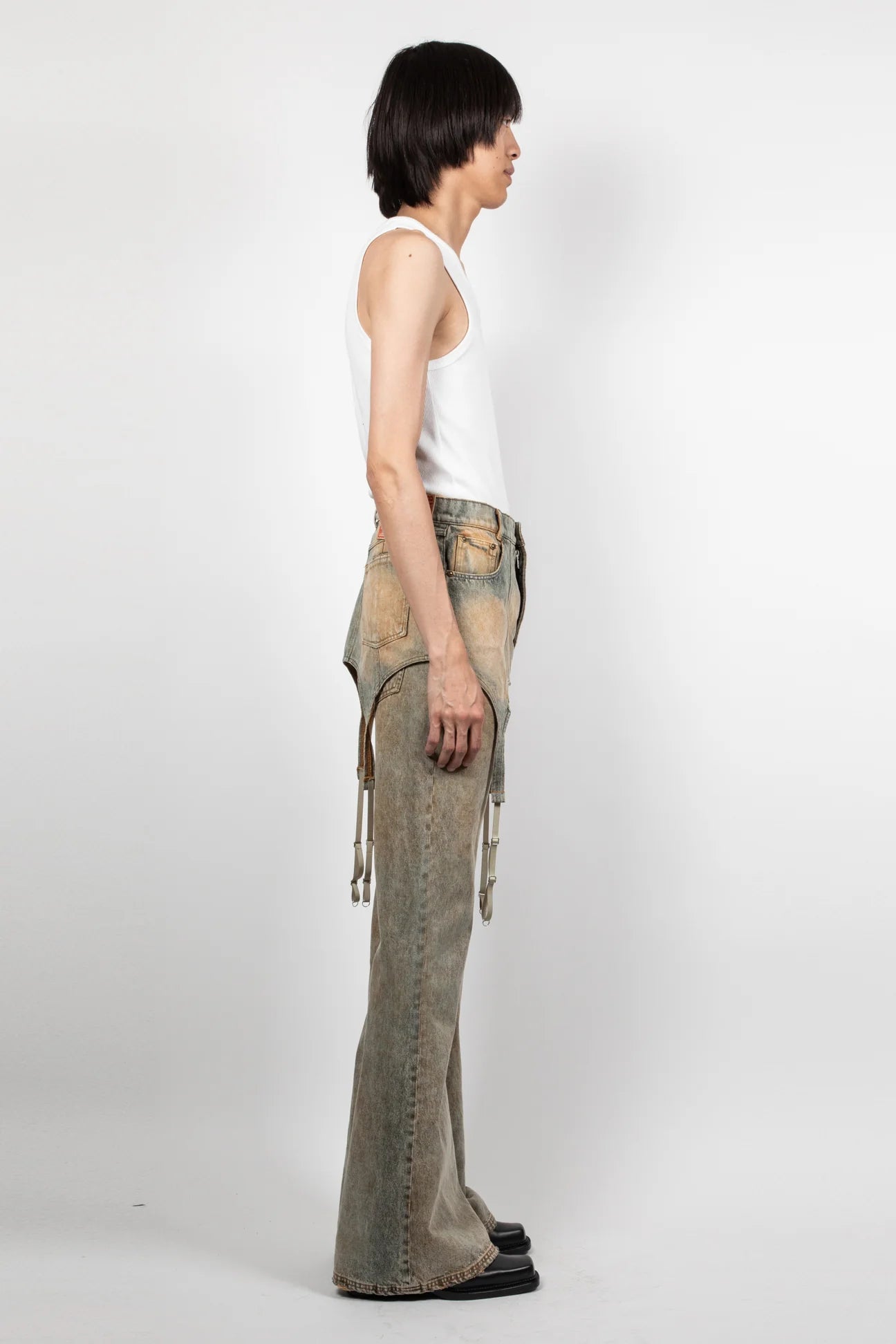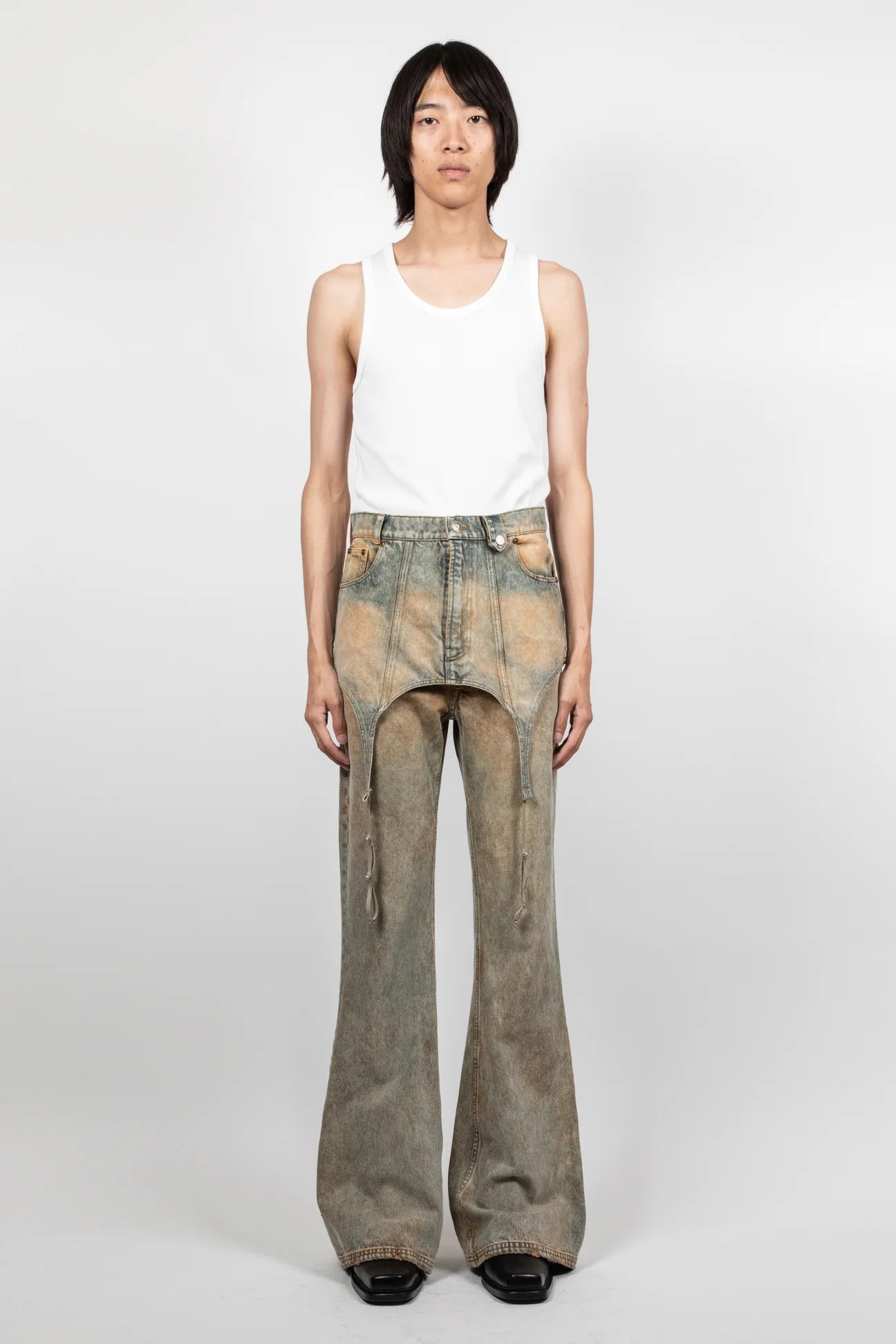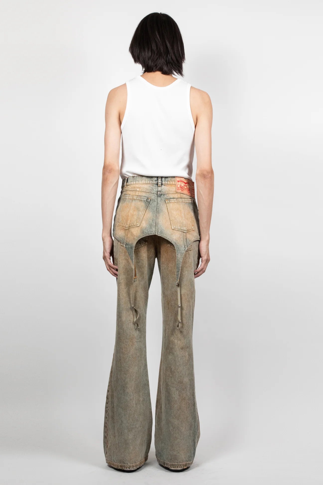 This garter skirt comes in a champagne stonewashed finish and features 5 pockets styling, tan contrast stitching, bronze hardware tone, a zip-fly, and a leather brand patch at the back waistband.