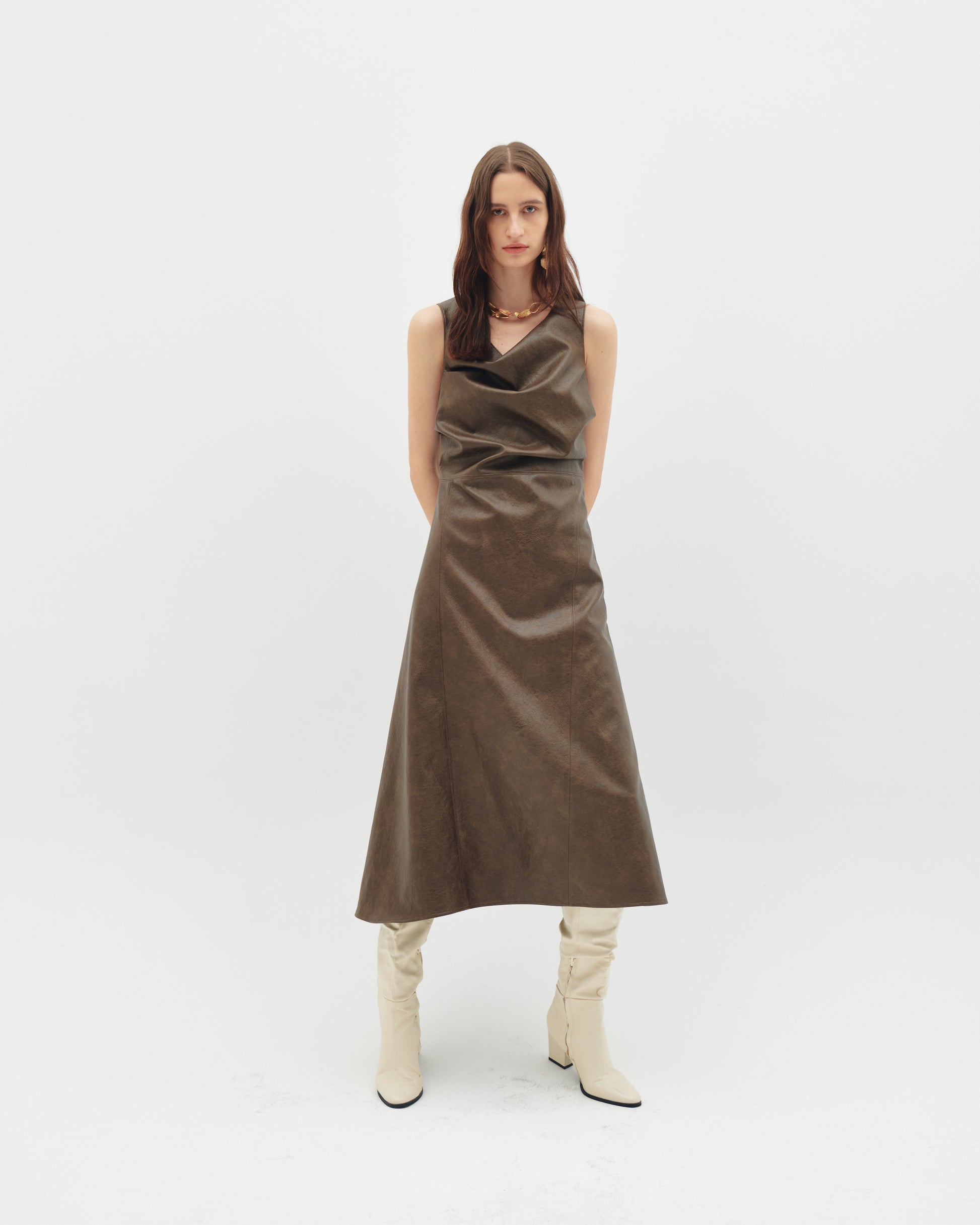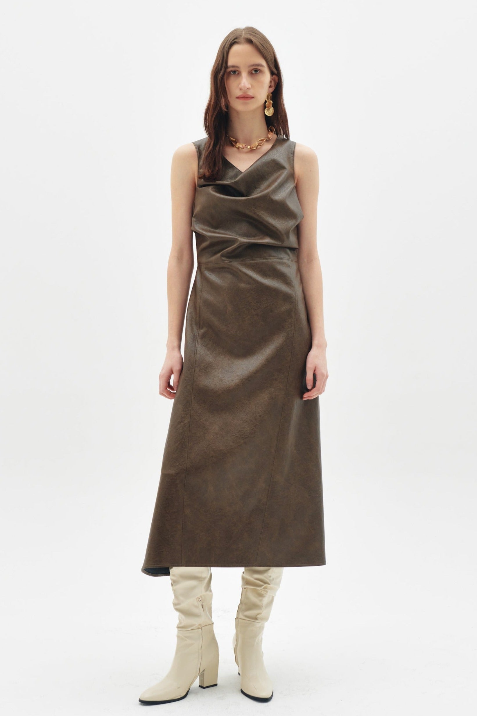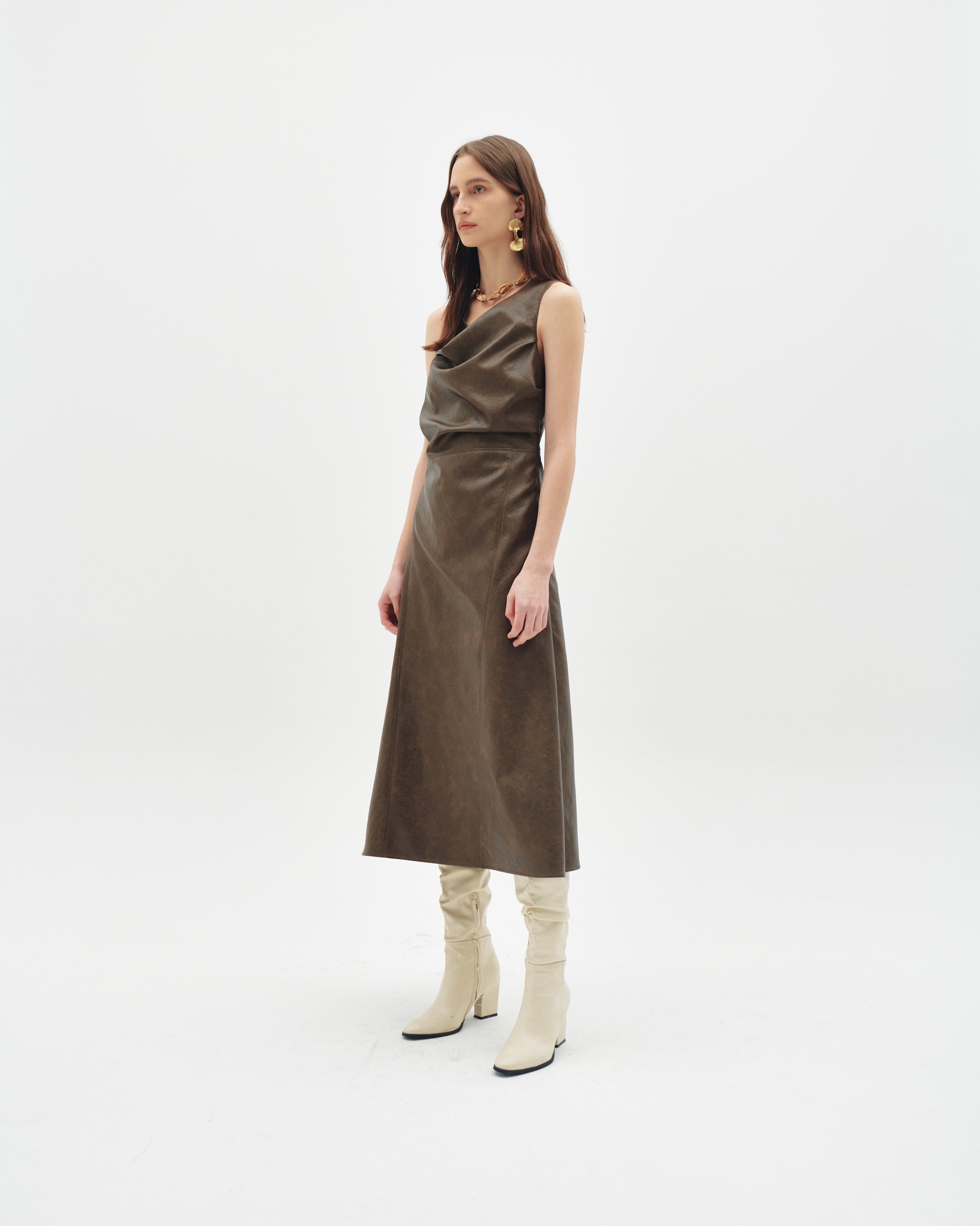 This draped dress features a draped asymmetric neckline and faded-effect faux leather, providing a stylish and contemporary look while ensuring comfort.