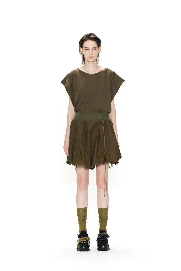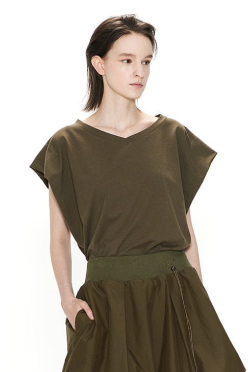 Recycled Boat V-Neck Sleeveless Top An avant-garde top with a unique asymmetrical hemline. Made from recycled fabric, promoting sustainable fashion.