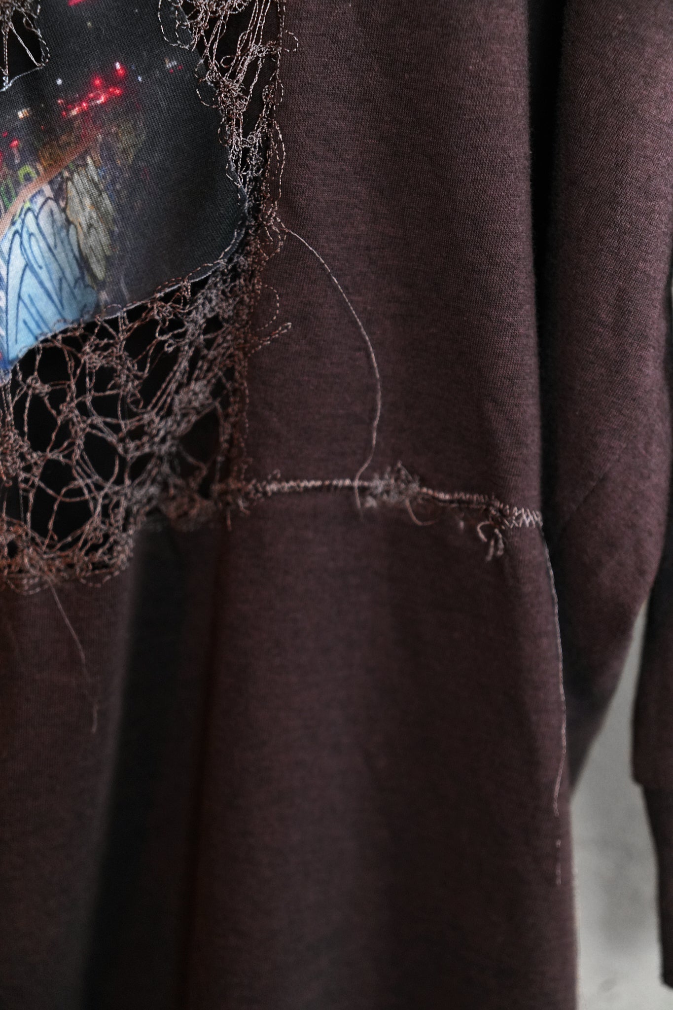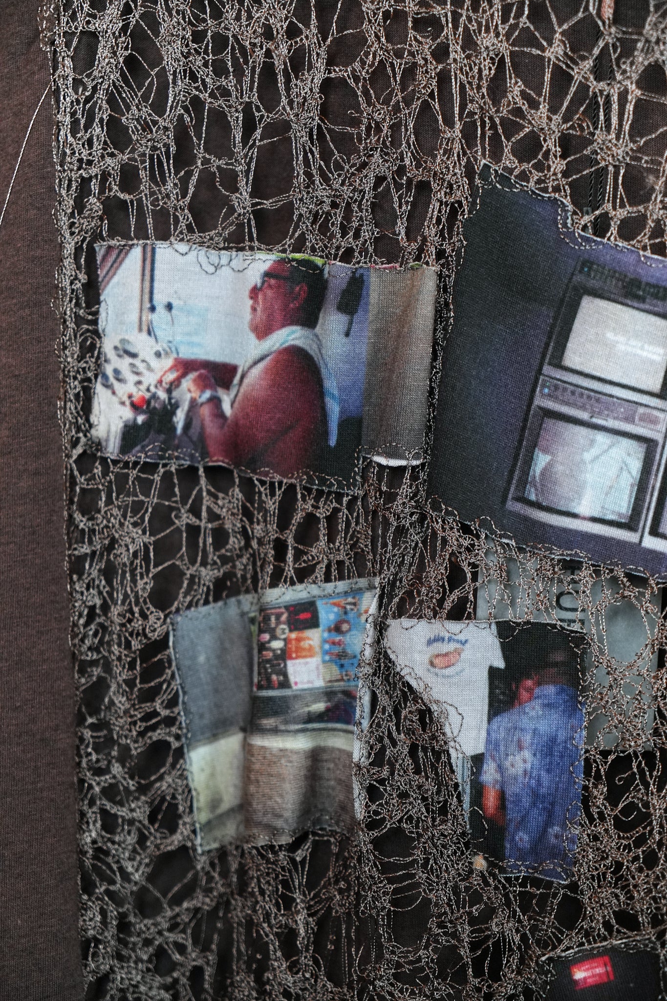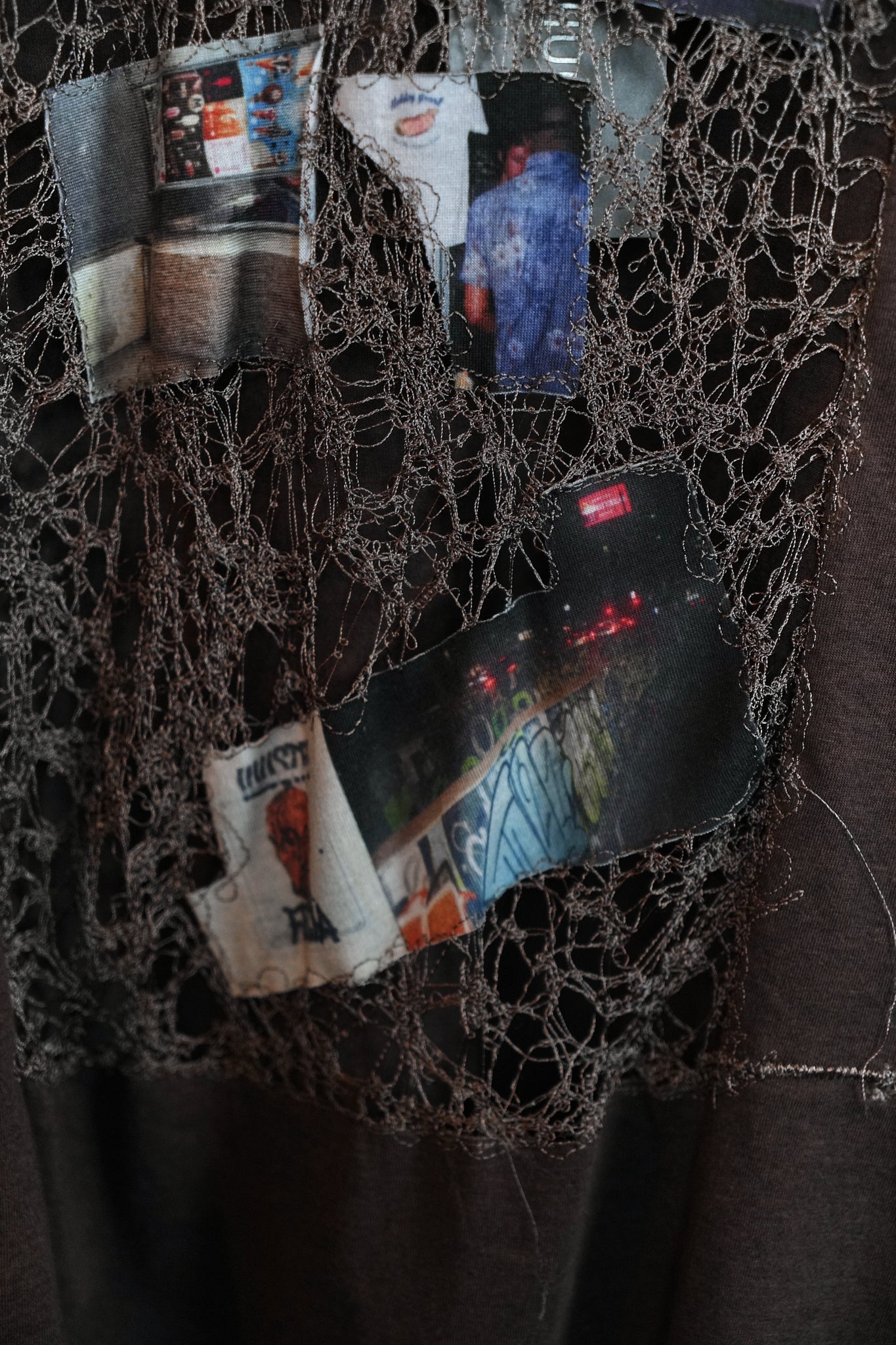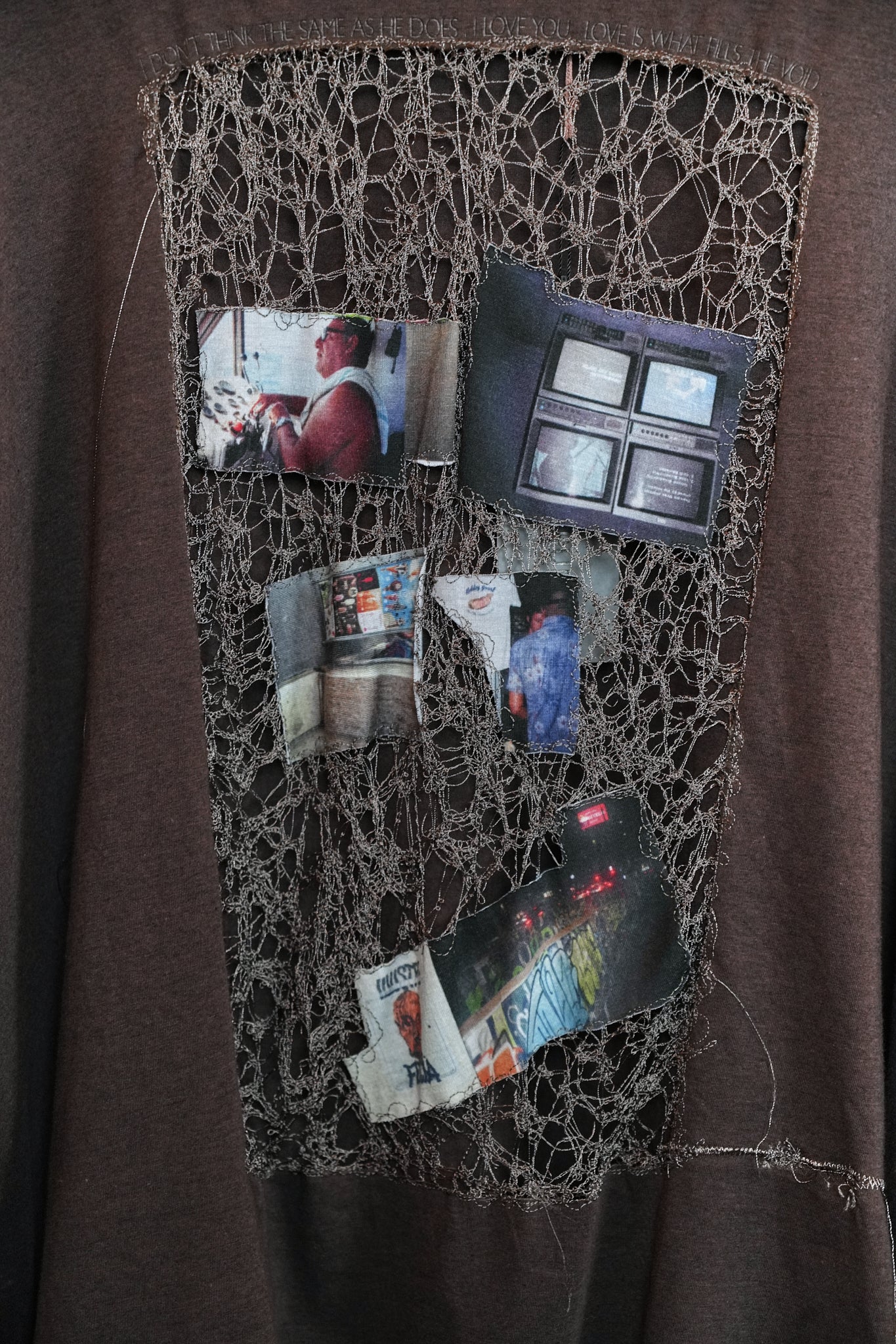At the front center, layered photo-inspired patches are hand-appliquéd, intersected with tangled and expressive stitching—a raw yet deliberate design that makes each garment one of a kind. The earthy brown base offers a grounded tone, while the contrasting threads add visual dynamism.