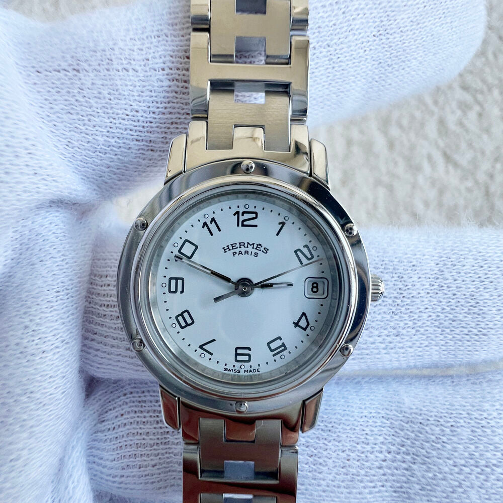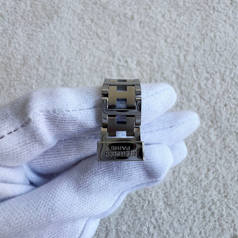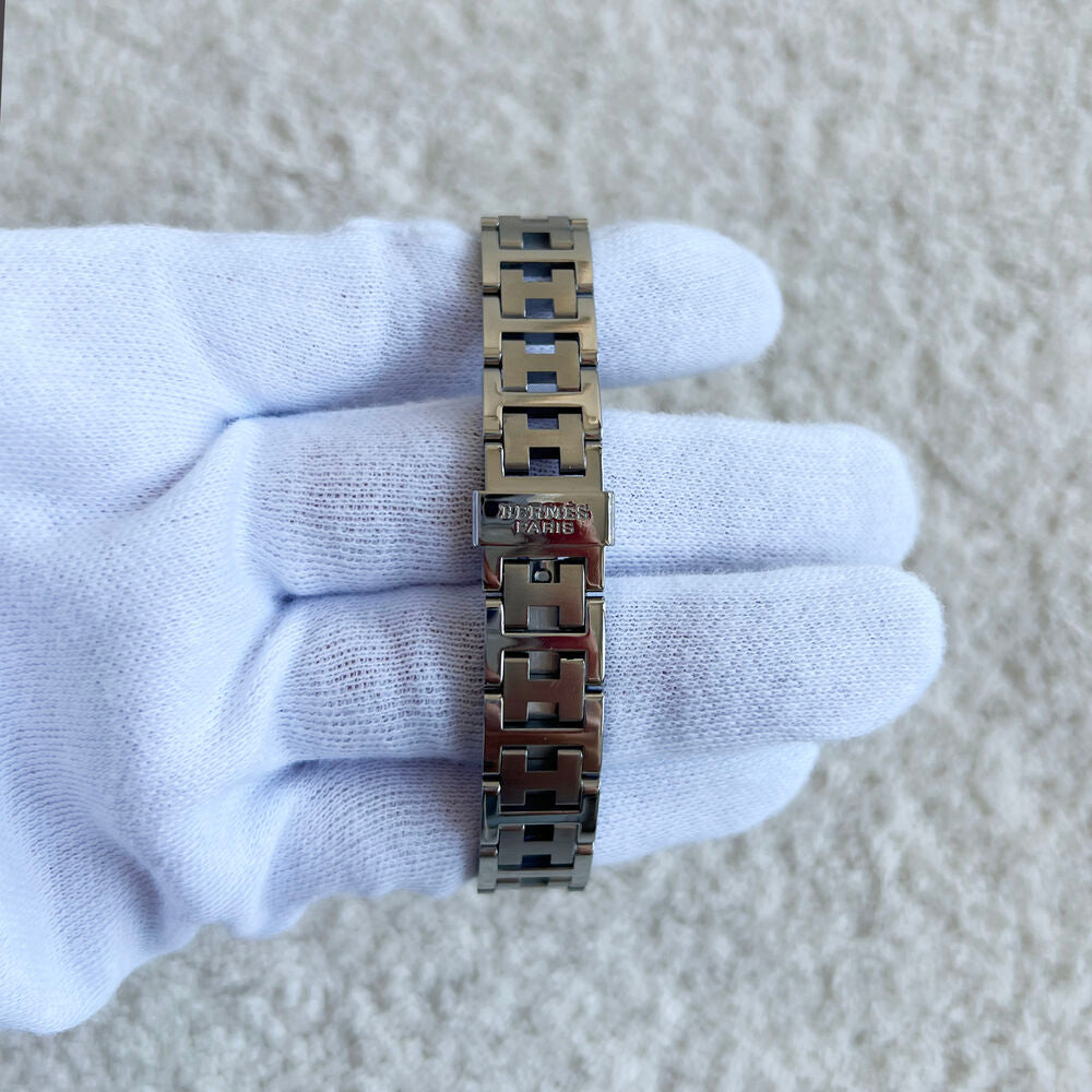This is the vintage Hermes Clipper Watch, a discontinued model that’s highly sought after. It features a popular silver color with a white bezel and the iconic H-point bracelet. The sapphire crystal glass is scratch-resistant, and there’s a practical date window at the 3 o’clock position. Powered by the reliable ETA quartz movement, with regular battery changes, this watch will serve you well for years.