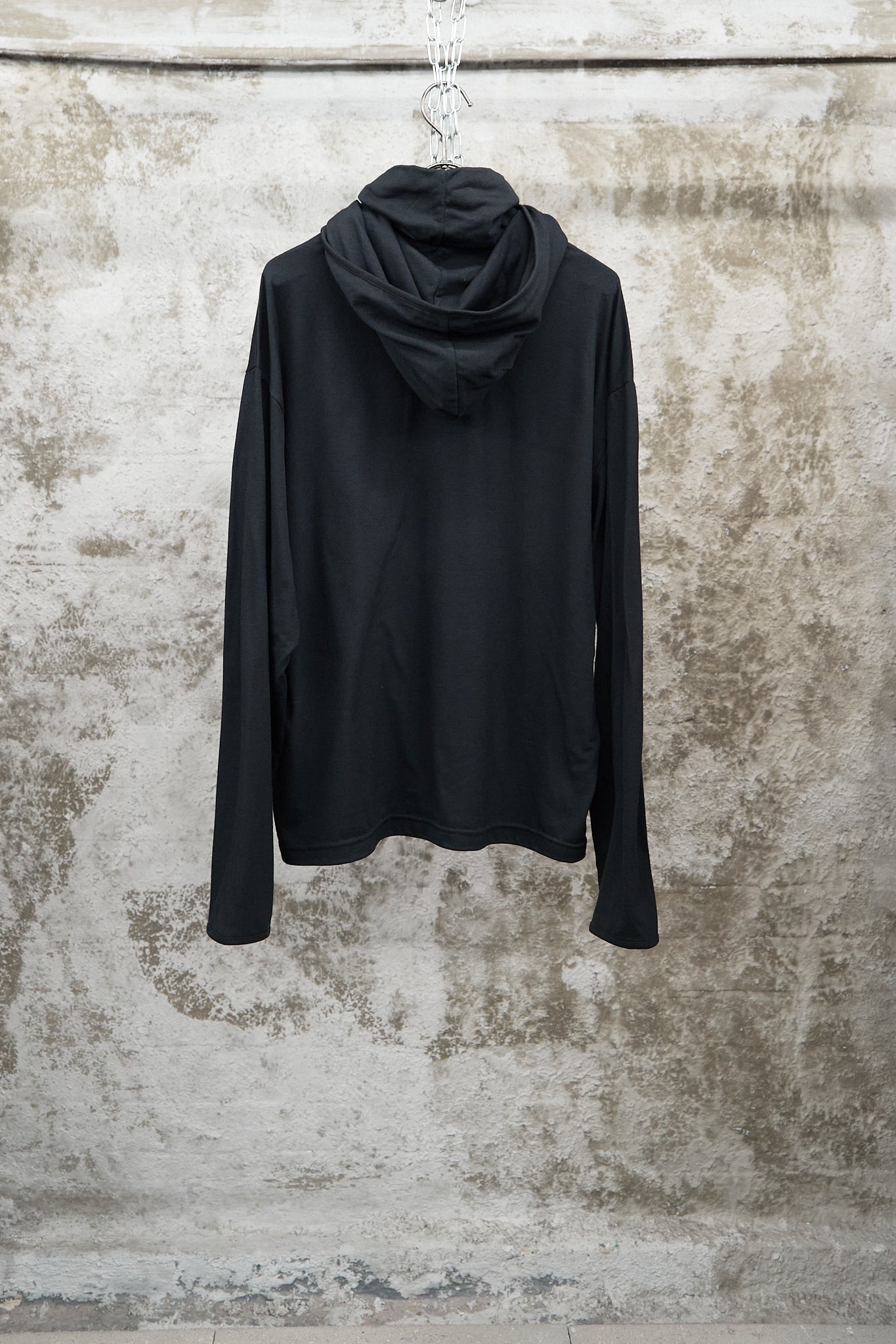 The BLACK HIGH-NECK HOODED LONG SLEEVE combines minimal design with subtle functionality. Crafted from soft, lightweight jersey fabric, it features a relaxed fit with dropped shoulders and a distinctive high-neck hood that offers both comfort and structure.