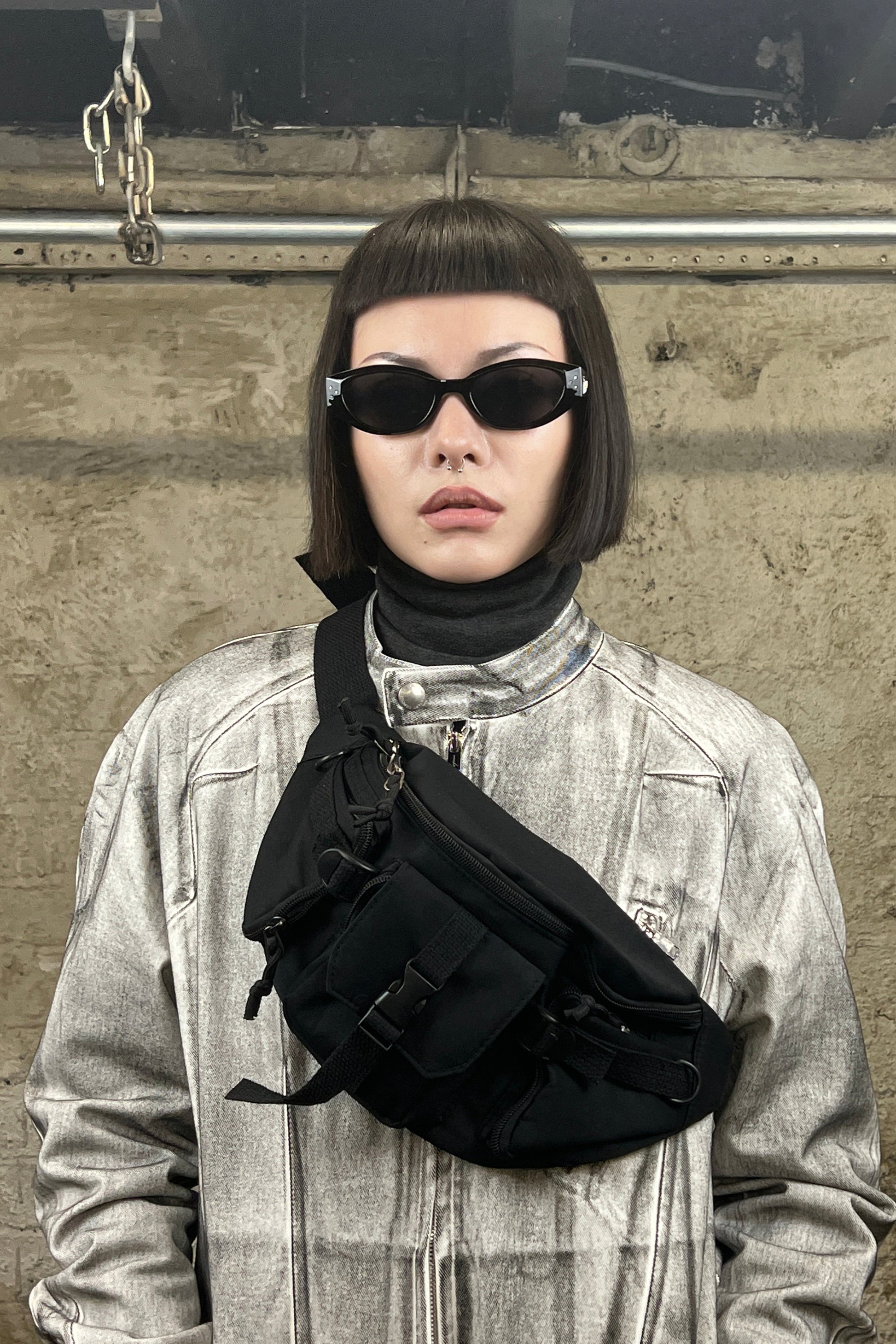 A sleek black Multi-Pocket Crossbody Bag with multiple compartments and an adjustable strap buckle.
