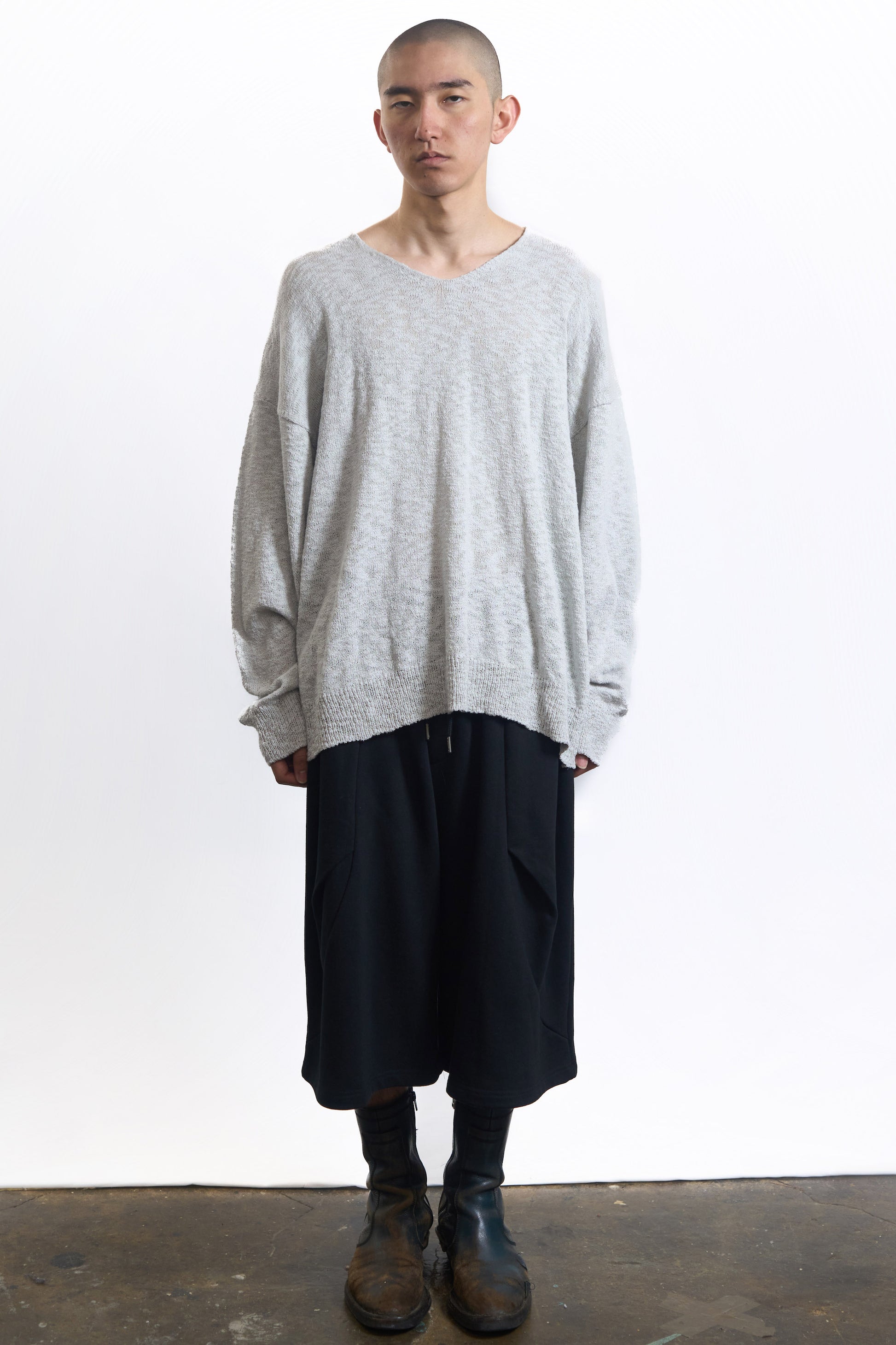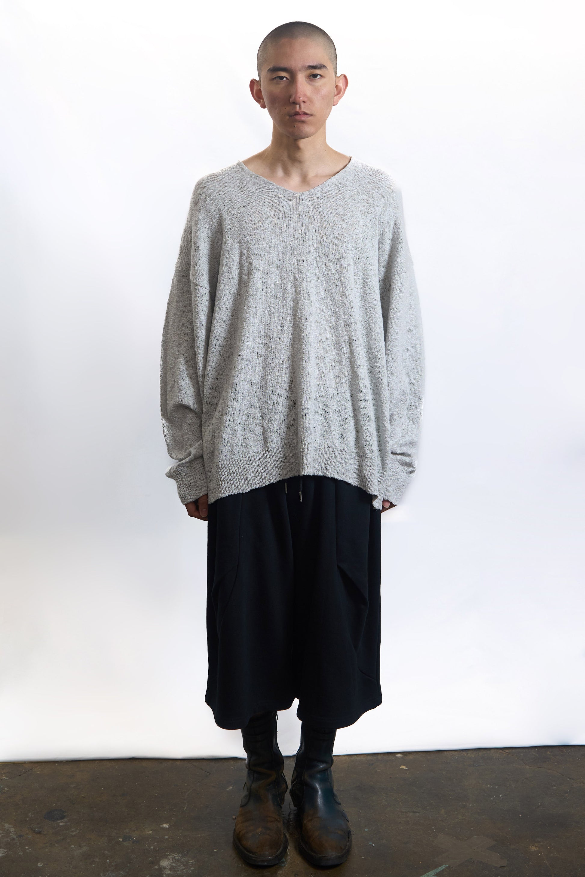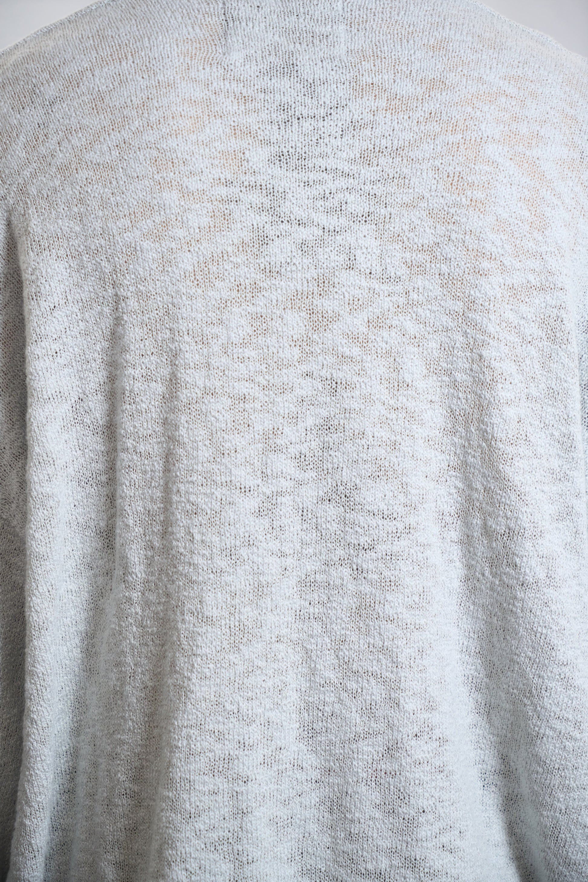 A breathable V-neck sweater made from a subtly sheer open-knit fabric, this piece is designed with a relaxed, slouchy silhouette perfect for layering through the shifting seasons.