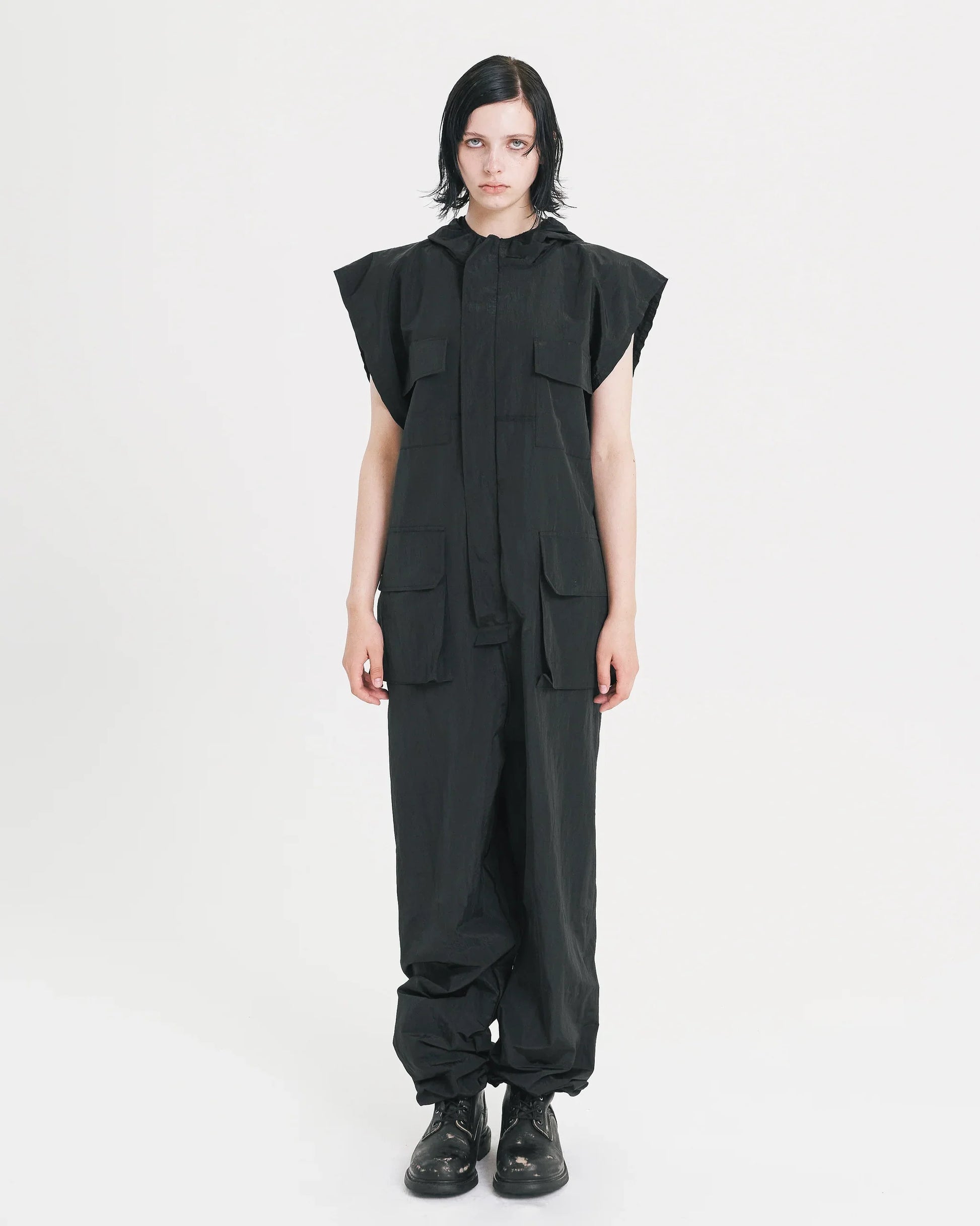 Featuring a comfortably stylish short-sleeve inside-out overall with four flap pockets, a hood, and raw-cut hems.