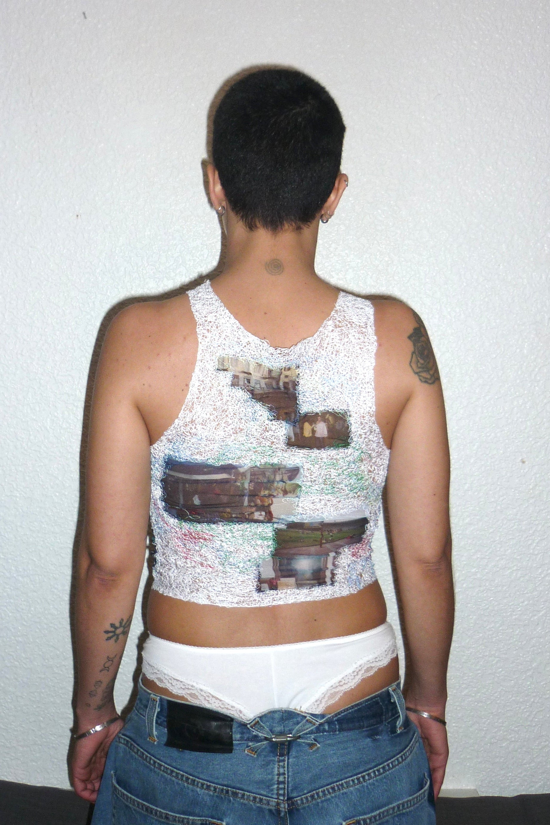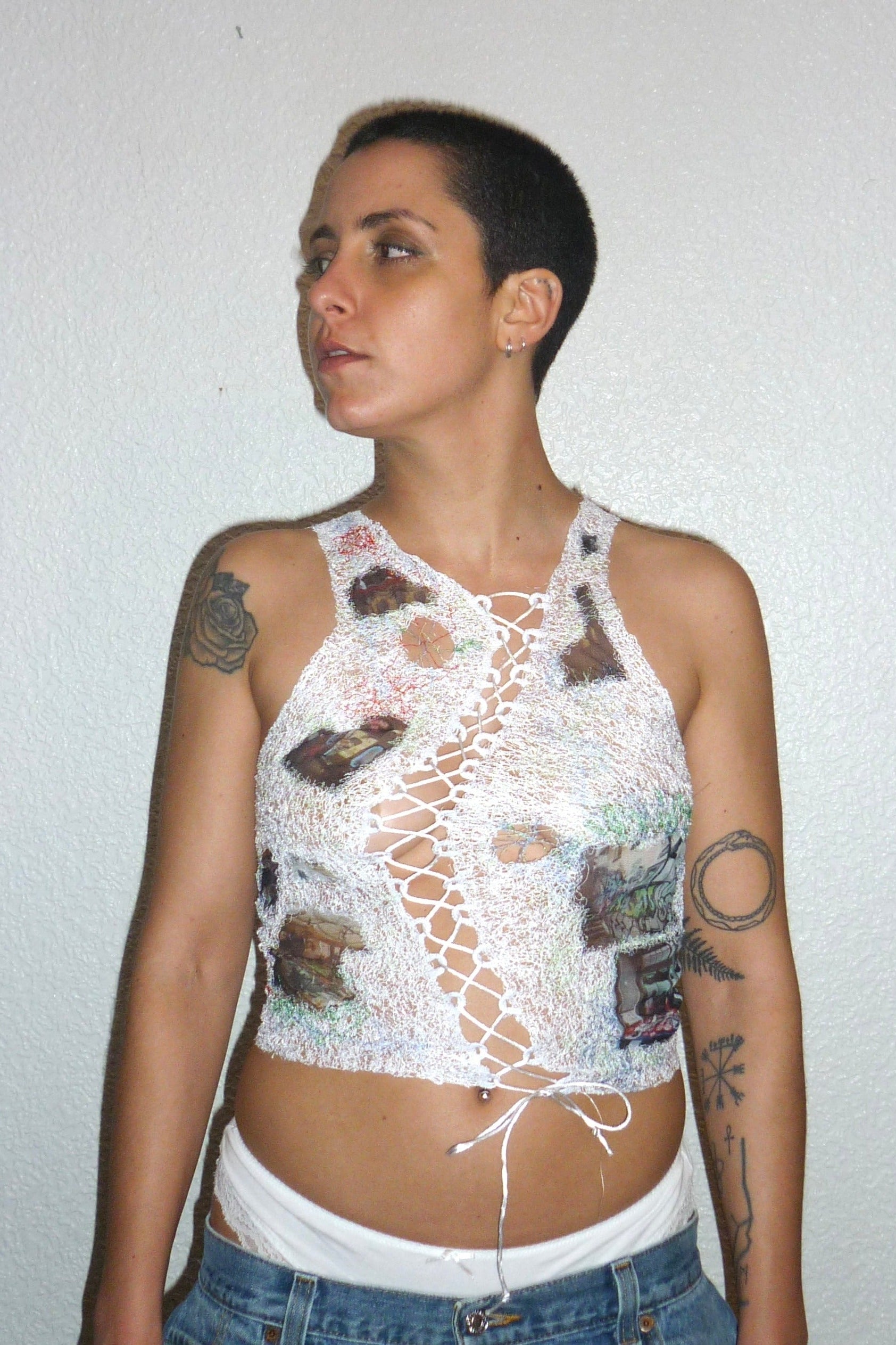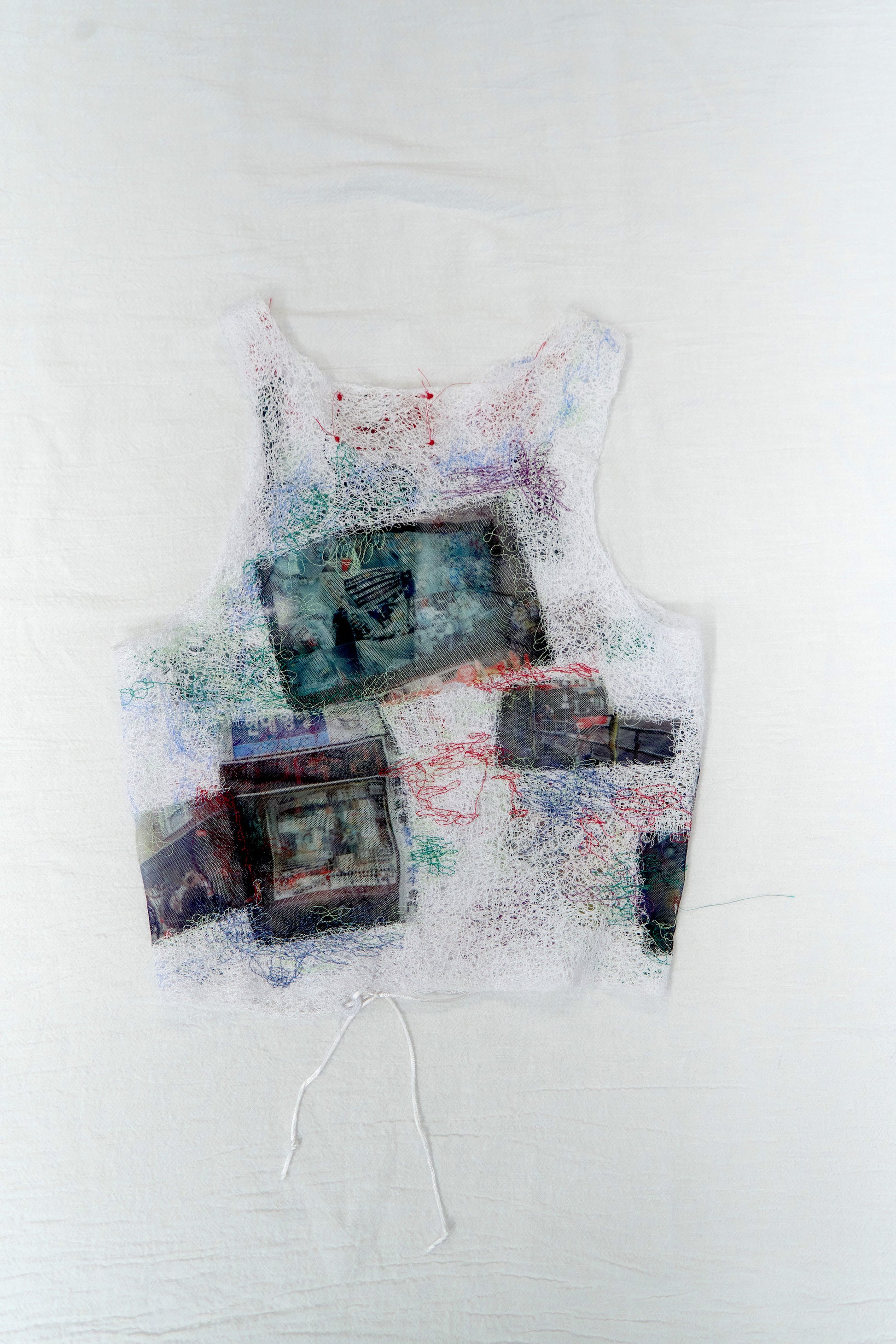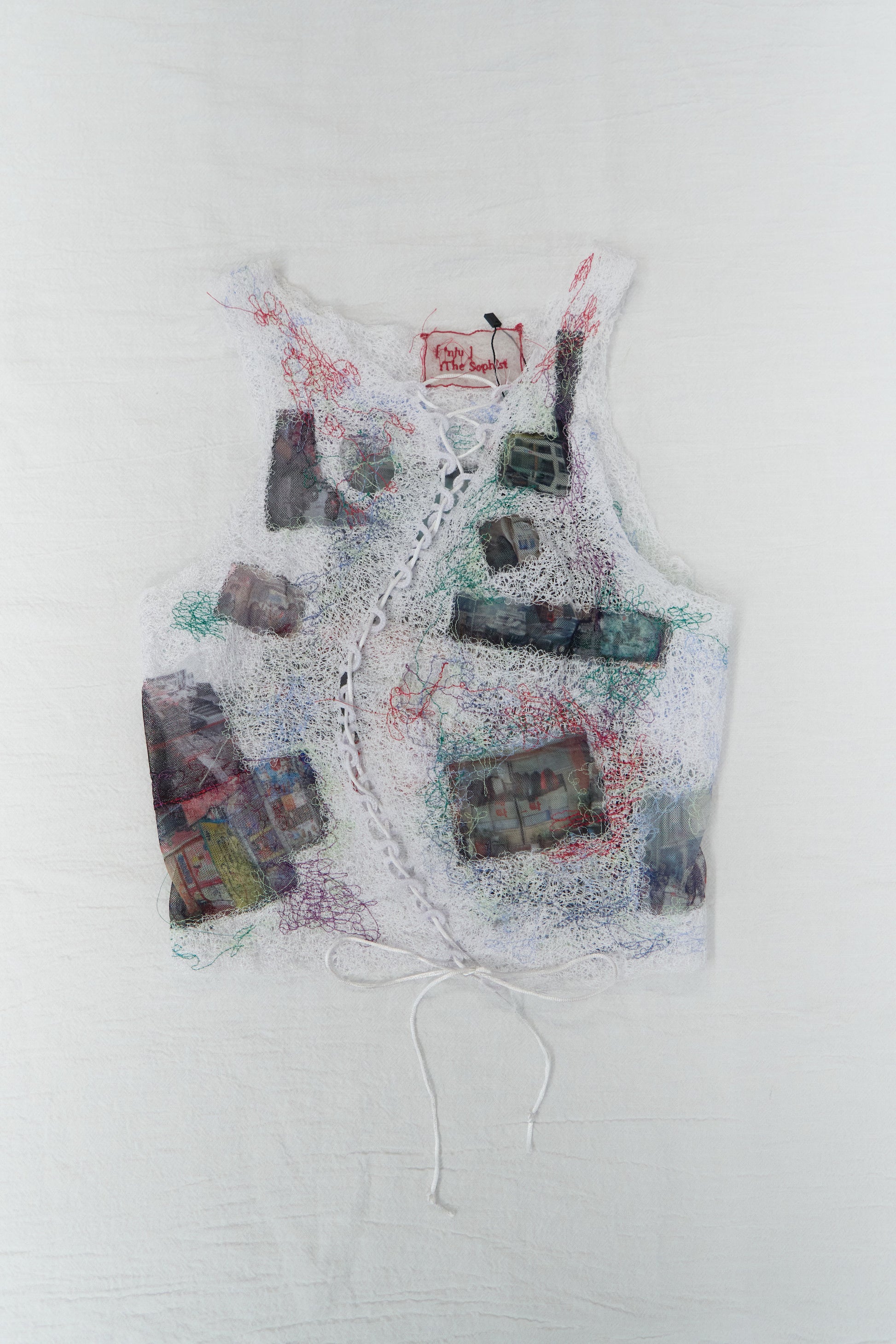 The Yang Vest Top is a zero-waste garment that reuses threads and other materials. The textile is meticulously handmade using a free-motion embroidery technique, making each piece one of a kind. Each garment takes approximately 40 hours to create, highlighting the dedication and time behind every stitch.
