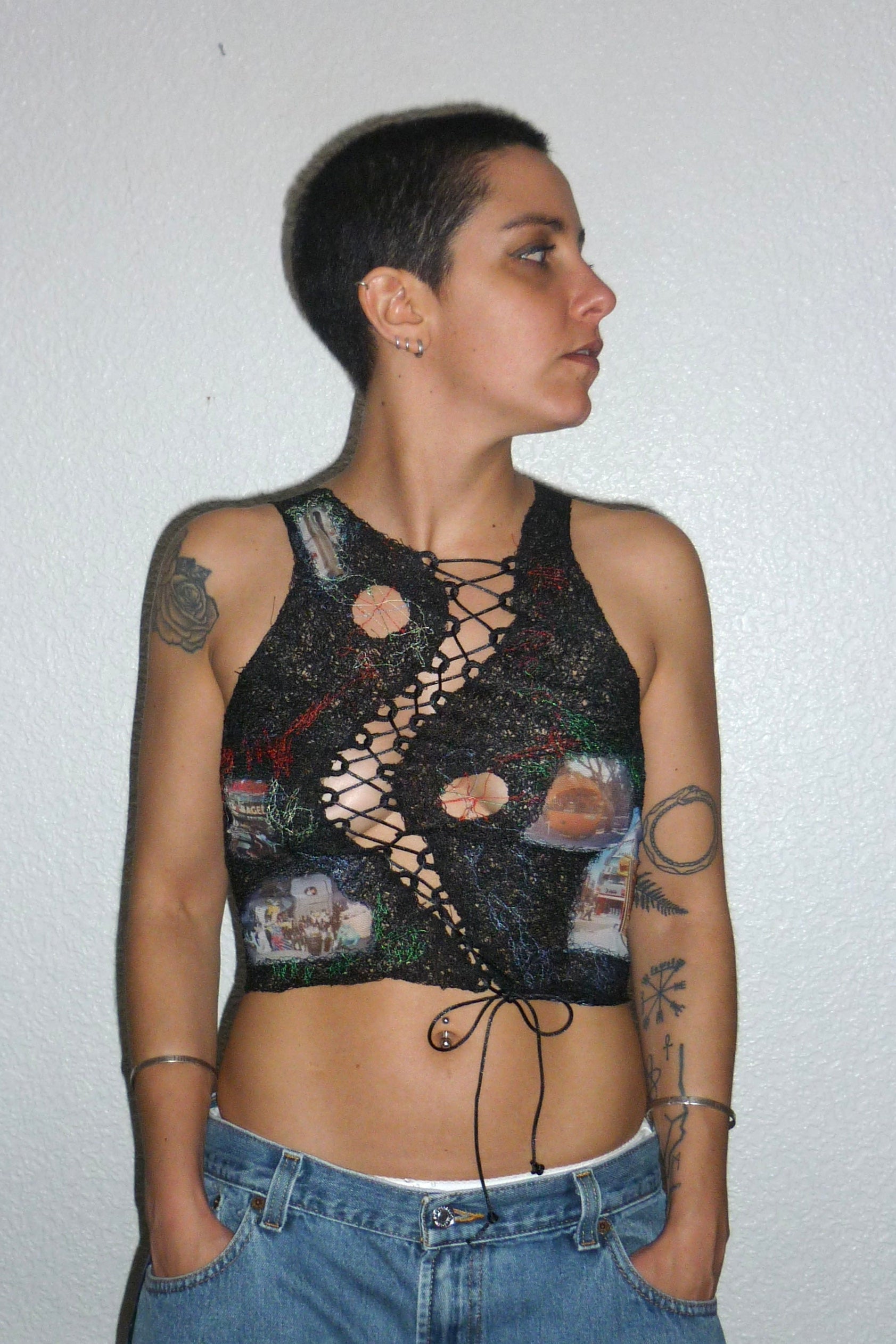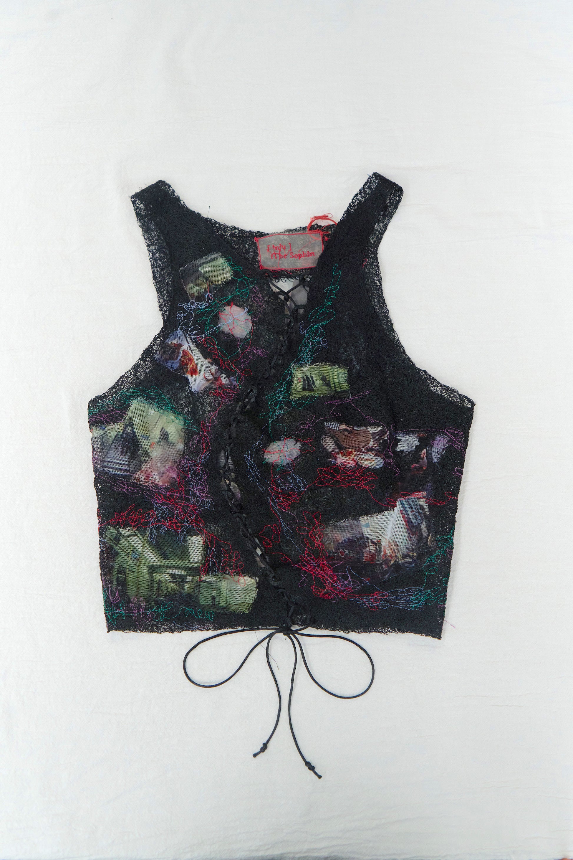 The Yang Vest Top is a zero-waste garment that reuses threads and other materials. The textile is meticulously handmade using a free-motion embroidery technique, making each piece one of a kind. Each garment takes approximately 40 hours to create, highlighting the dedication and time behind every stitch.