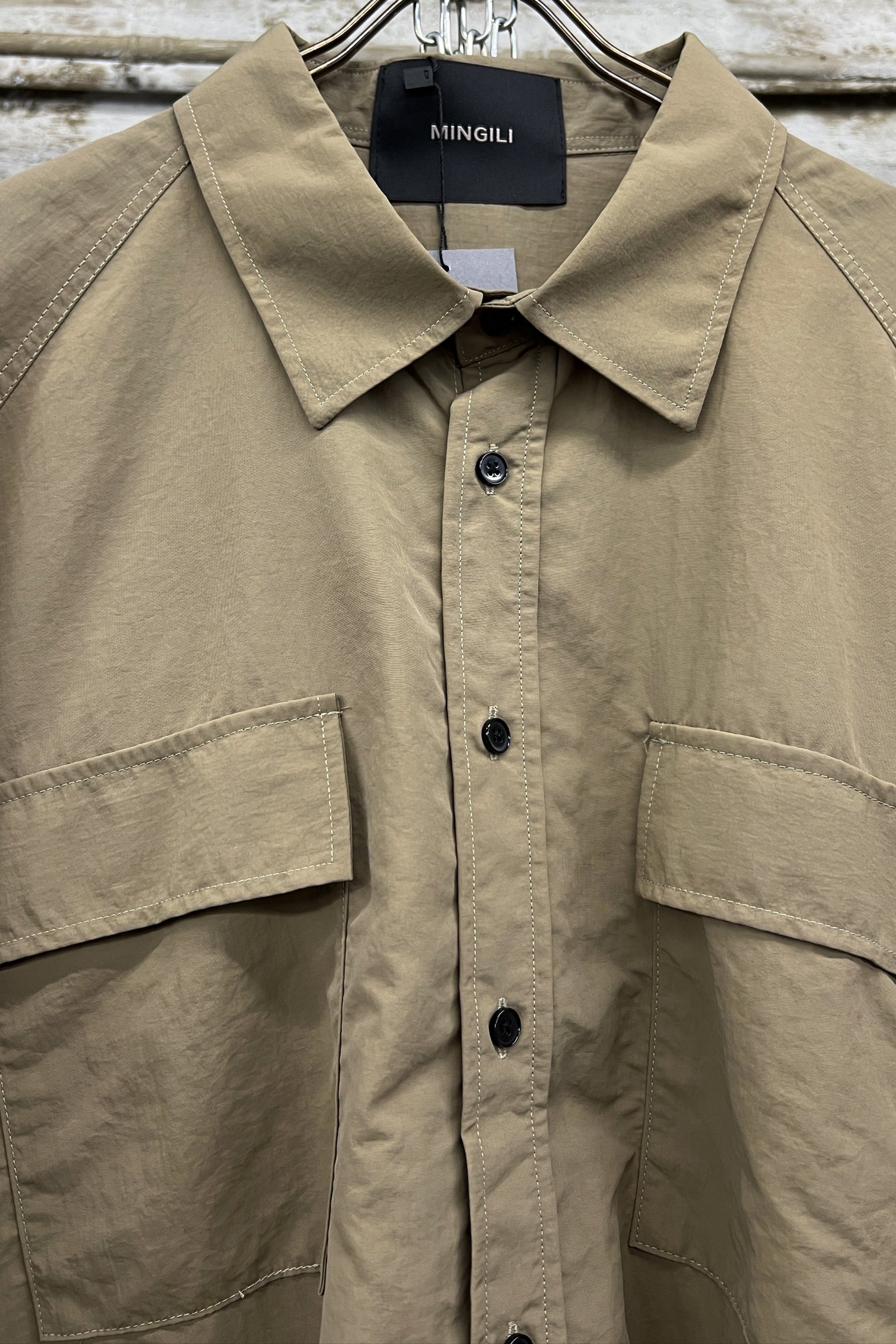 A refined utility shirt in lightweight nylon, rendered in a warm camel tone. The oversized silhouette drapes effortlessly, with a subtle technical sheen that bridges utilitarian function and modern minimalism.