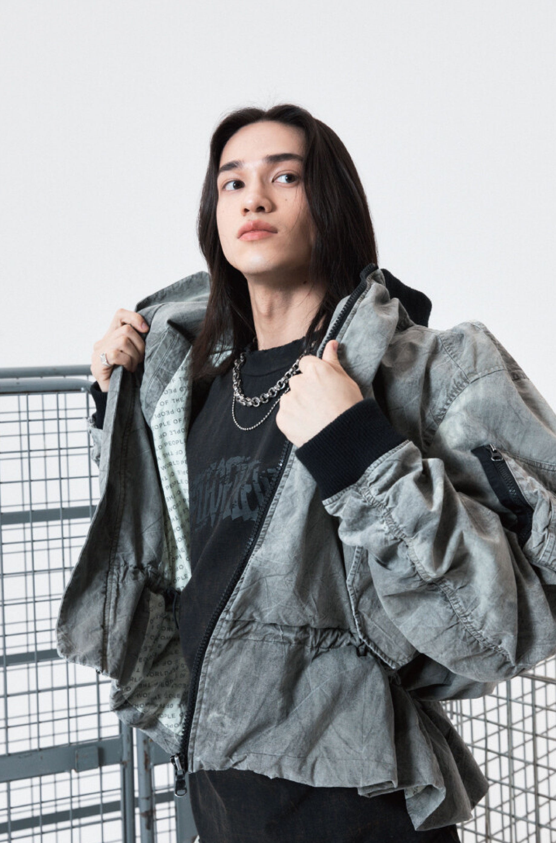 The tie-dye fabric is made of 100% cotton, providing excellent breathability and absorption. Firmly spun yarn on the neckline and sleeves prevents sagging. It features a two-way Bislon zipper. Practical and design details are incorporated into various pockets on the body and sleeves. The amount of shirring and wrinkles can be adjusted using the hem string and stopper, making it easy to style. The oversized fit resembles an MA-1 jumper. This unisex design is suitable for both men and women and can be worn in all seasons.