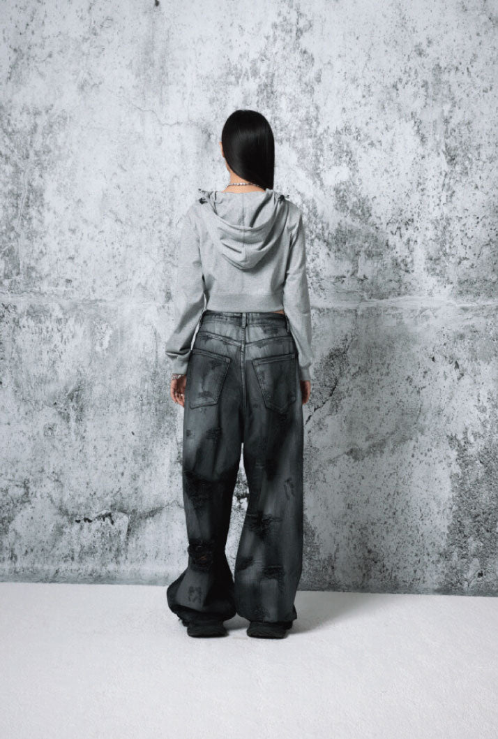 Cropped logo hoodie zip-up with a two-way zip, distressed edges, bold logo print, and a slim silhouette, perfect for all seasons.