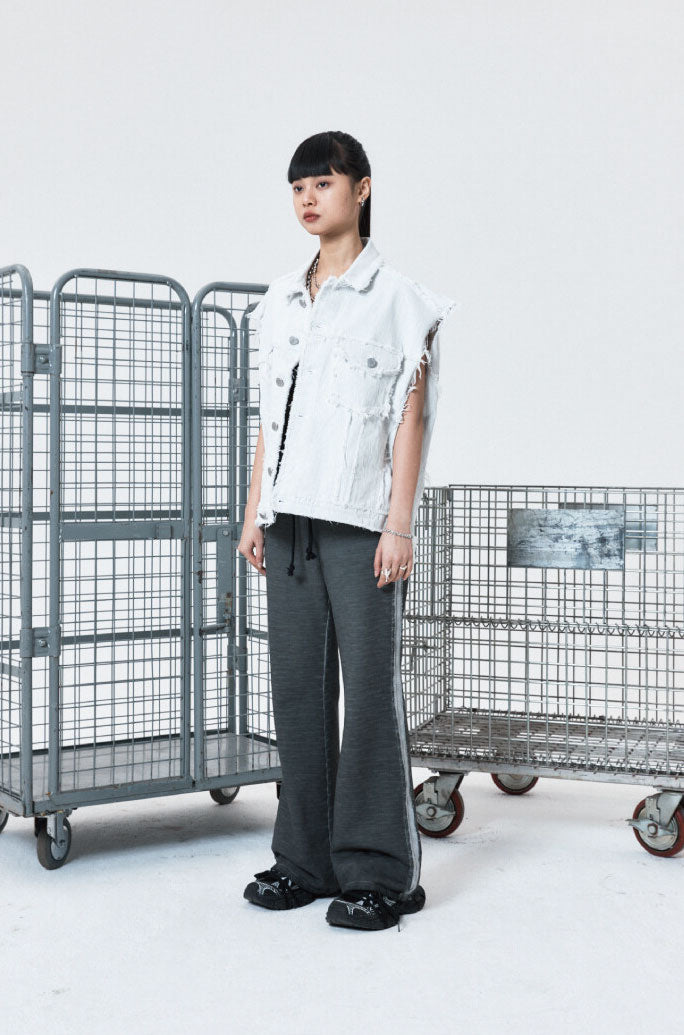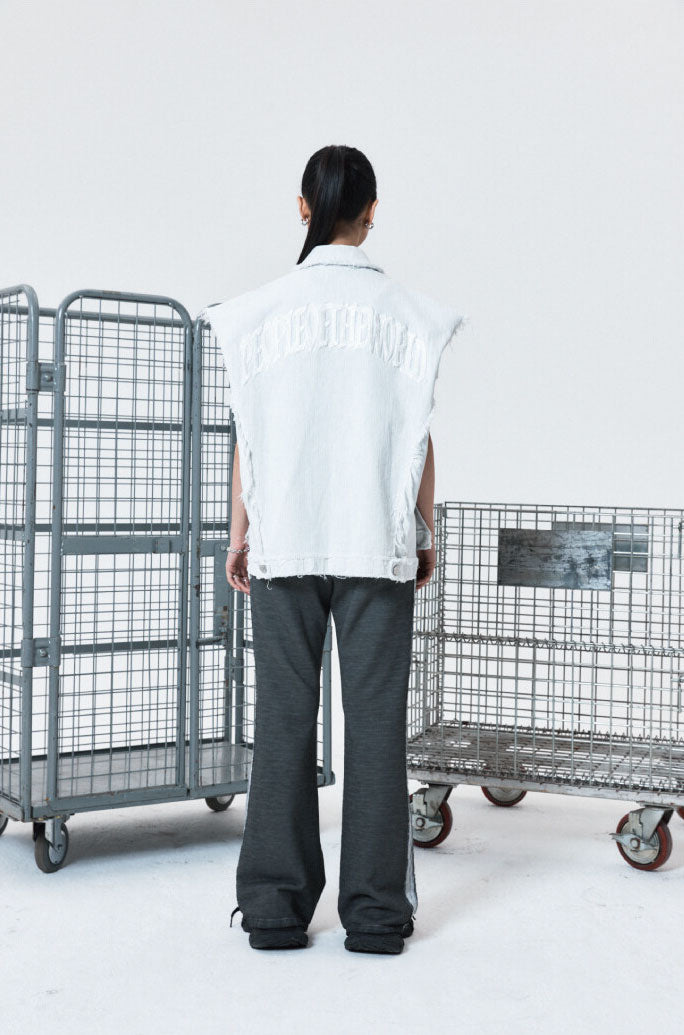 The denim fabric, with its distinctive herringbone texture, showcases an oversized fit and includes front and back seam details. It incorporates functional design elements such as front seam out-pocket detailing and features the "People of the World" logo, highlighted with rubber embroidery. Stone-washing enhances its vintage color scheme, and the garment's unfinished seam edges throughout create a casual yet vintage look.