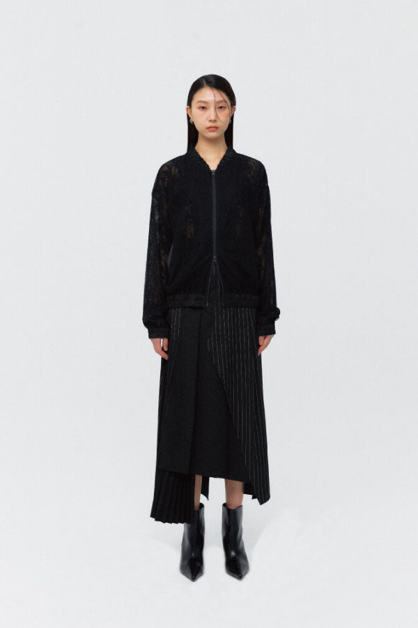 Delicate lace jumper mixing two lace fabrics for a breathable, non-restrictive fit. Satin shirring and banding at the neckline, cuffs, and hem add a feminine touch. Features a YKK two-way zip and signature artwork label in a semi-oversized blouson style.