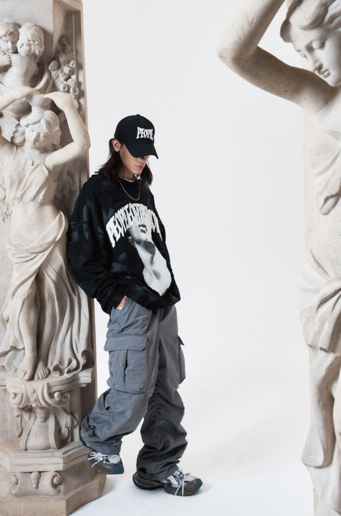 Full waistband treatment, cargo pockets with inserted cotton for emphasis, adjustable bottom drawstrings and stoppers, side line shirring detail, wide silhouette with a straight fit, unisex line suitable for year-round wear.