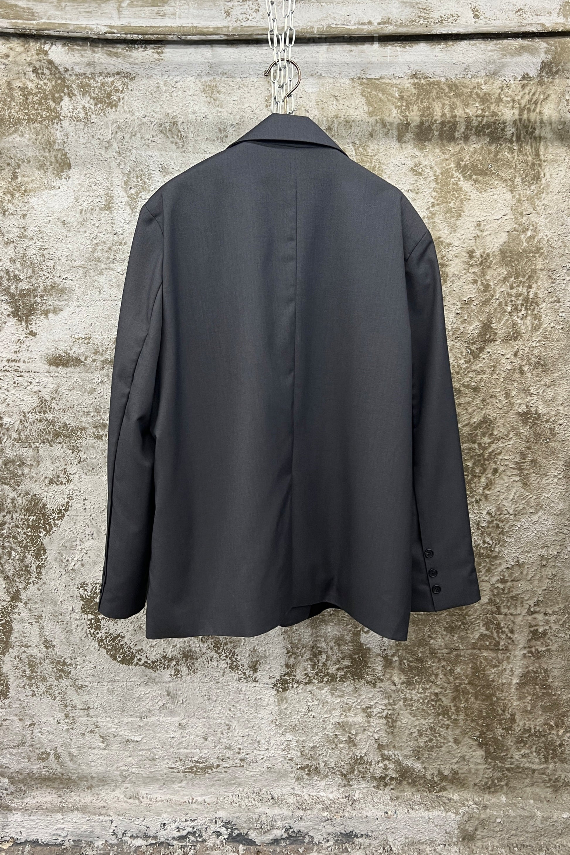 The relaxed, slightly boxy fit softens the classic blazer silhouette, while the two-button closure and clean welt pockets keep the design minimal. A curved front hem adds a quiet sense of movement.
