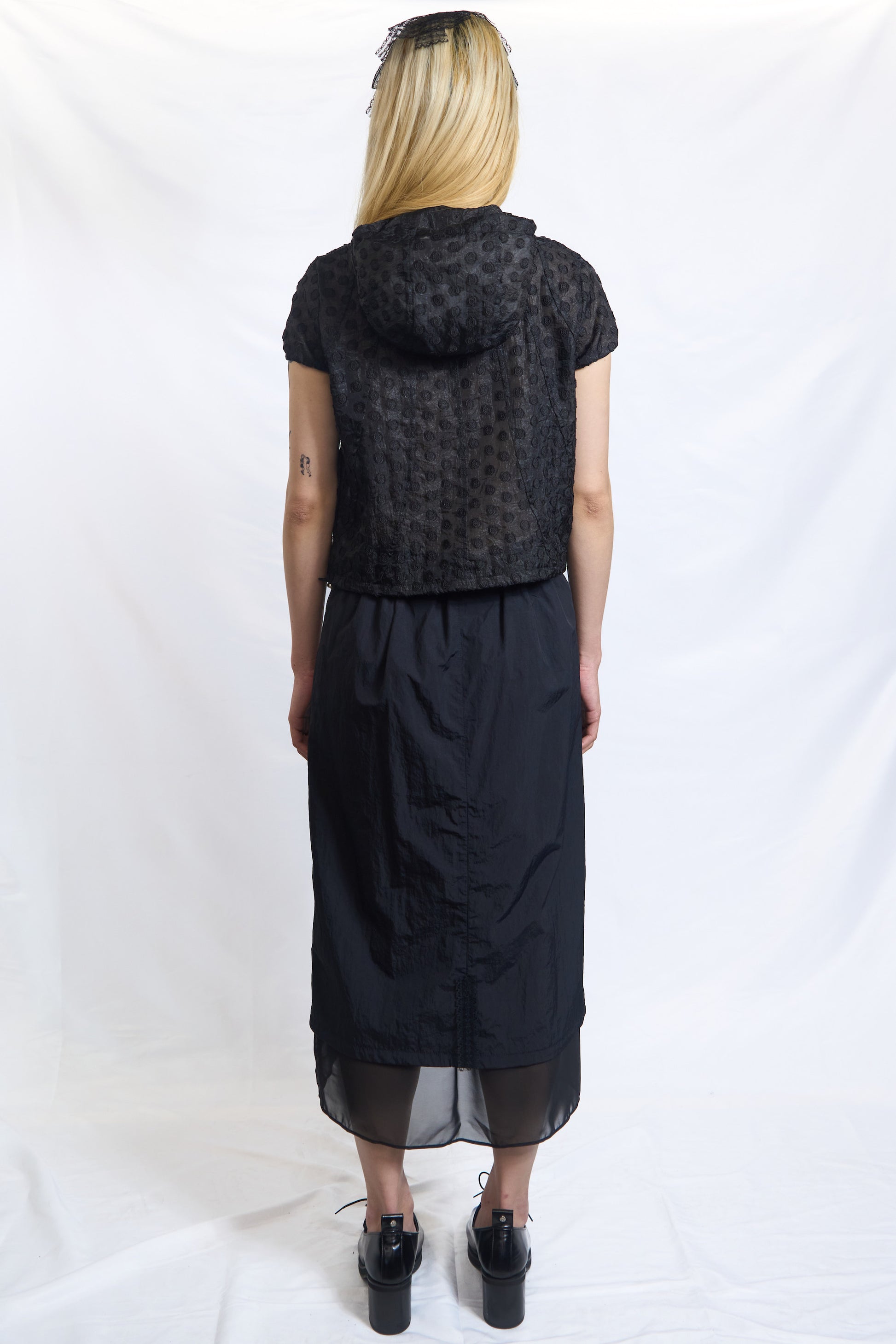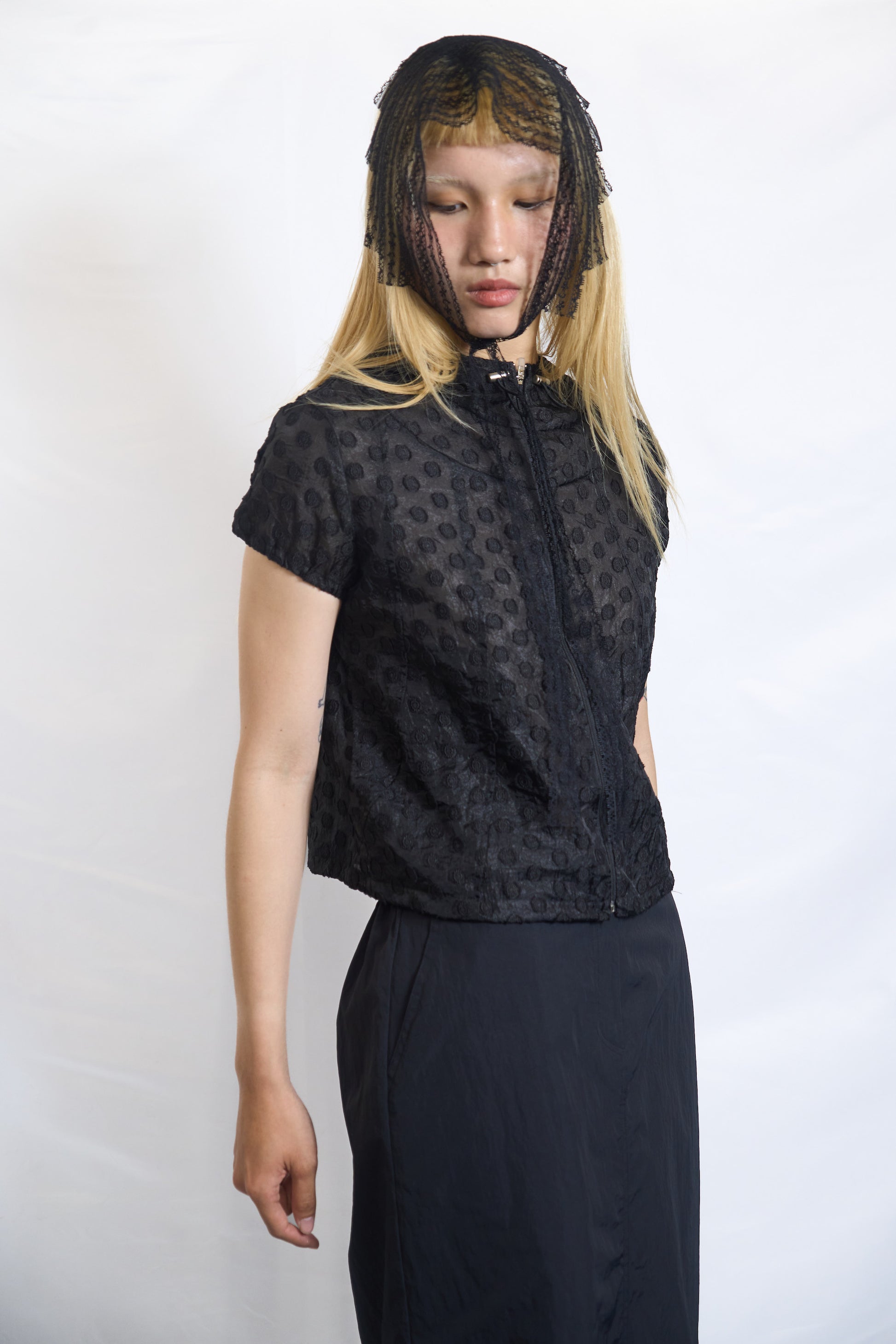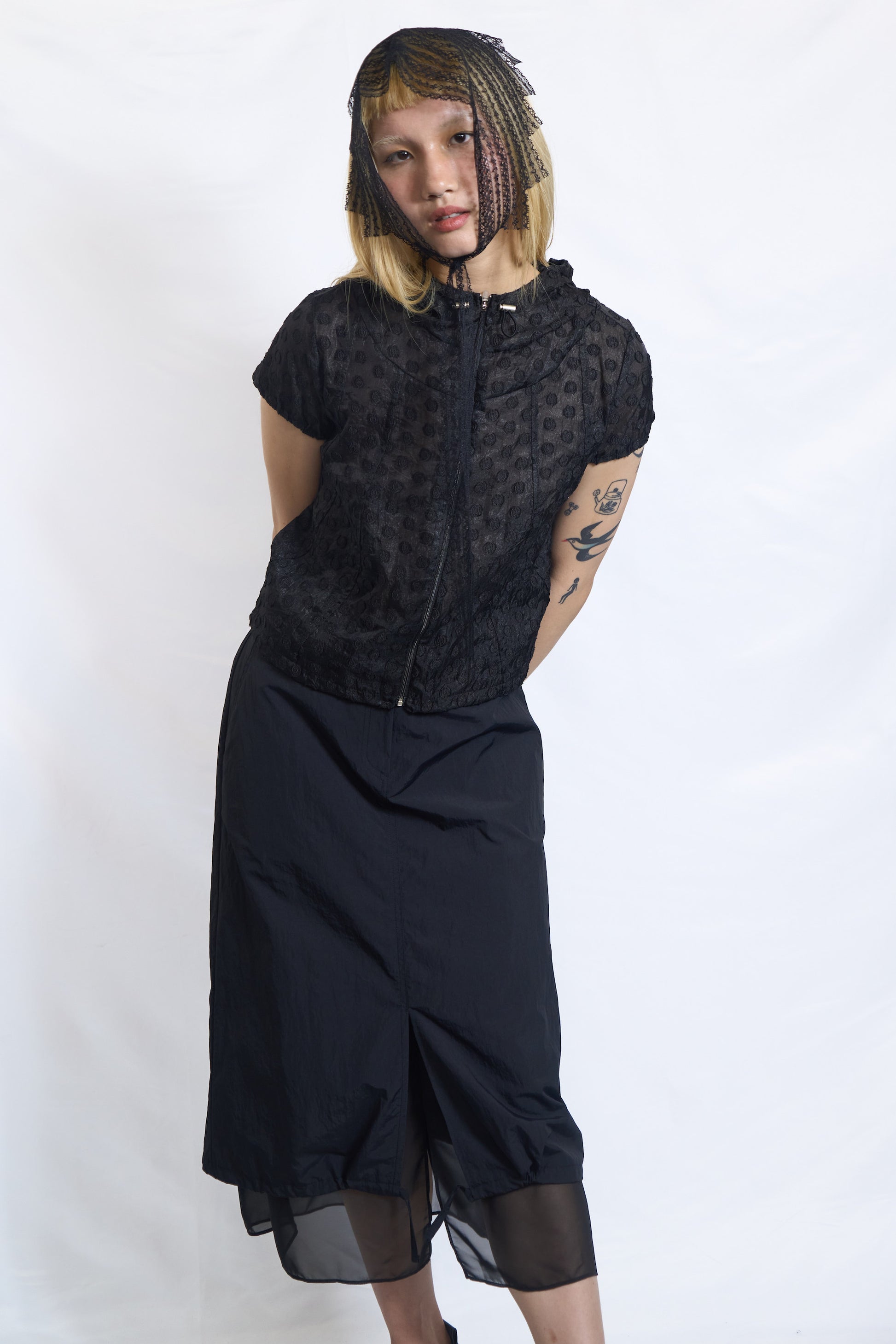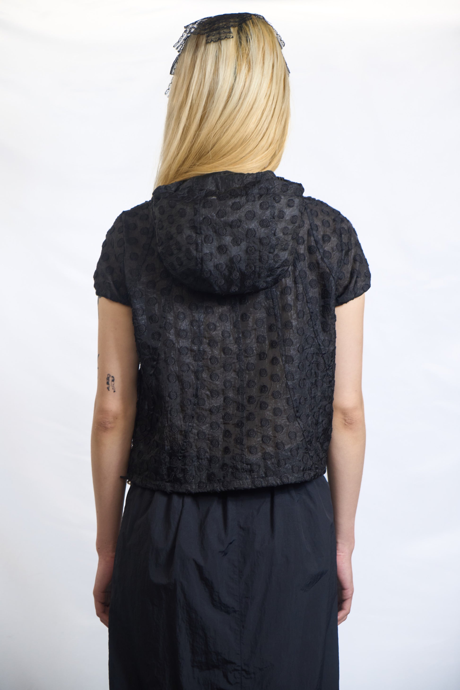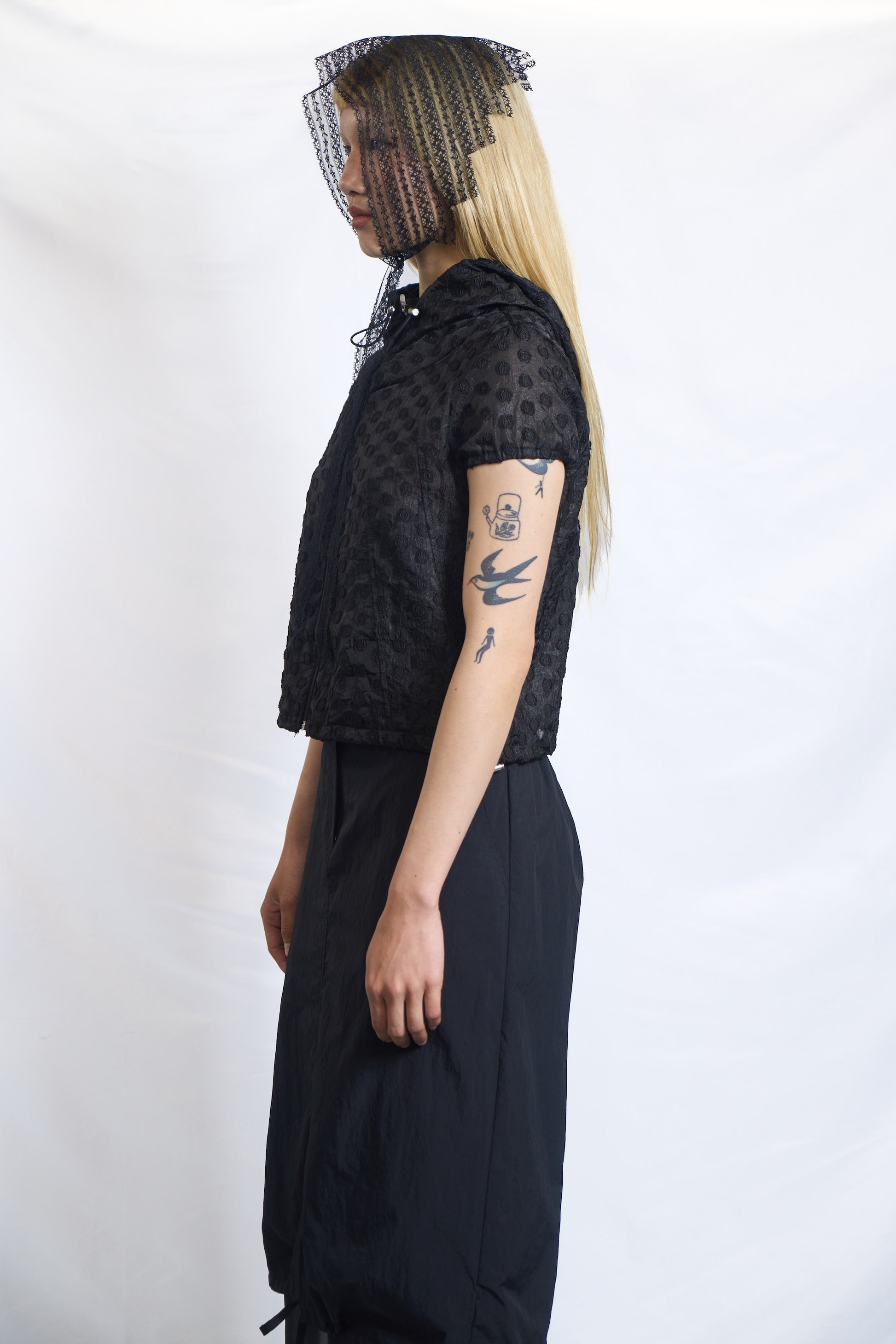 A lightweight layer defined by texture. This cropped zip-up is crafted from crisp fabric with a raised dot finish — a subtle yet playful surface detail that adds dimension to its clean silhouette. With short sleeves and a hood, it’s made for layering without weight, balancing sporty structure with tactile charm.
