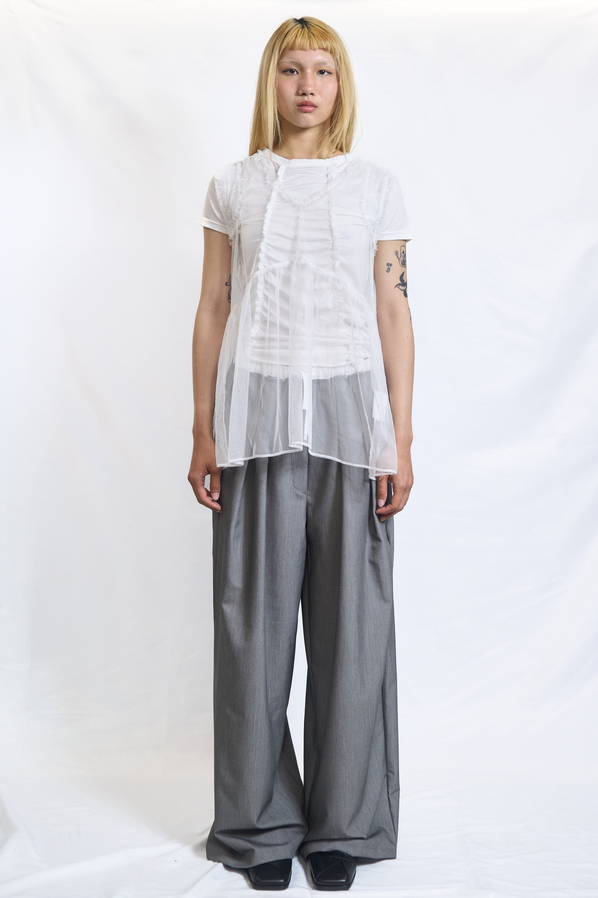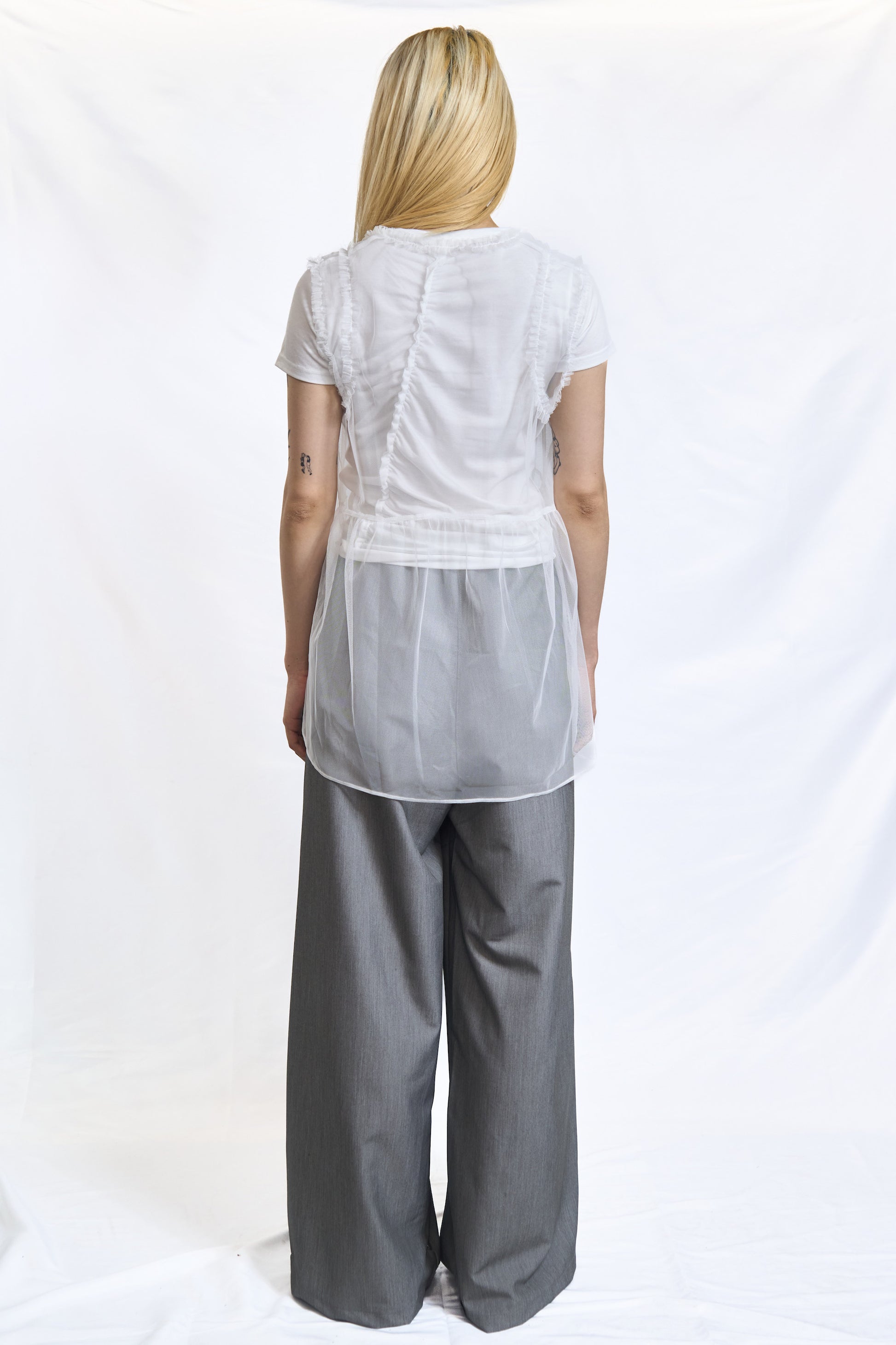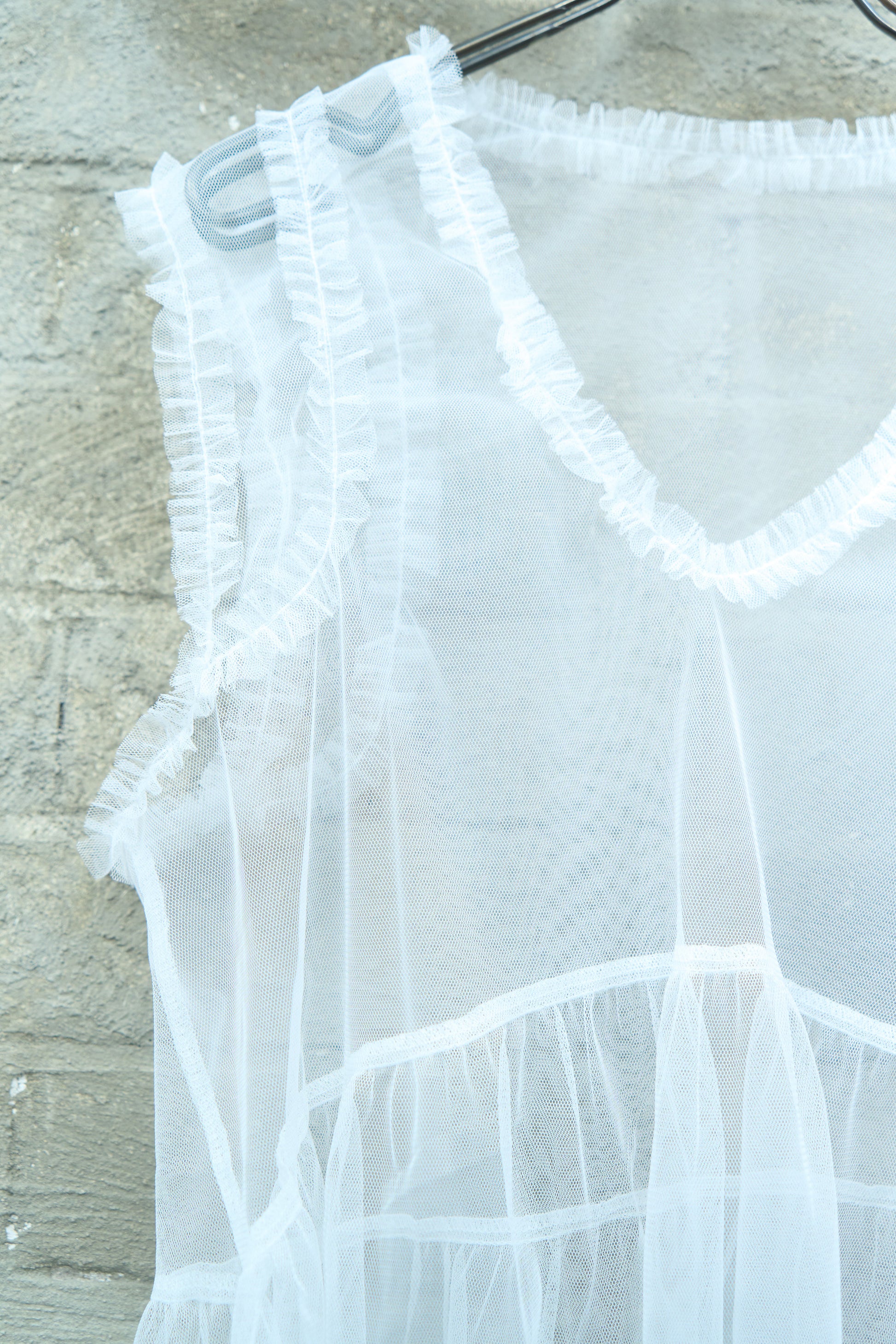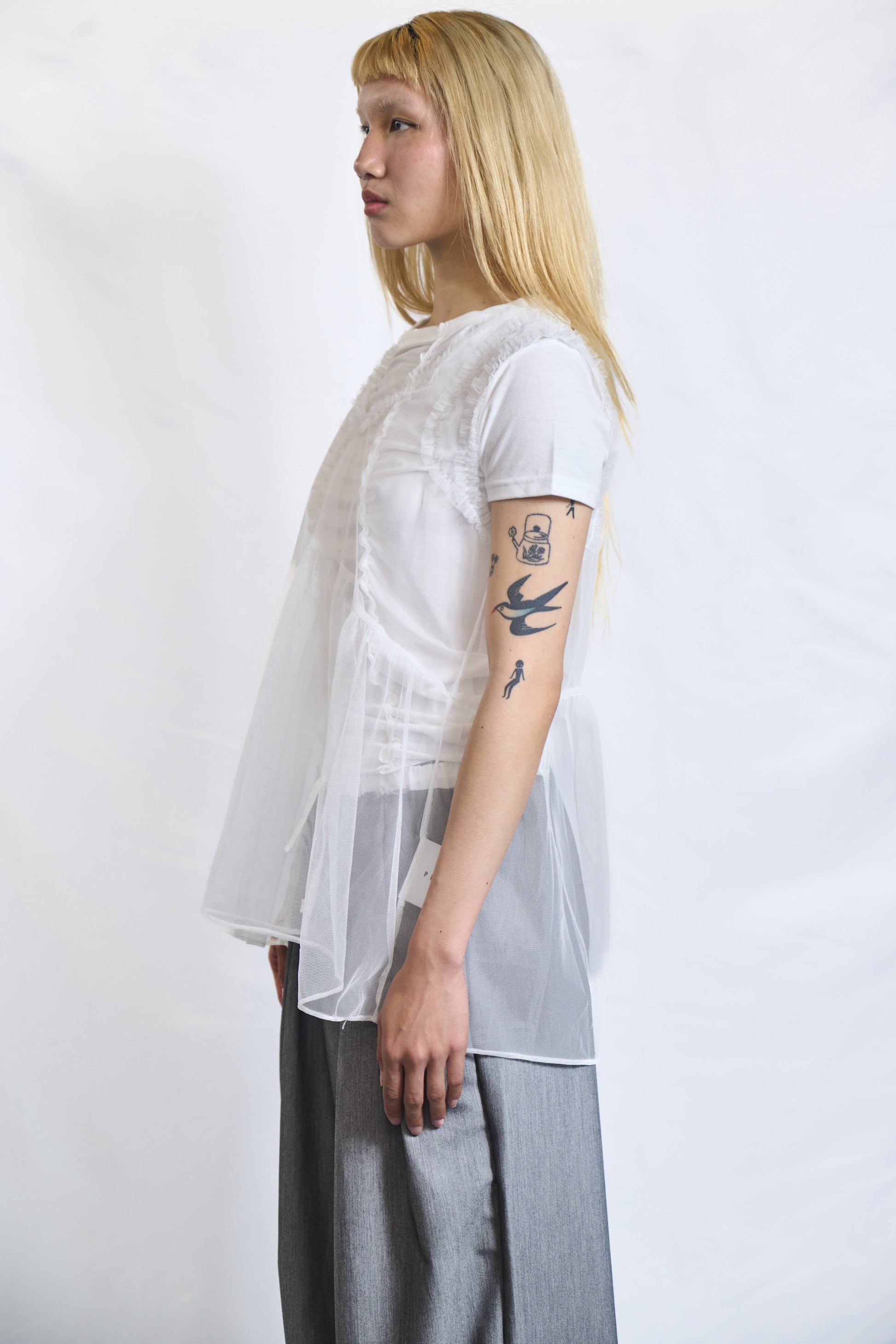 Weightless and romantic. This sheer tunic is cut from delicate, lightweight fabric with soft frill accents at the shoulders and waist. Layer it over structured pieces for a contrast of textures or wear it alone for a dreamy, ethereal look.
