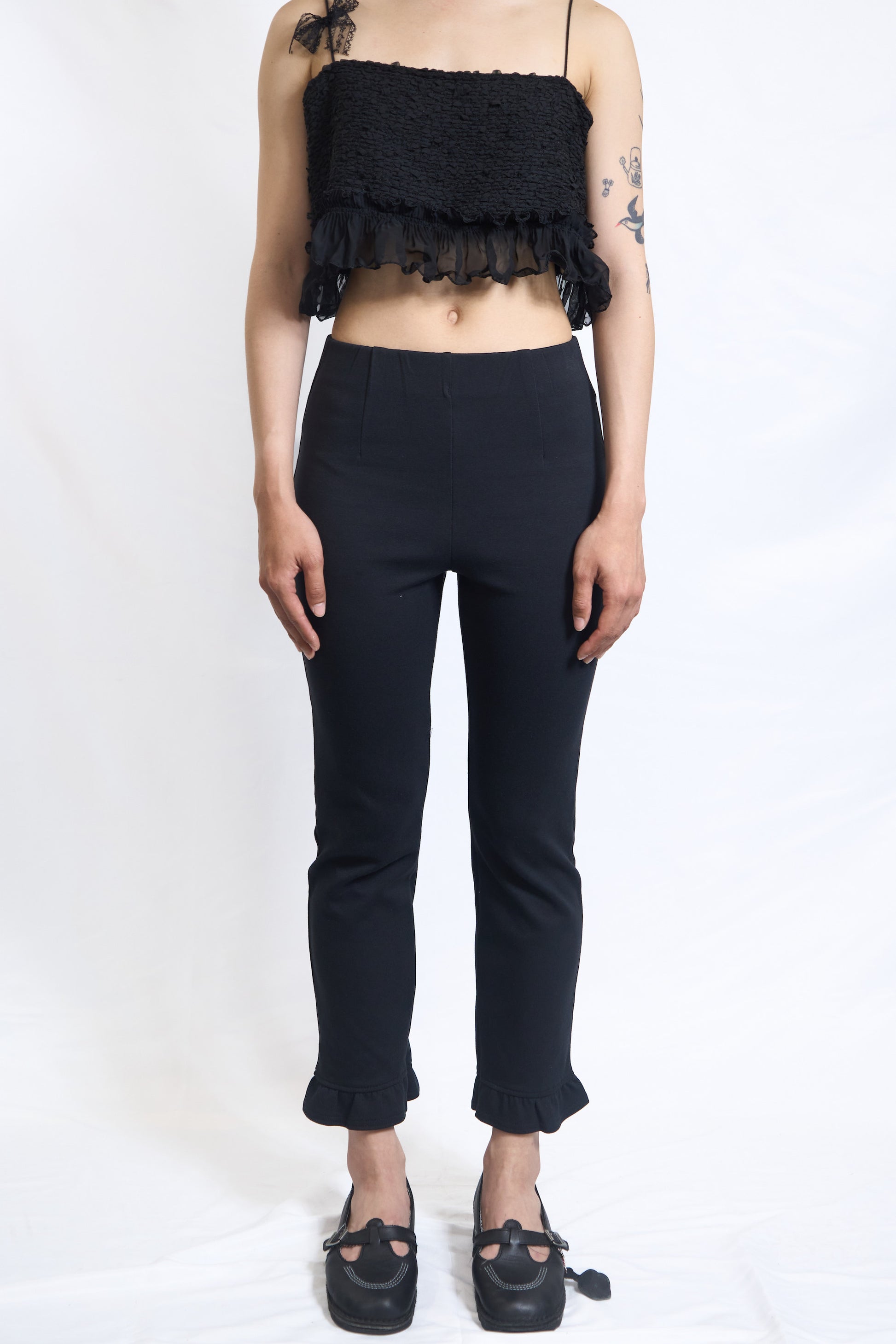 A clean silhouette with a playful finish. These high-rise slim pants hug the waist and fall straight to the ankle, where a subtle ruffle adds a soft, unexpected touch. Quietly charming, they’re made to pair with delicate tops or structured layers alike.