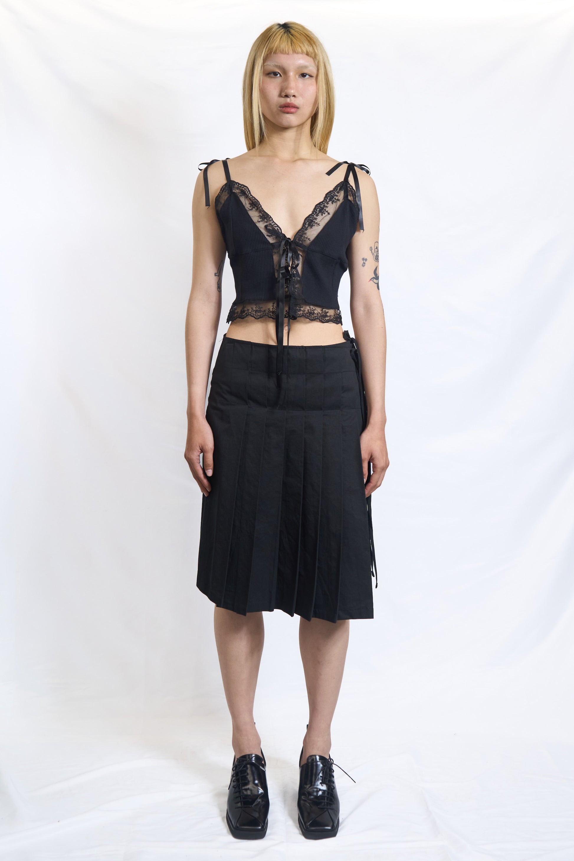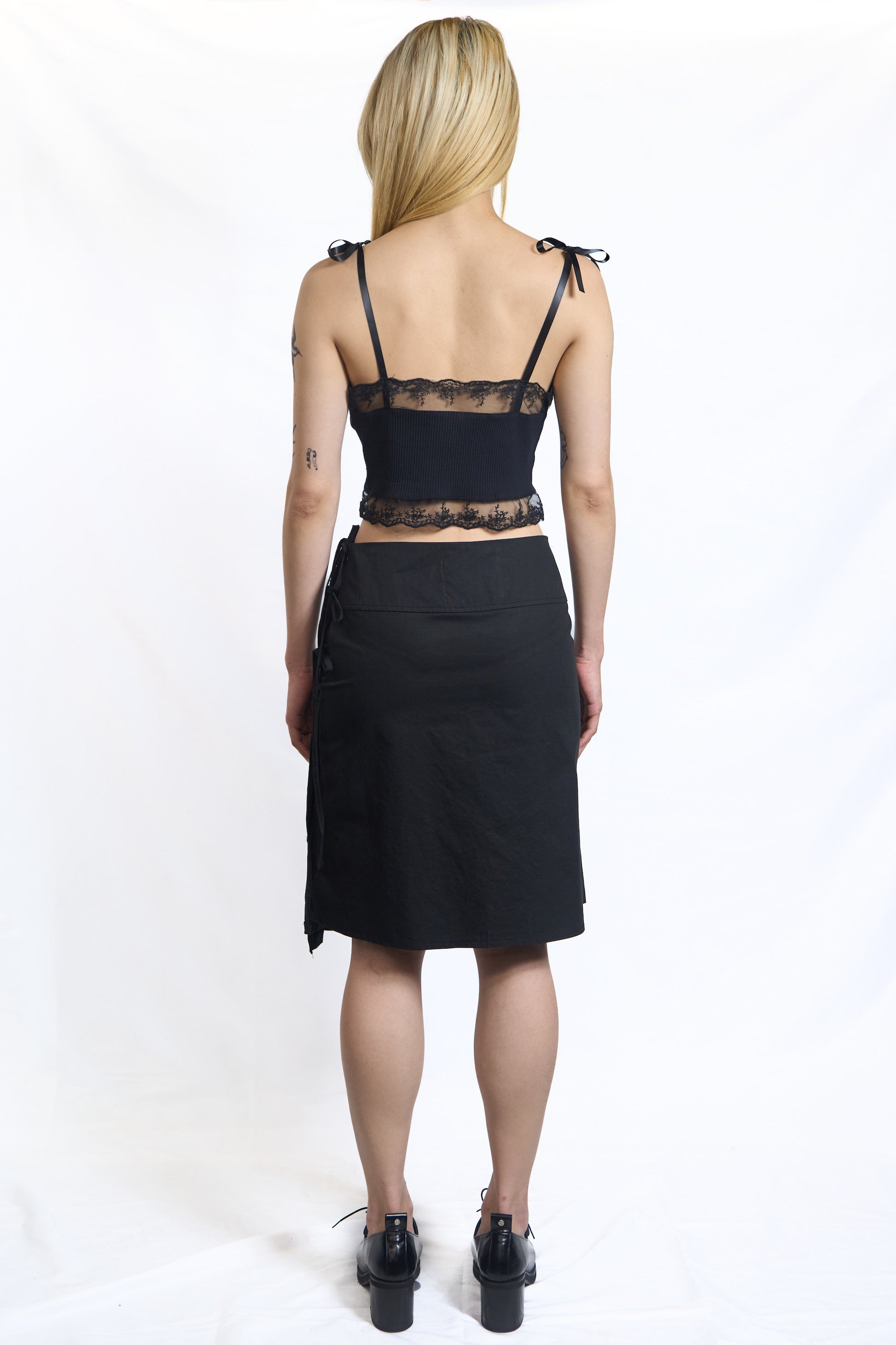 Crafted from ribbed cotton with sheer lace panels at the neckline and hem, this piece features a plunging V front with adjustable ribbon ties. Slim satin shoulder straps add a feminine finish, while the overall silhouette gently hugs the form without clinging. A balance of romantic and bold — easy to layer or wear as is.