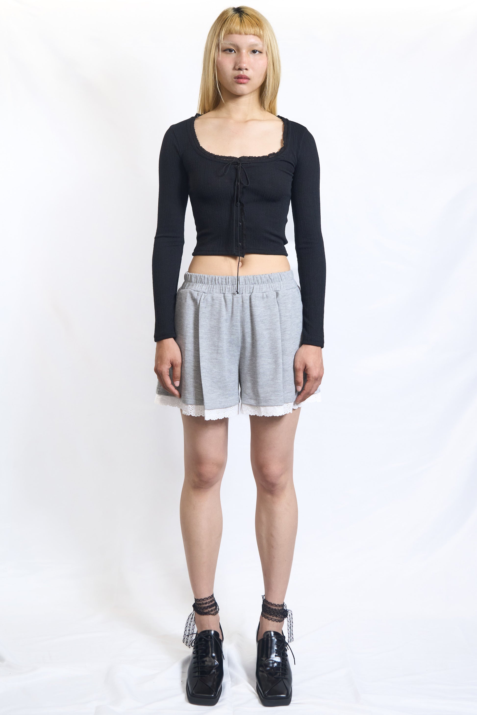 Soft structure meets delicate detail. This ribbed long-sleeve crop top features a softly scooped neckline framed with fine lace trim and a front tie detail that gently accentuates the center. Form-fitting and slightly stretchy, it's an easy go-to for layering or wearing on its own with high-rise bottoms.