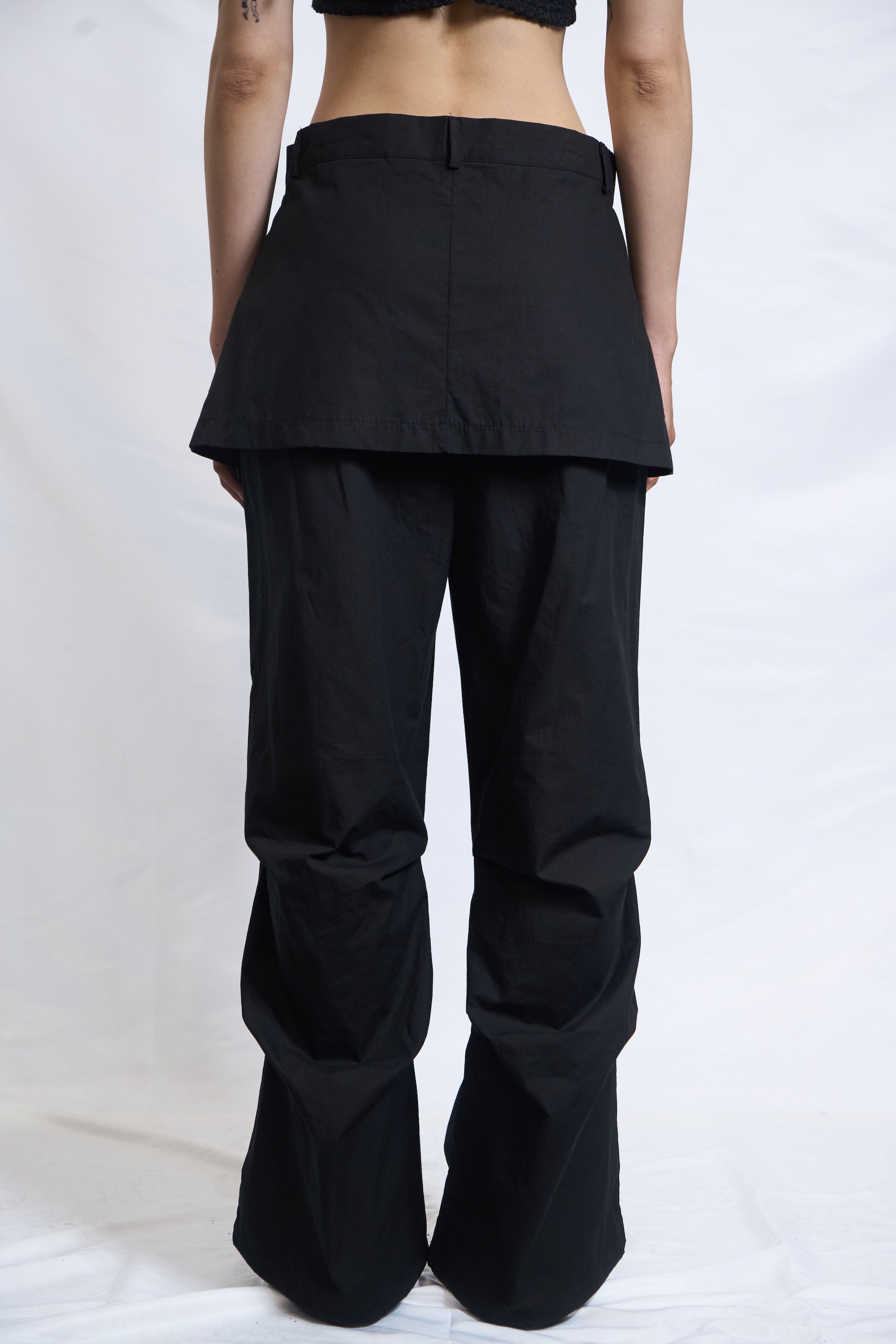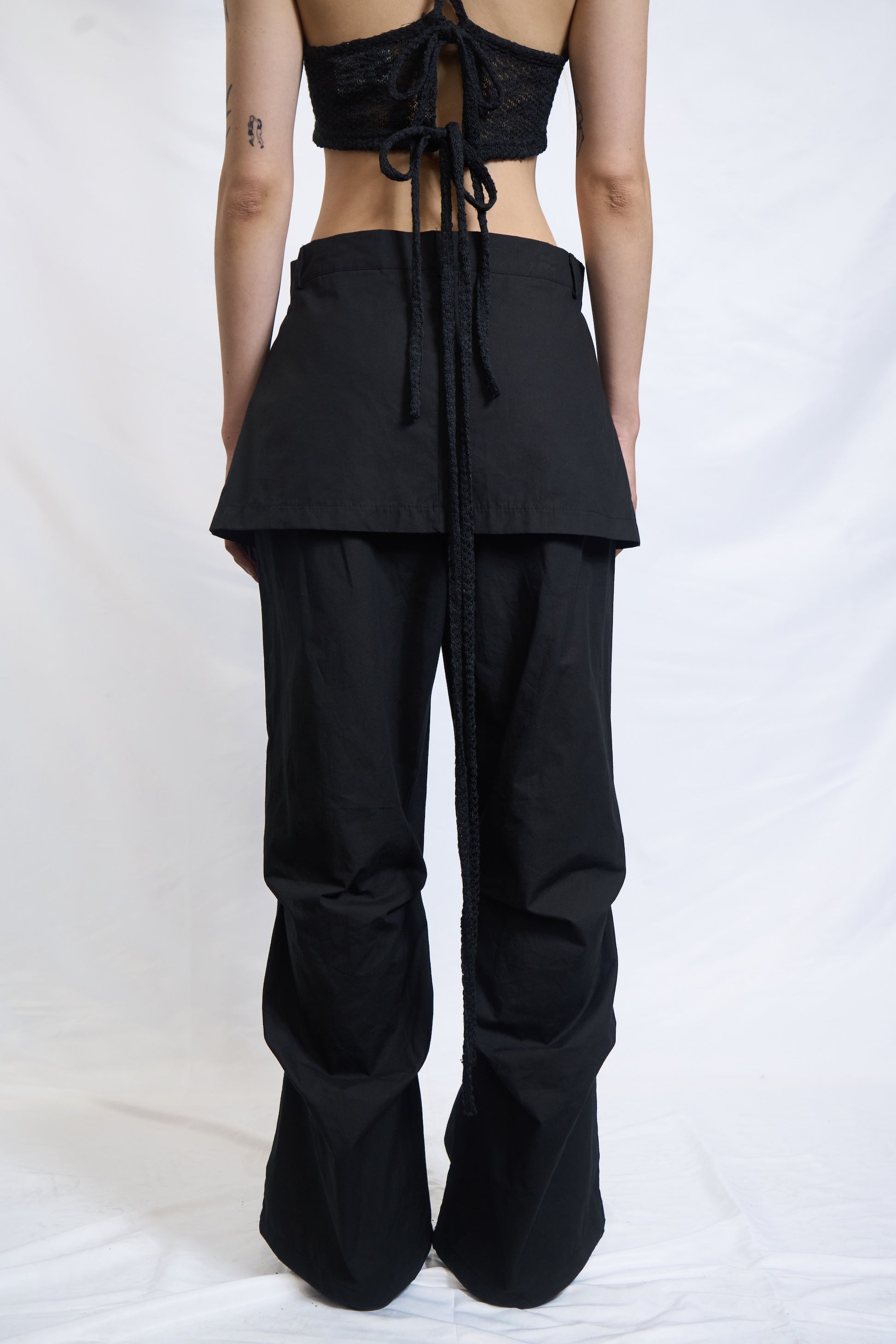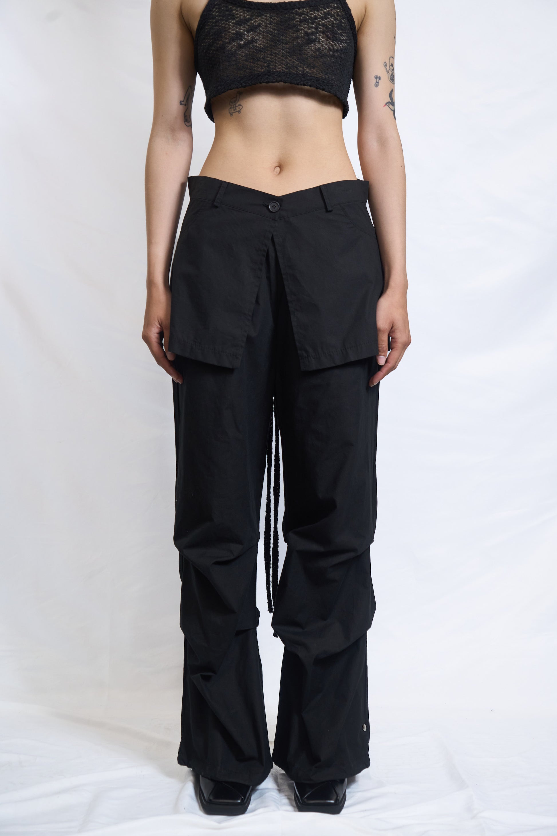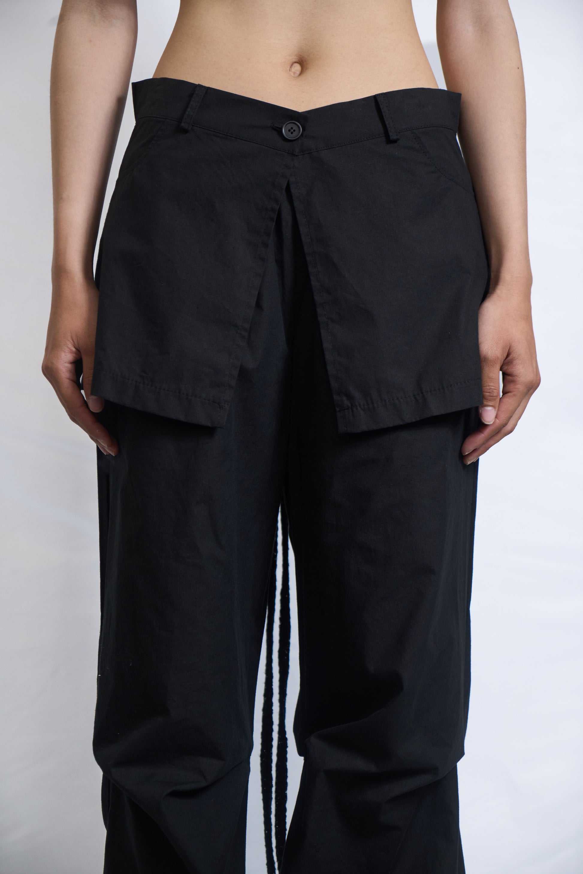 A reimagined classic with sculptural detail. These mid-rise pants feature a detachable front panel that wraps around to form an extended back flap — offering a layered look with architectural appeal. The panel can also be removed and styled as a top, allowing playful transformation depending on your mood. The relaxed fit is enhanced with gathered seams at the legs, adding volume and movement to the silhouette. tops or structured layers alike.
