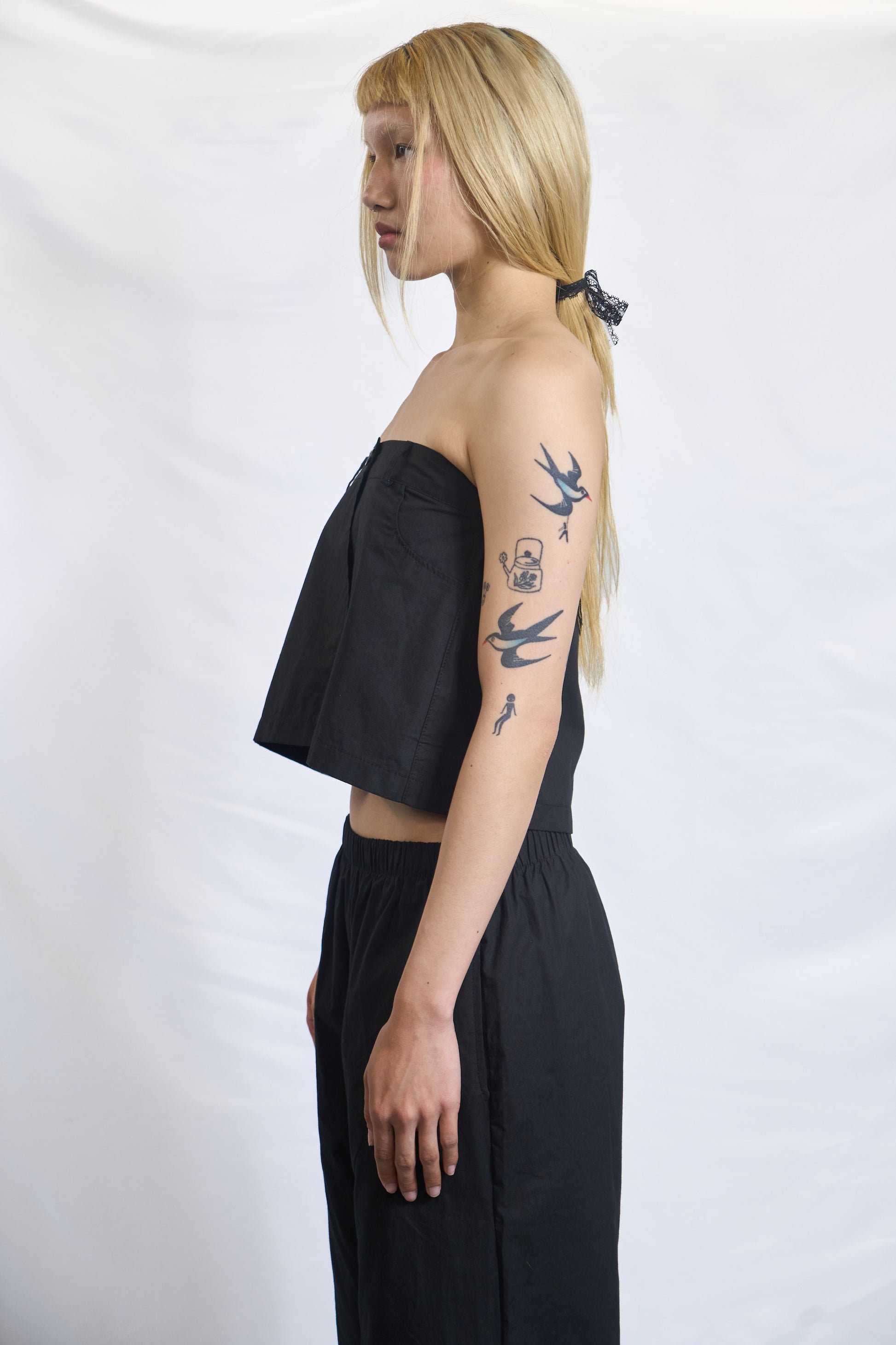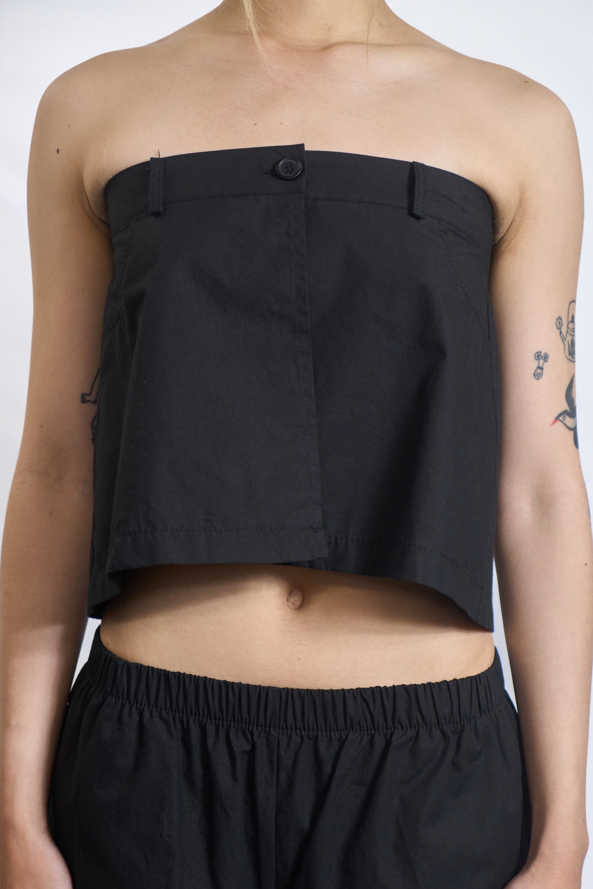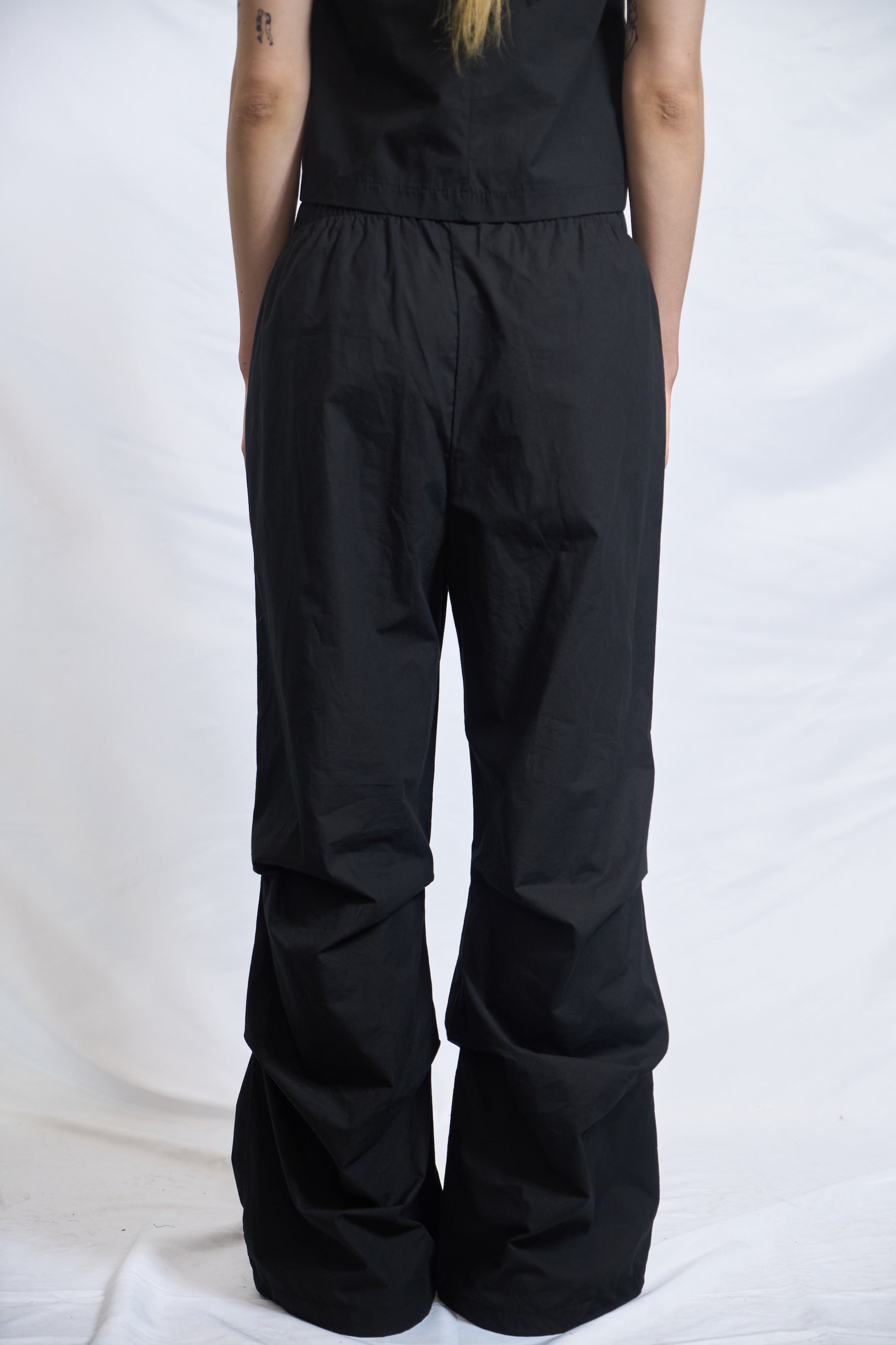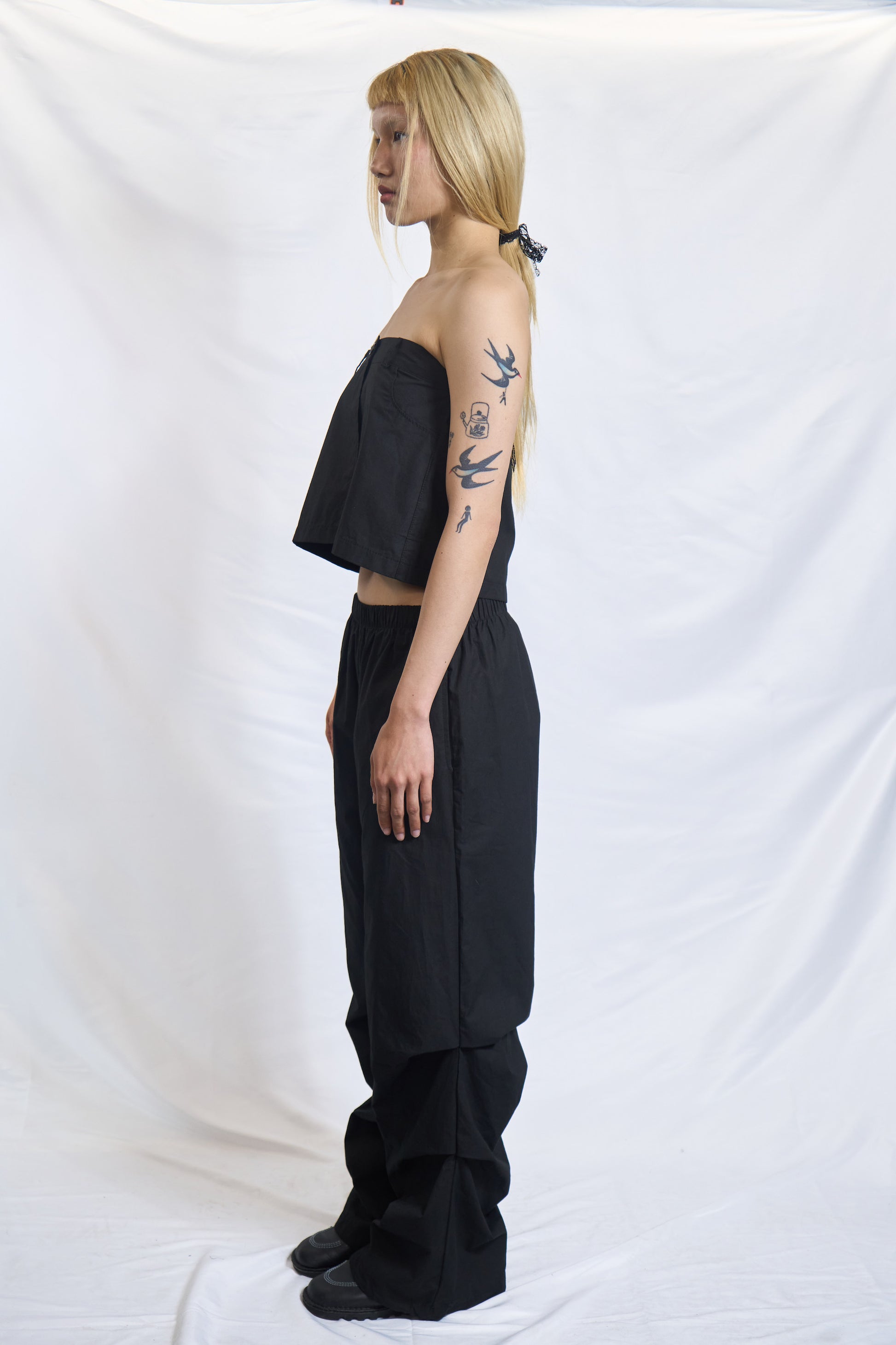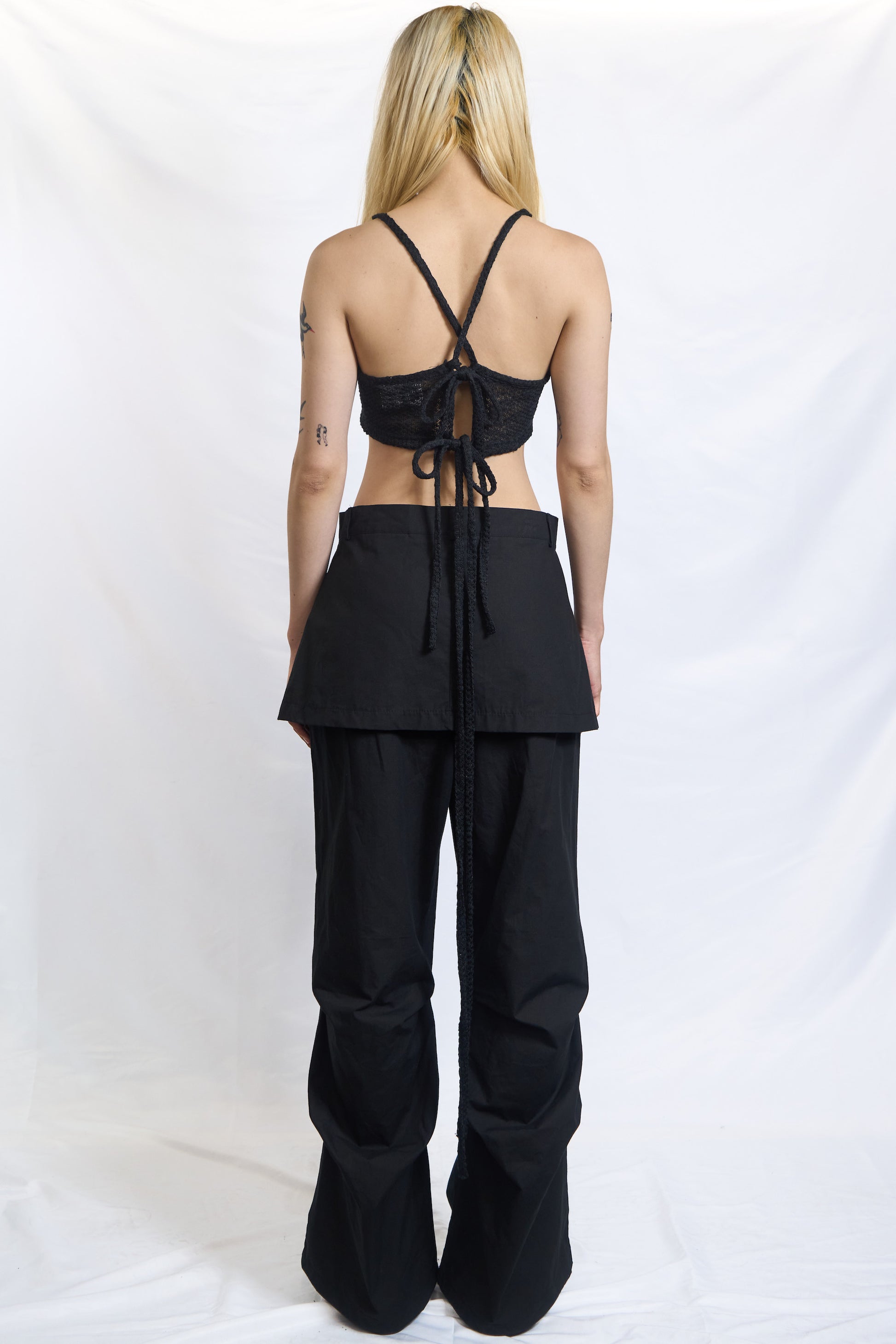 A reimagined classic with sculptural detail. These mid-rise pants feature a detachable front panel that wraps around to form an extended back flap — offering a layered look with architectural appeal. The panel can also be removed and styled as a top, allowing playful transformation depending on your mood. The relaxed fit is enhanced with gathered seams at the legs, adding volume and movement to the silhouette. tops or structured layers alike.